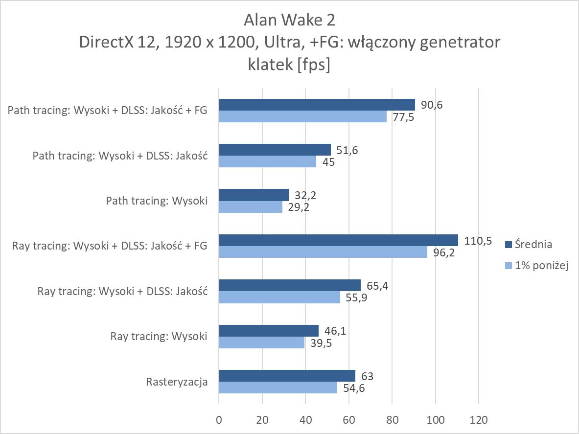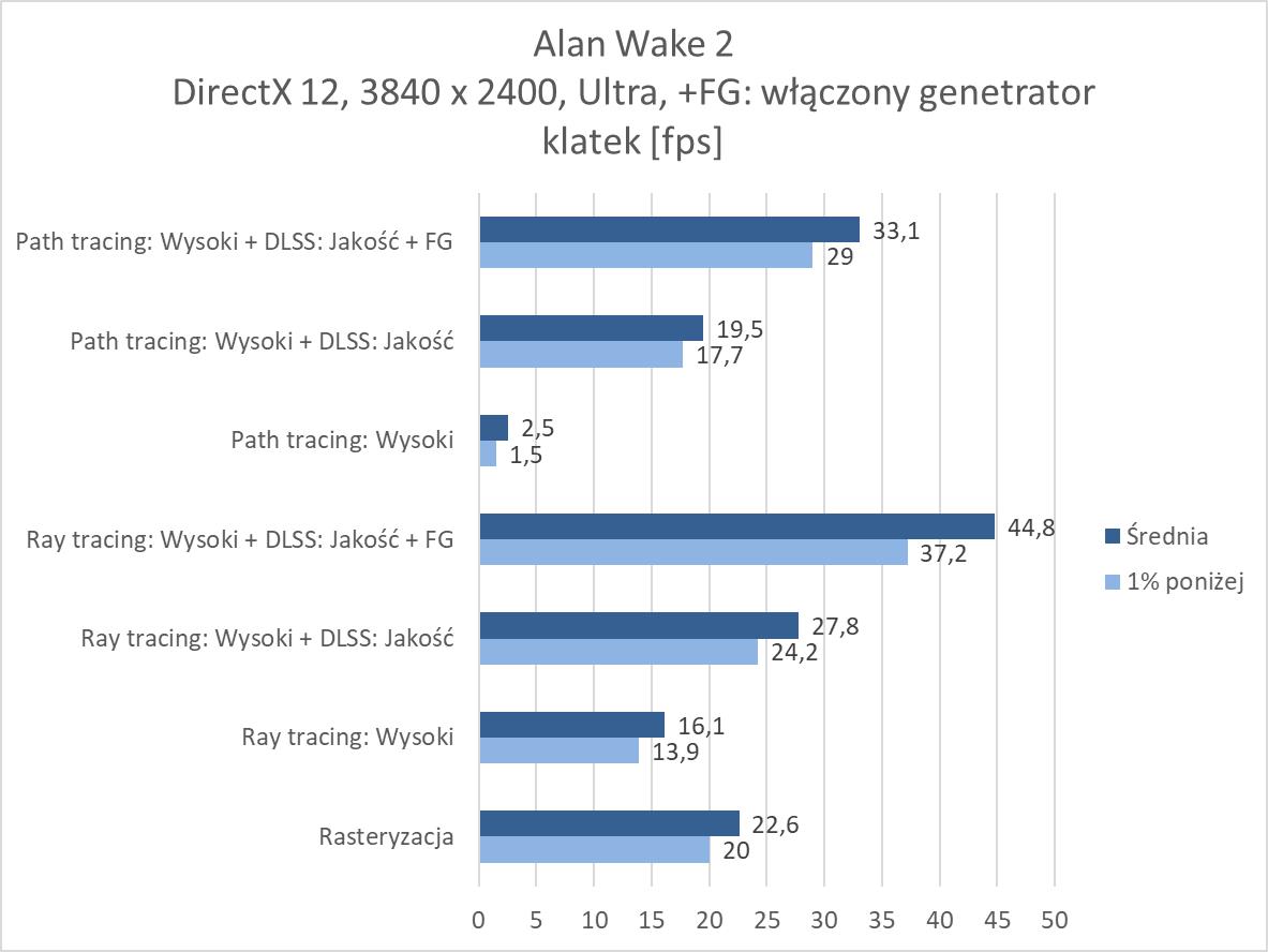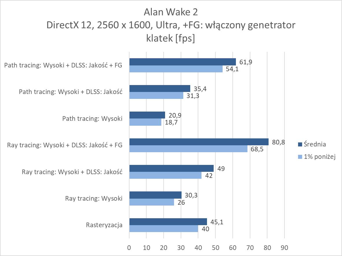 W kolejnej rozdzielczości w rasteryzacji jest jedna gra bez średnio 60 fps – Alan Wake 2. Natomiast wyniki w pozostałych tytułach nadal są bardzo dobre. Przy ray tracingu nigdzie nie mamy średnio tej ilości fps, ale DLSS: Jakość zapewnia płynną rozgrywkę. Wyjątkiem jest ponownie Alan Wake, gdzie przyda się inne ustawienie DLSS lub włączenie generatora klatek. Path tracing to bardzo niskie wyniki, choć włączenie DLSS: Jakość i generatora klatek w obu tytułach zapewnia płynną rozgrywkę.