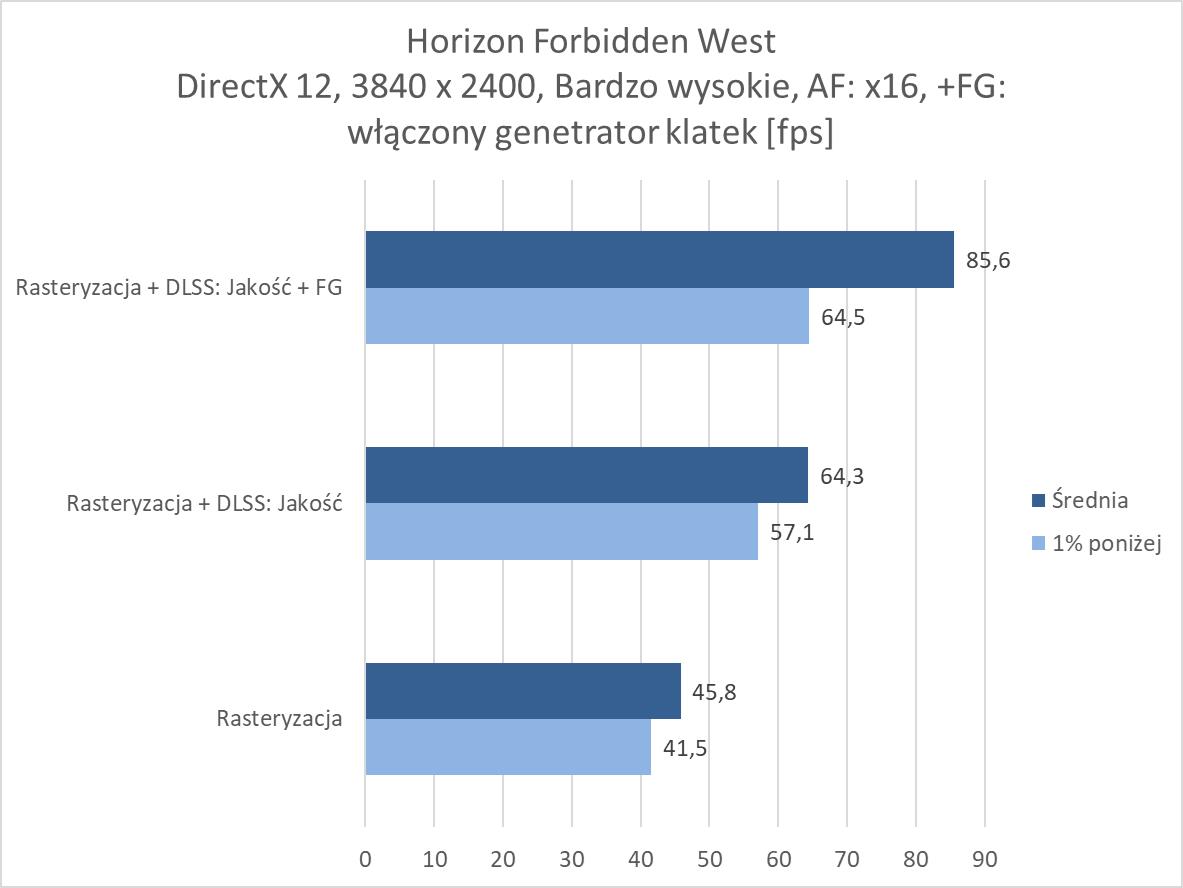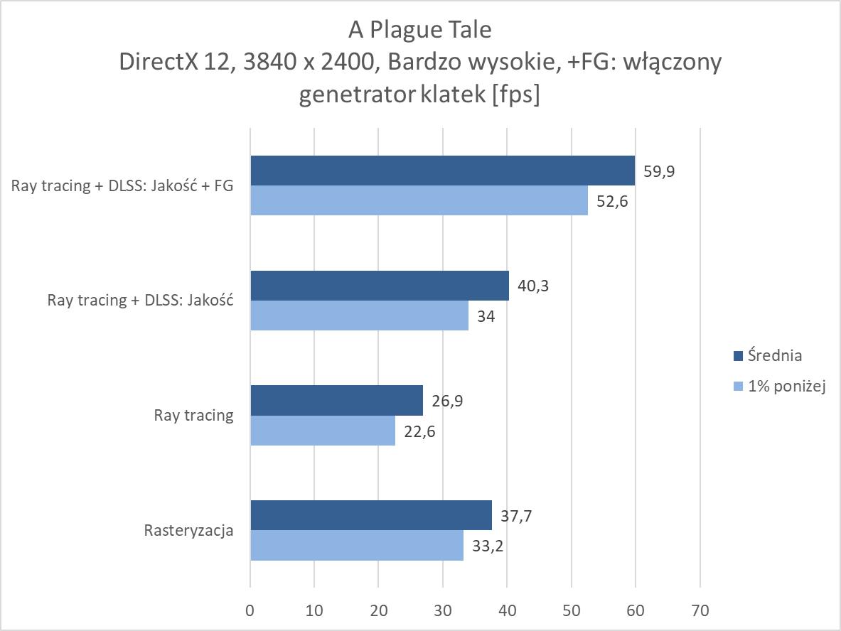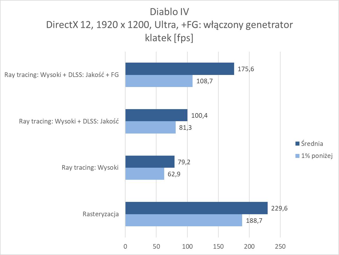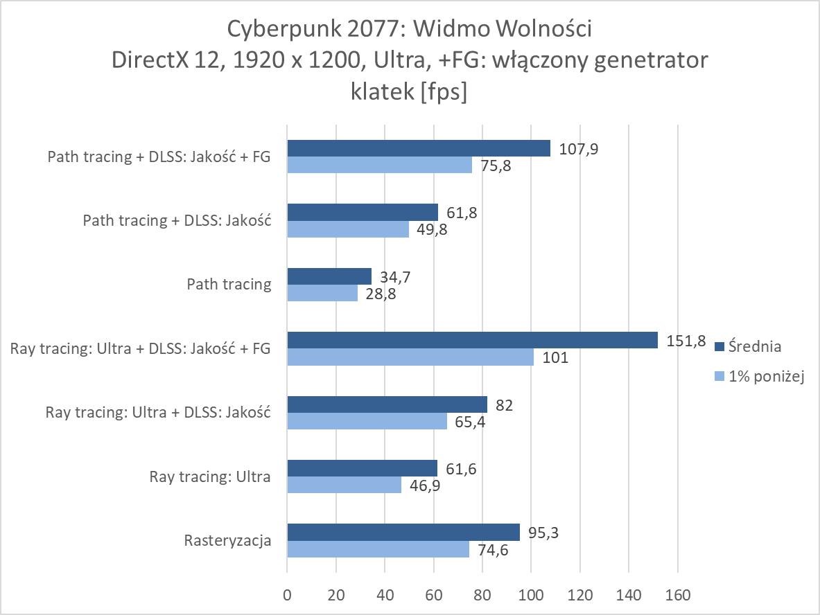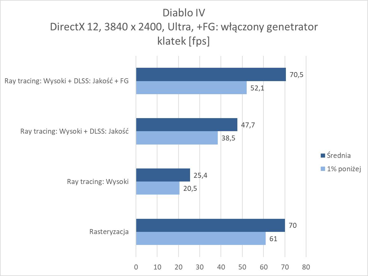 W ostatniej rozdzielczości w rasteryzacji jedynie w Diablo IV mamy ponad 60 fps. Na przykładzie Horizon możecie jednak zobaczyć, że dodanie DLSS: Jakość powinno zapewnić płynną rozgrywkę. Ray tracing to ponownie znacznie niższe wyniki. Tutaj nawet po dodaniu generatora klatek niekoniecznie musimy mieć średnio 60 fps i może przydać się inne ustawienie samego DLSS. Przy path tracingu generator klatek to obowiązek, a do tego zdecydowanie przyda się wyższe ustawienie DLSS.