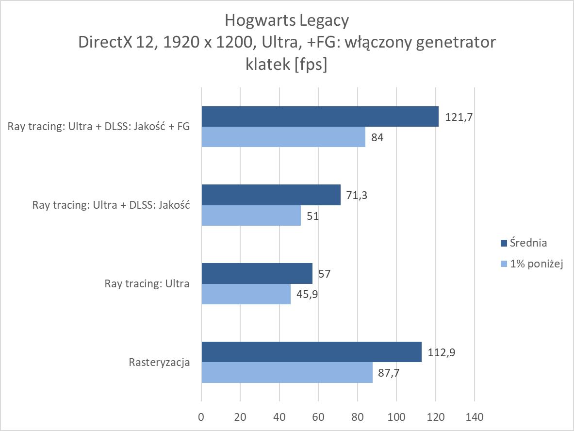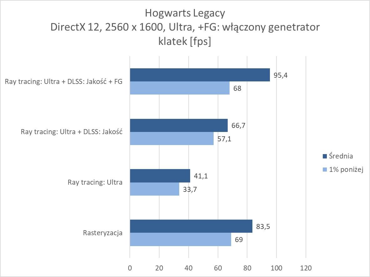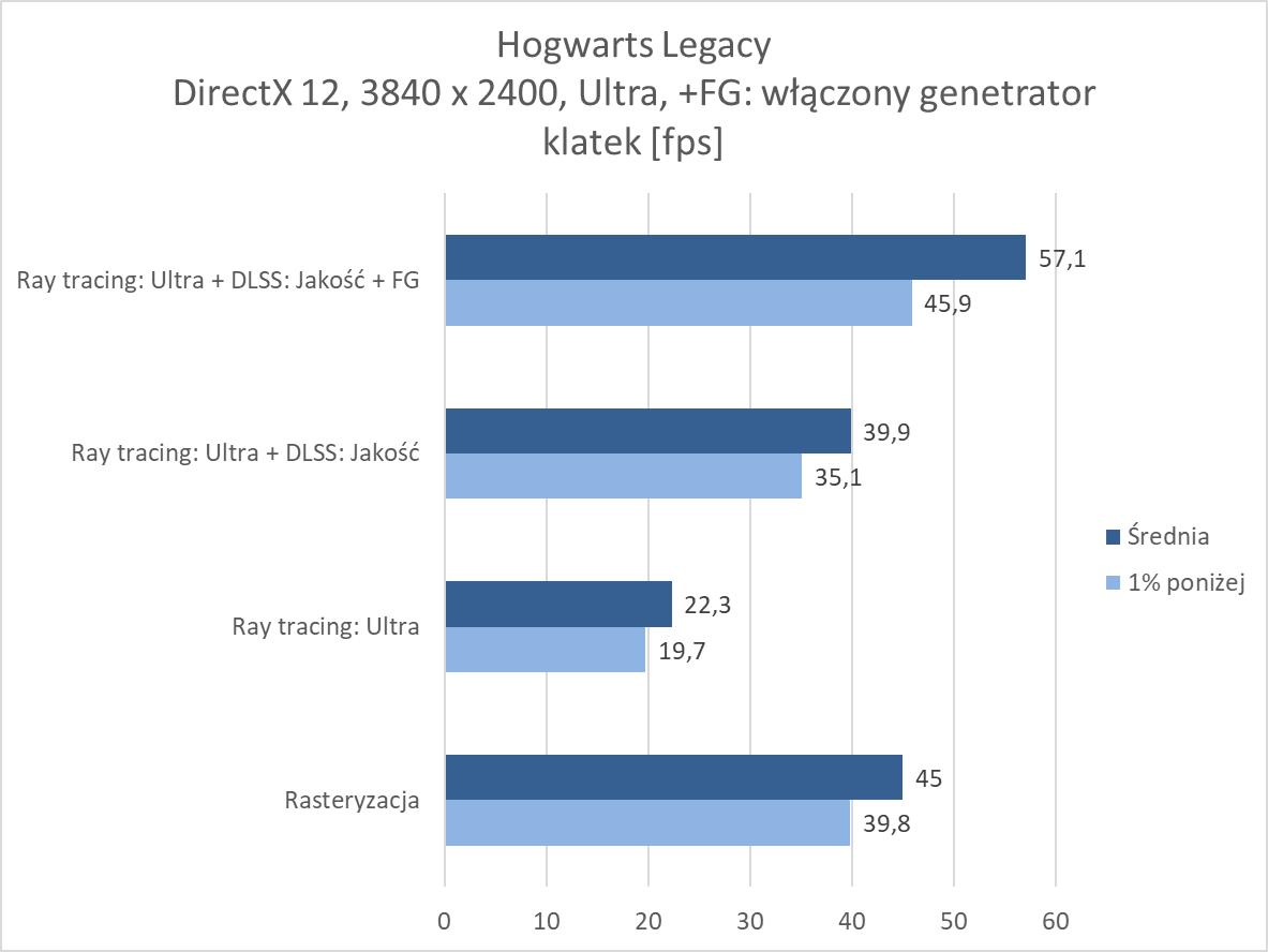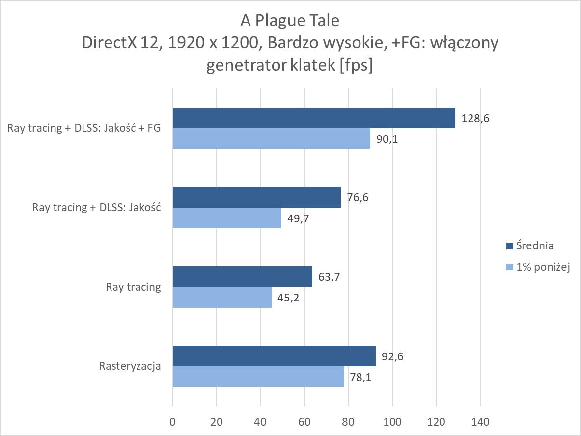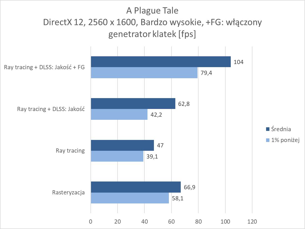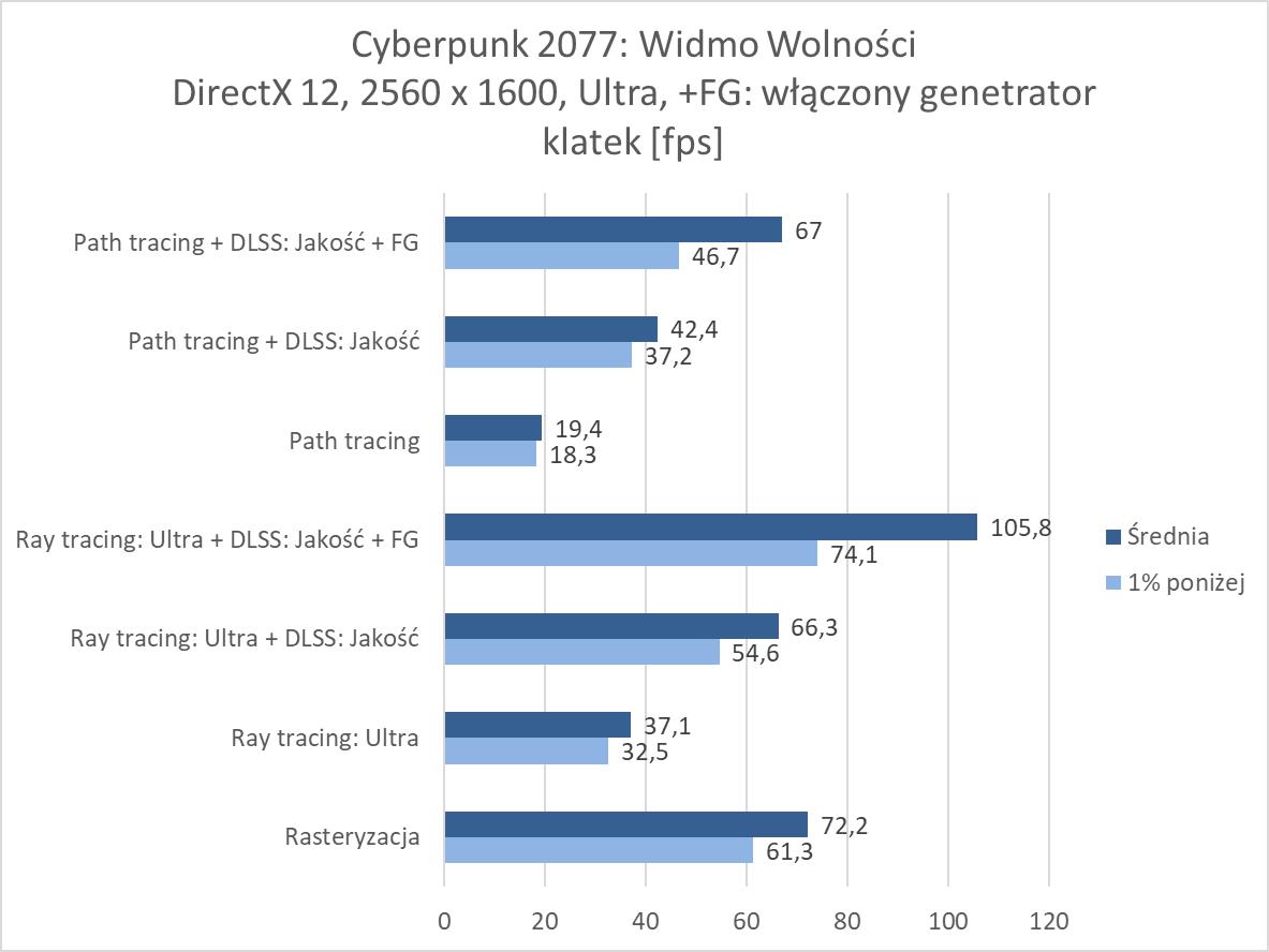 W ostatniej rozdzielczości w rasteryzacji jedynie w Diablo IV mamy ponad 60 fps. Na przykładzie Horizon możecie jednak zobaczyć, że dodanie DLSS: Jakość powinno zapewnić płynną rozgrywkę. Ray tracing to ponownie znacznie niższe wyniki. Tutaj nawet po dodaniu generatora klatek niekoniecznie musimy mieć średnio 60 fps i może przydać się inne ustawienie samego DLSS. Przy path tracingu generator klatek to obowiązek, a do tego zdecydowanie przyda się wyższe ustawienie DLSS.