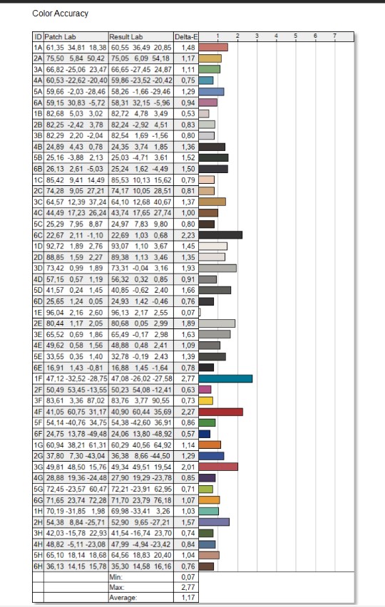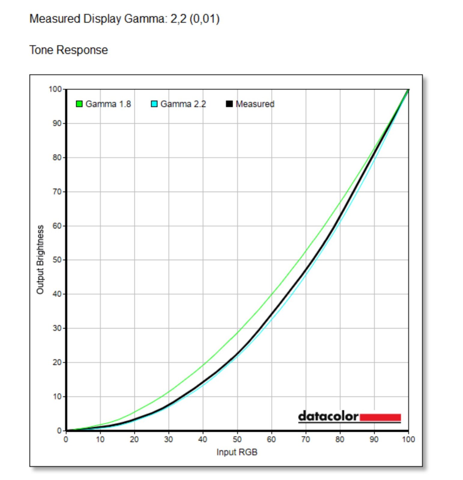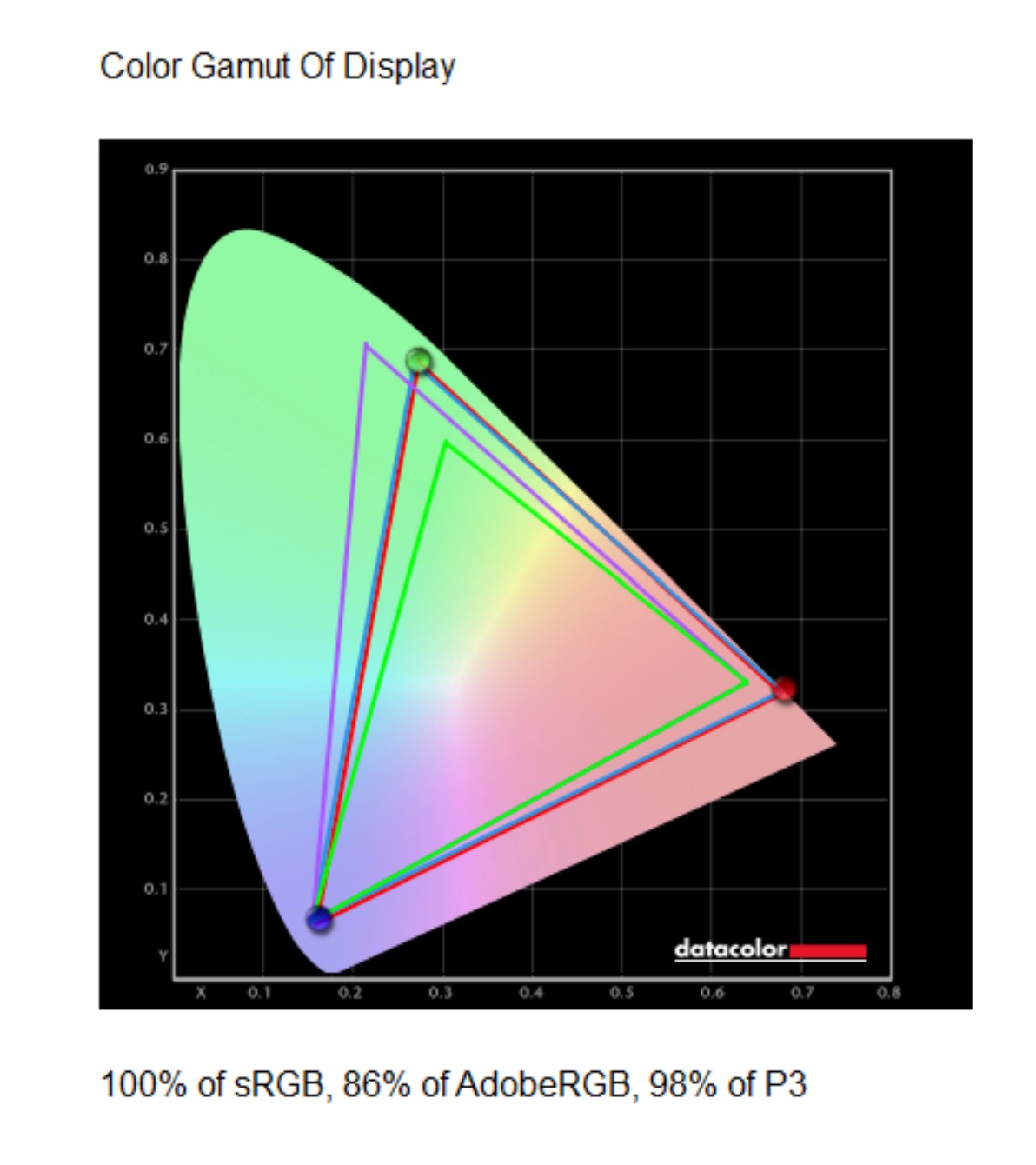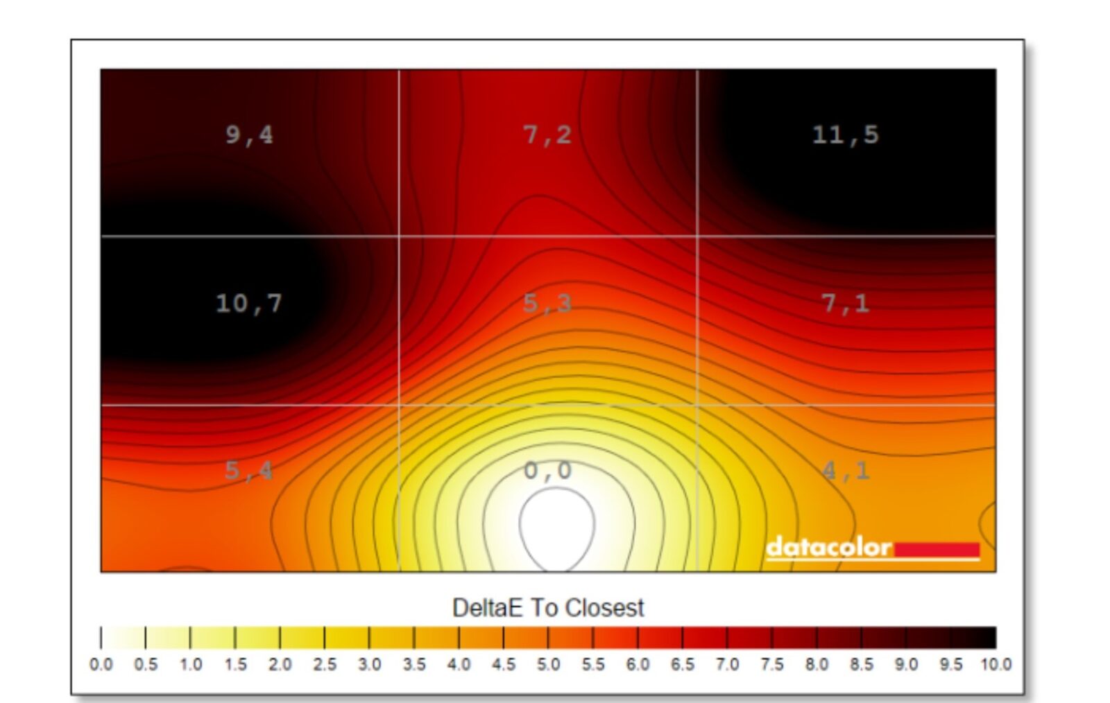 Pokrycie kolorów wynosi 100% sRGB, 86% AdobeRGB oraz 98% P3 – są to dobre wyniki. Gamma również wyszła idealna – 2,2. Przy 100% jasności (503,2 cd/m^2) kontrast wynosi 8490:1, a punkt bieli 7800. Ten ostatni mógłby być lepszy. Niejednorodność kolorów i podświetlenia mogłaby być mniejsza. W szczególności podświetlenie w lewym górnym rogu odstaje od całości. Różnice w kolorach też potrafią być spore w zależności od miejsca na ekranie. Mamy za to bardzo dobre odwzorowanie kolorów, a średnia Delta-E wynosi tylko 1,17.