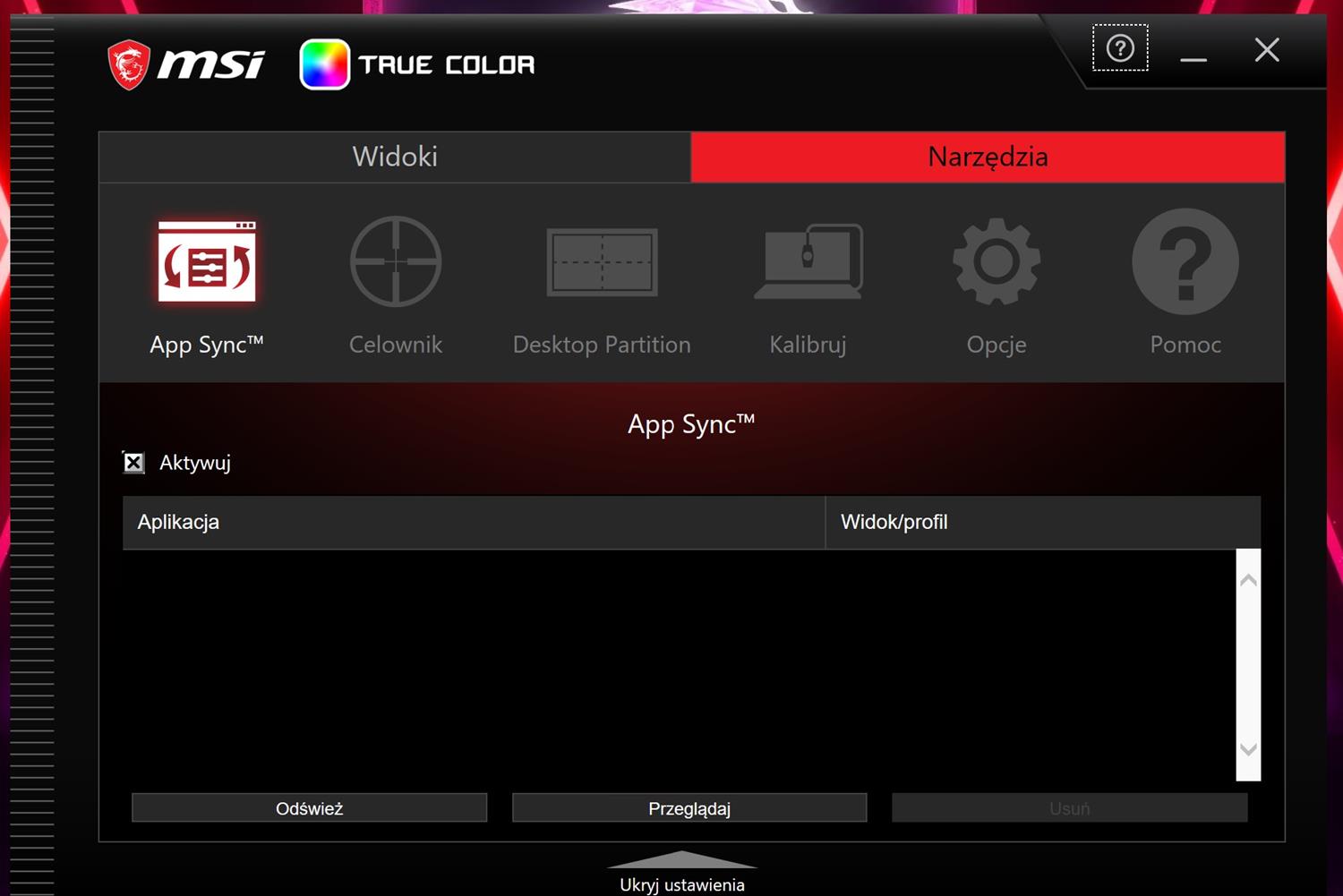 Mamy też do dyspozycji aplikację MSI True Color, gdzie możemy wybrać tryb pracy ekranu. Jest tutaj sporo opcji – tryb gracz, anty-niebieski, sRGB, AdobeRGB, DisplayP3, biuro czy film. Jest też możliwość włączenia celownika czy kalibracji, jeśli macie kompatybilny kalibrator.