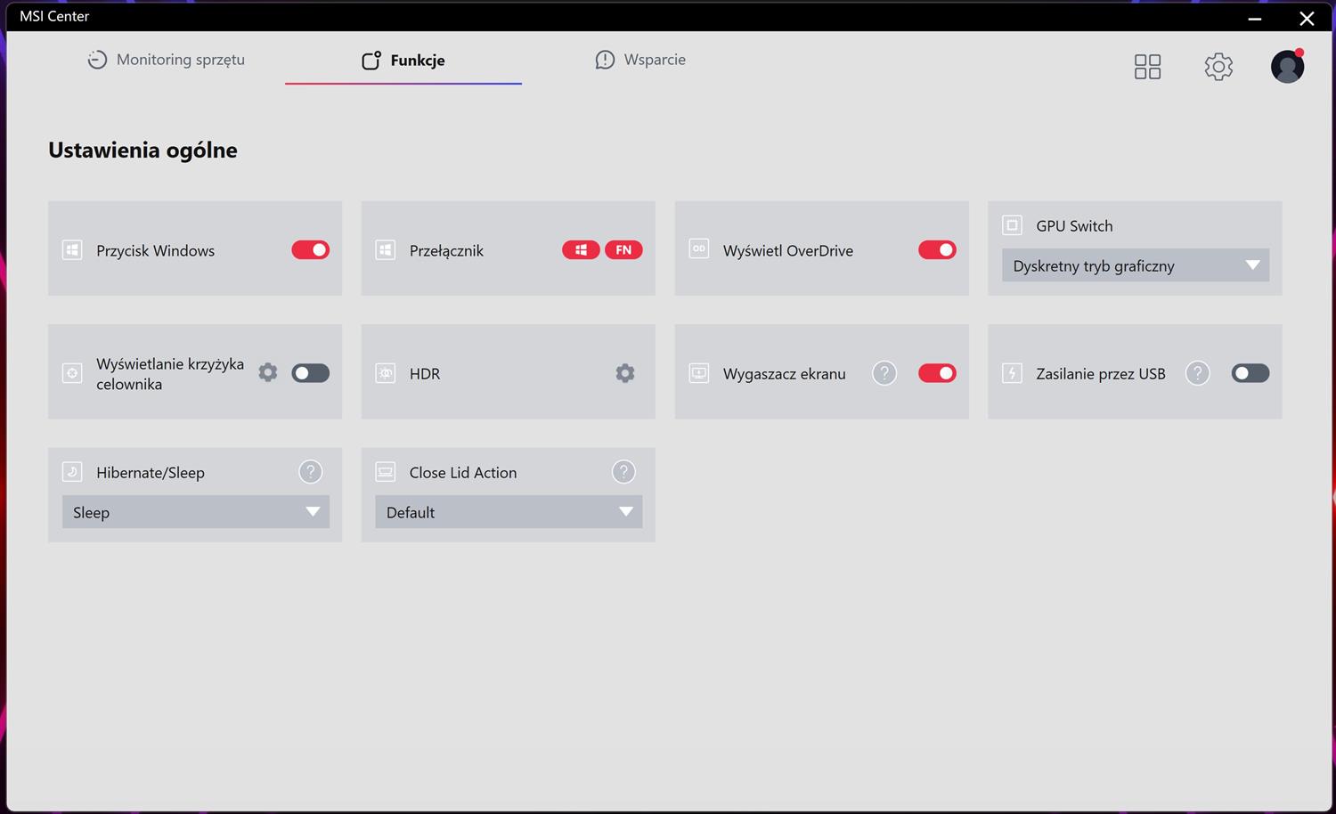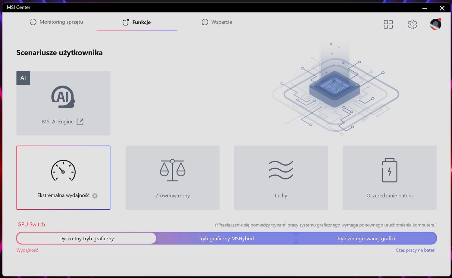 Oprogramowania do sterowania całością mamy dwa. Pierwsze to MSI Center, w którym możecie podejrzeć działanie podzespołów, zmienić scenariusze użytkownika, włączyć MSI AI Engine czy wiele innych. Drugie to SteelSeries GG, gdzie możecie choćby pobawić się podświetleniem klawiatury czy całego laptopa. Oba oprogramowania są dosyć proste w obsłudze i szybko powinniście złapać, co gdzie znajdziecie.