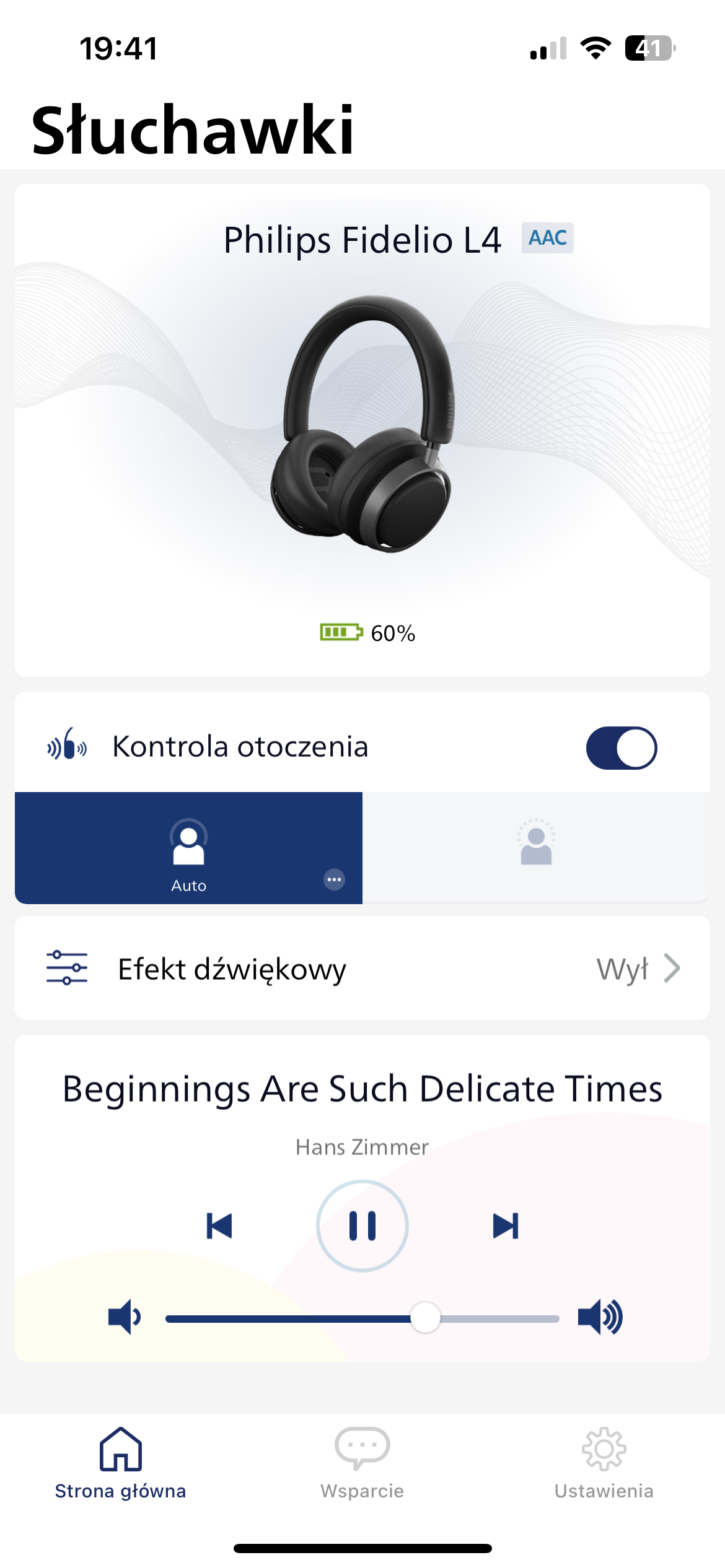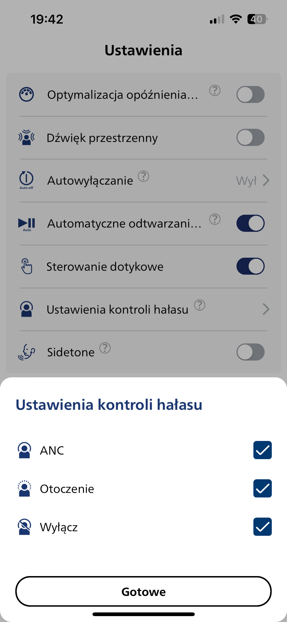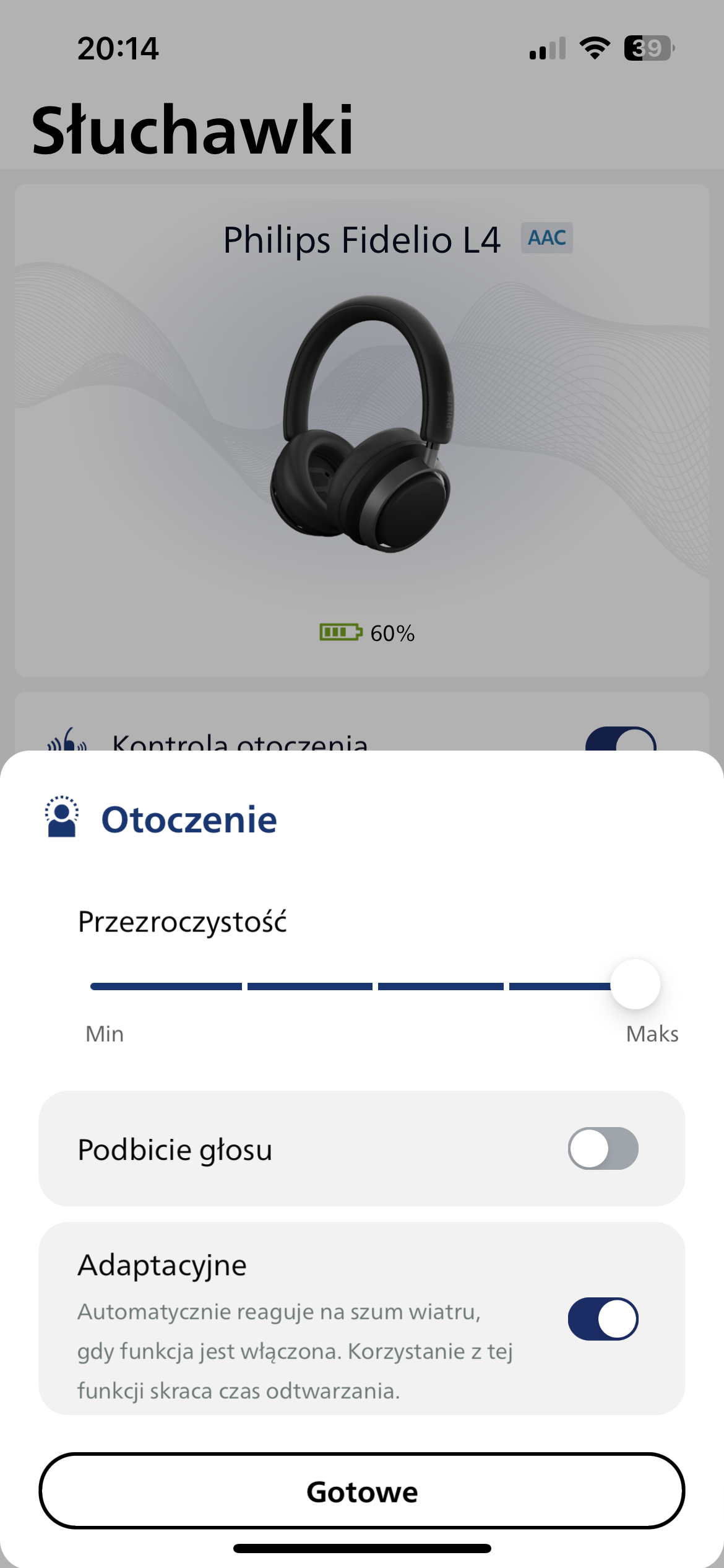 Domyślne ustawienia w moim przypadku nie wymagały właściwie zmian. Uznałem, że słuchawki nie wymagają korekcji, pozostawiłem też aktywny adaptacyjny ANC. Philips Fidelio L4 nie wymagały ręcznego włączenia trybu multipoint, od razu mogły współpracować z dwoma urządzeniami.