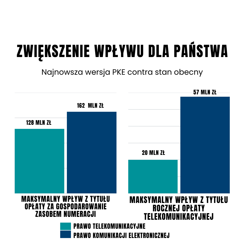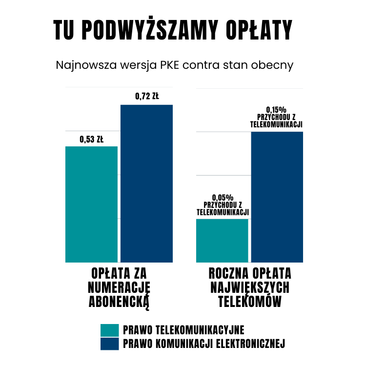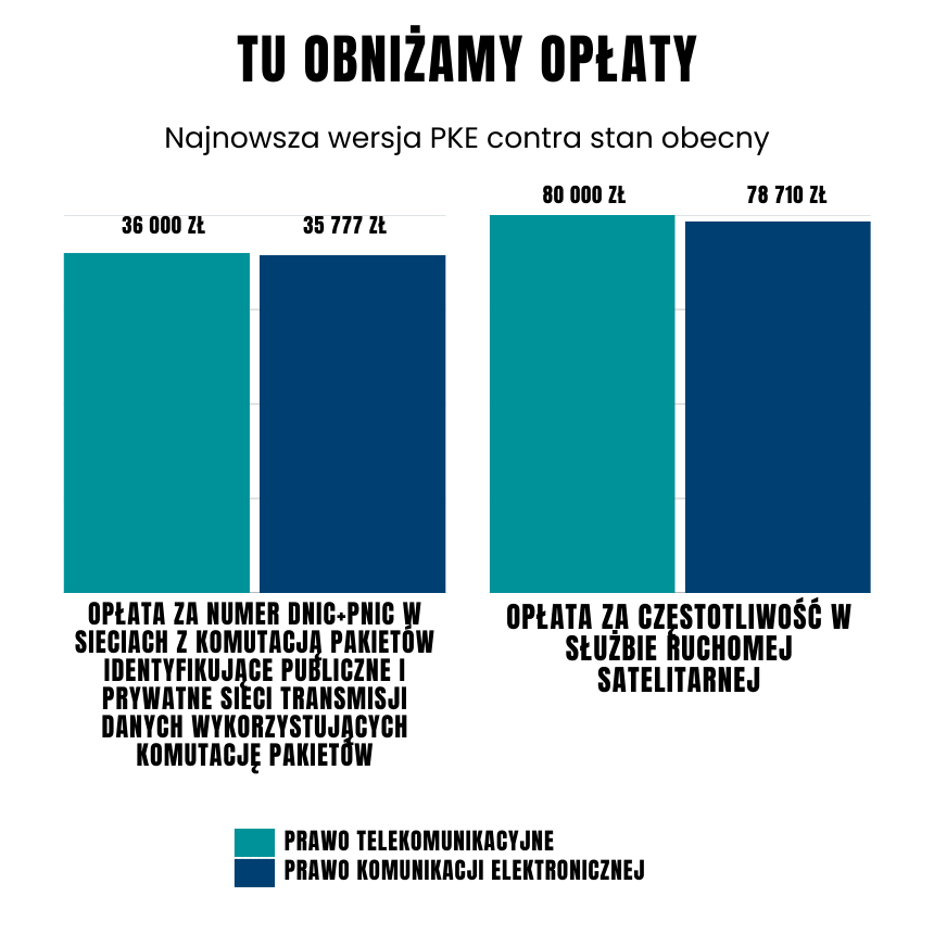 Choć europejskie przepisy (EKŁE) nie zakładają modyfikacji opłat nakładanych dla operatorów, polskie władze do przepisów PKE postanowiły takie zapisy dodać. Słusznie, bo w końcu Prawo Komunikacji Elektronicznej zastąpi Prawo Telekomunikacyjne, obowiązujące od 2004 roku. To w nim są zaszyte m.in. rzeczy takie jak opłata telekomunikacyjna nakładana na operatorów, która stała się przedmiotem ogromnego sporu. Więc jak zmieniać, to wszystko za jednym zamachem.
