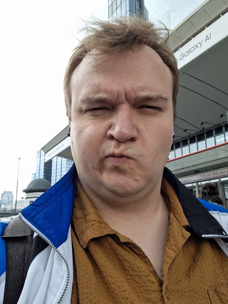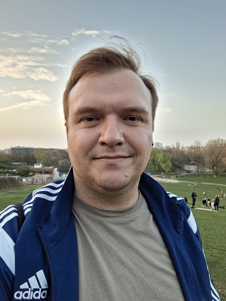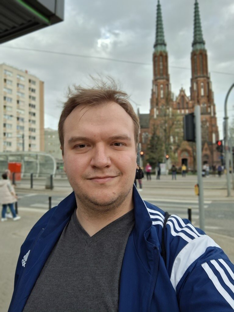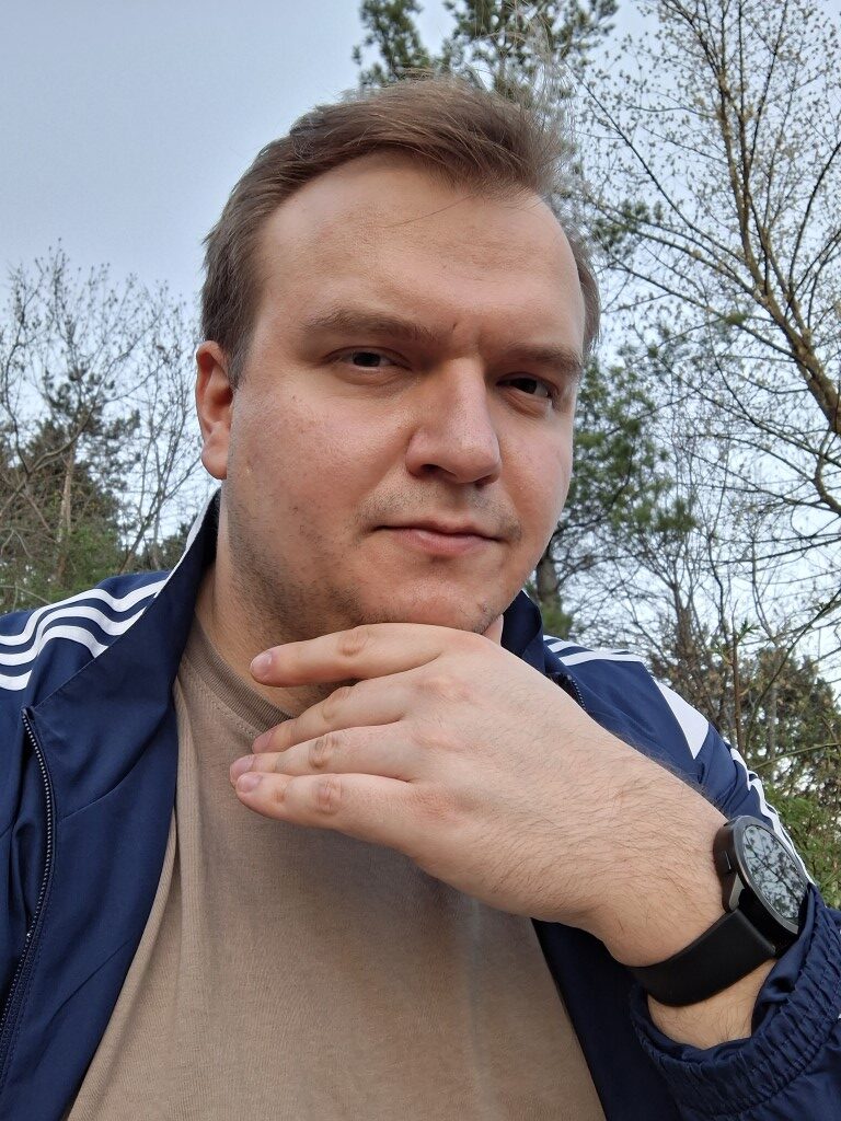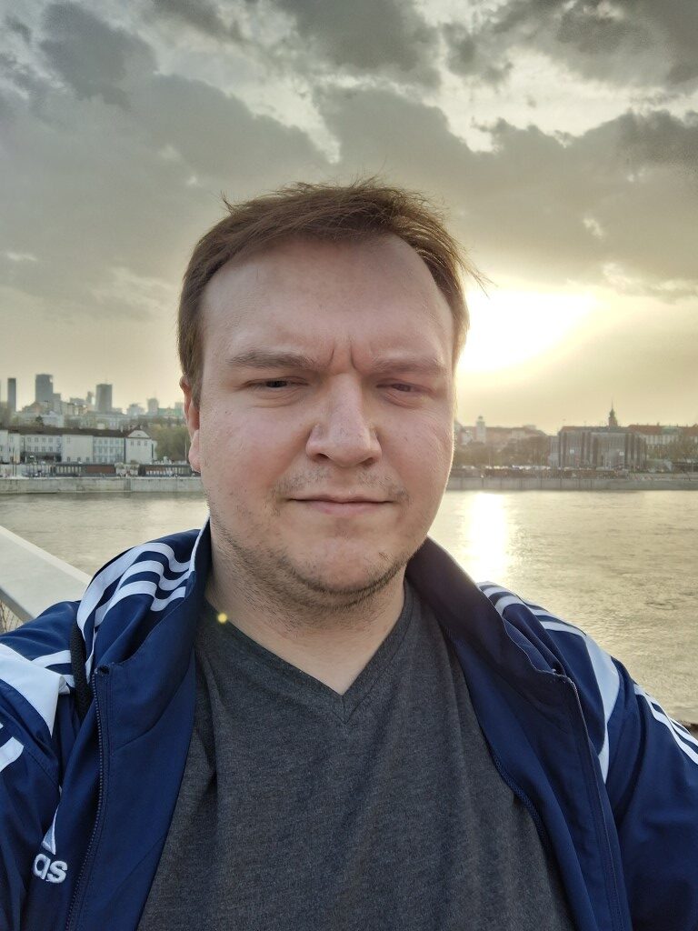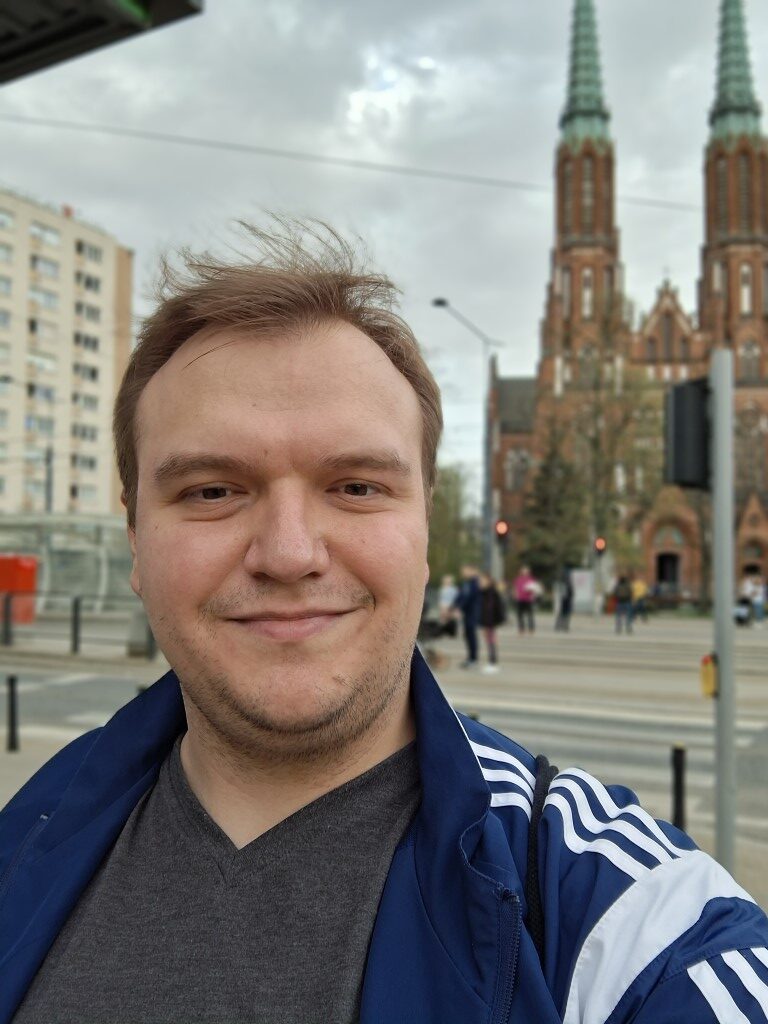 Przedni aparat wykonuje zdjęcia z dużą ilością detali i spójną względem innych oczek kolorystyką. Z pewnością zadowoleni będą ci, którzy potrzebują dużej rozpiętości tonalnej – nawet fotografując się z silnym źródłem światła z tyłu nie dochodzi do przepaleń. Jednocześnie kolory cery są nieco podkręcone, bo smartfon decyduje się nieco podnieść temperaturę tonalną na naszej twarzy. Jeśli macie bladą cerę, to najpewniej na zdjęciach będziecie wyglądać cieplej.