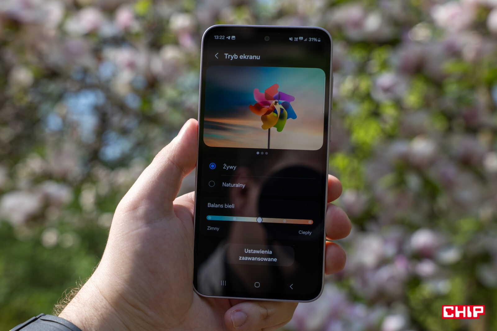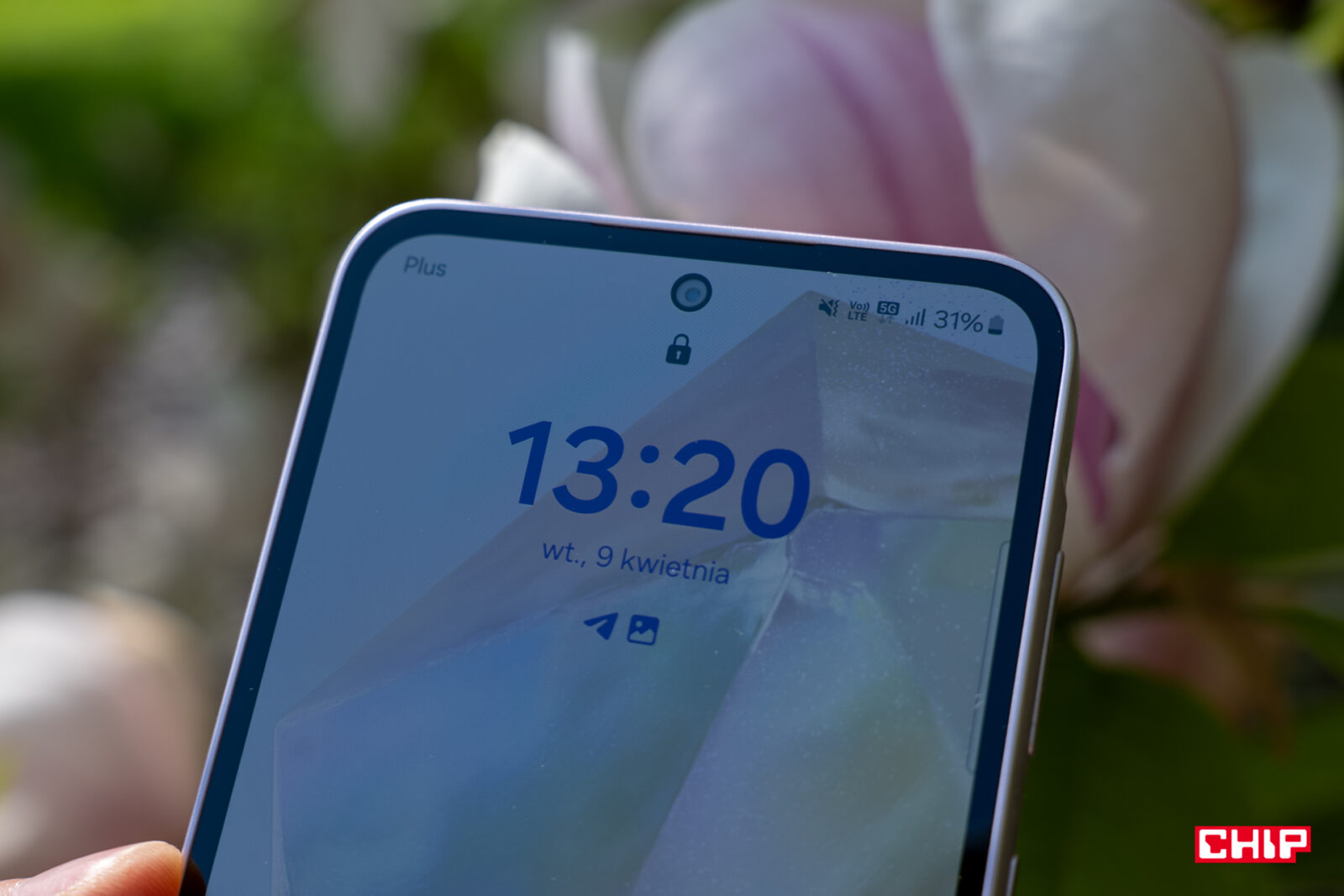To najpewniej kwestia polaryzatora, który nałożono na ekran i być może ten efekt będzie różnił się między egzemplarzami. Sam panel spełnia założenia dla swojej klasy cenowej – obsługuje HDR i osiąga jasność bliską 1750 LUX w testach przy białym ekranie ze 100% podświetlenia. Ma też sprytne ustawienia, które w bardzo jasnych sceneriach modyfikują kontrast i odbiór zdjęć, by poprawić czytelność czcionek. Galaxy A35 5G poradzi sobie w jasnym słońcu, nawet jeżeli jego konkurenci potrafią osiągać lepsze parametry maksymalnej jasności, a do tego jego czujnik oświetlenia działa bezproblemowo. W ustawieniach znalazło się też kilka suwaków regulujących temperaturę barwową czy ilość danego koloru w obrazie. Jednocześnie ze względu na ekran nie mógłbym polecić Samsunga Galaxy A35 5G z czystym sumieniem.