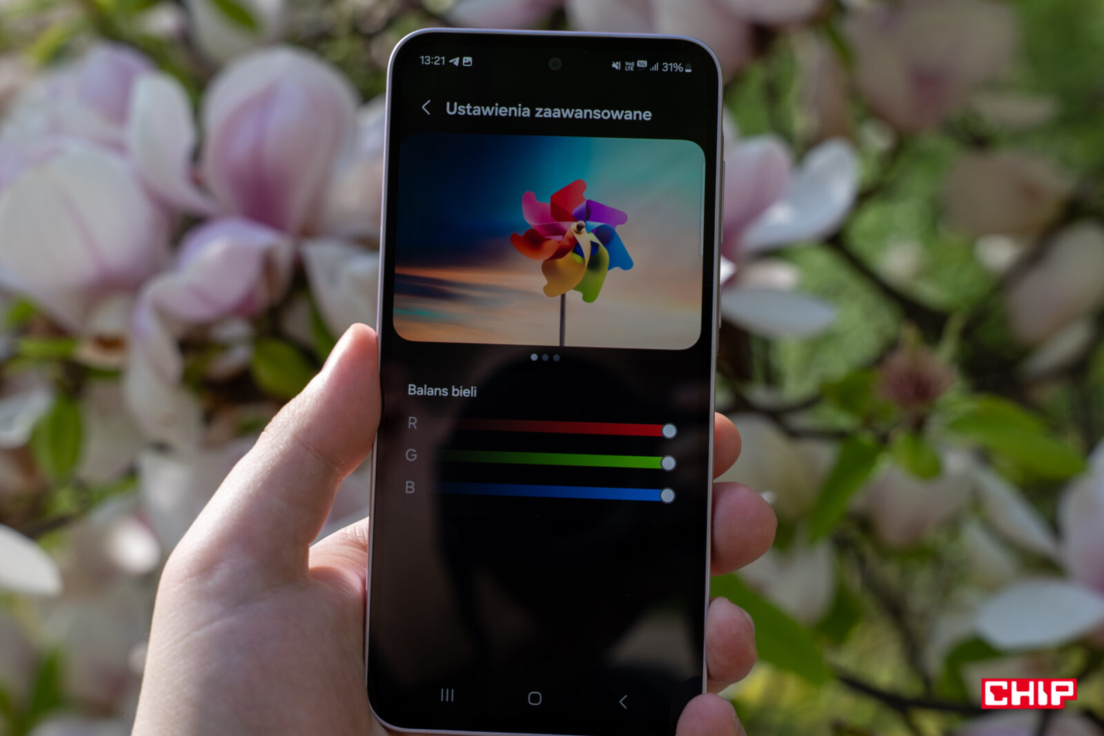 Niczego nowego nie znajdziecie też w aplikacji do zdjęć i wideo od Samsunga. Interfejs nie włącza samoczynnie trybu nocnego, nie ma też przełącznika HDR-u czy korekt sztucznej inteligencji – te kryją się w ustawieniach. Inaczej niż u konkurencji, Samsung proponuje sporo ustawień w trybie profesjonalnym, bo oprócz regulacji temperatury barw czy czasu migawki, znajdziemy tu korekty podświetlenia, nasycenia i cieni.