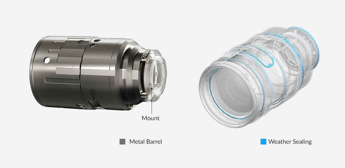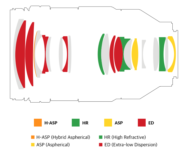 - Konstrukcja obiektywu: 21 elementów w 18 grupach (2 soczewki asferyczne APS, 1 soczewka hybrydowa asferyczna H-ASP, 3 soczewki ze szkła o wysokim współczynniku załamania HR i 6 soczewek ze szkła o bardzo niskiej dyspersji ED)