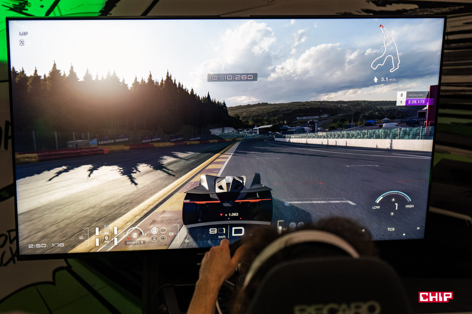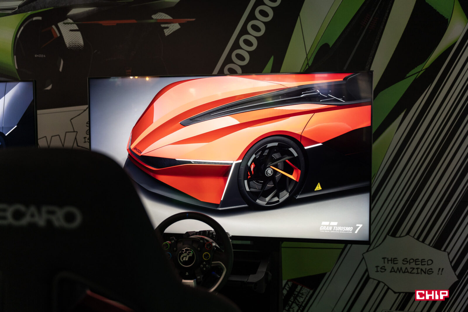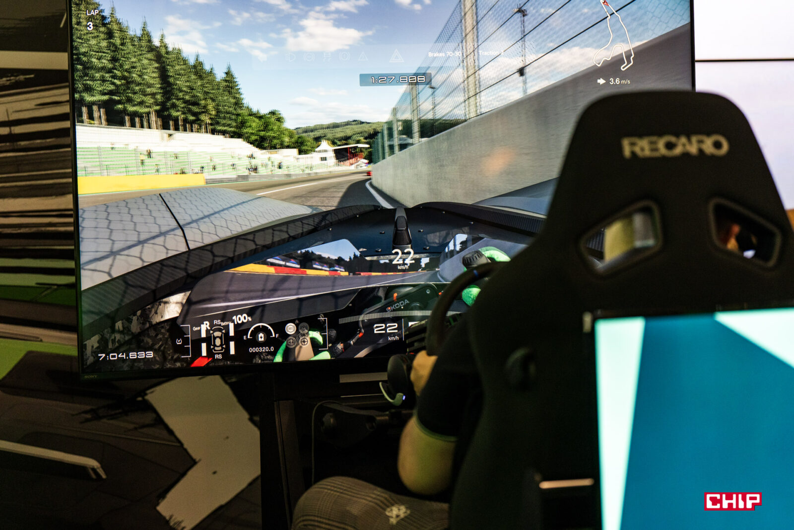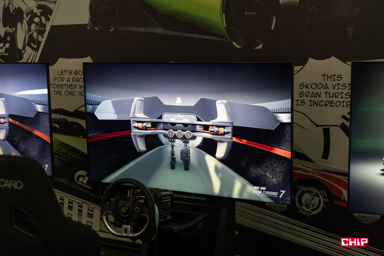 Jak prowadzi się Skoda Vision Gran Turismo? Mogę powiedzieć, że adekwatnie do mocy. Opanowanie tego auta przez kompletnego laika posadzonego przy symulatorze skończy się nawet nie na pierwszym zakręcie, ale na prostej po zbyt mocnym wciśnięciu gazu i lekkim nieostrożnym ruchu kierownicy. Moje czasy okrążenia były o prawie minutę słabsze od prawdziwych wymiataczy w tej dziedzinie.