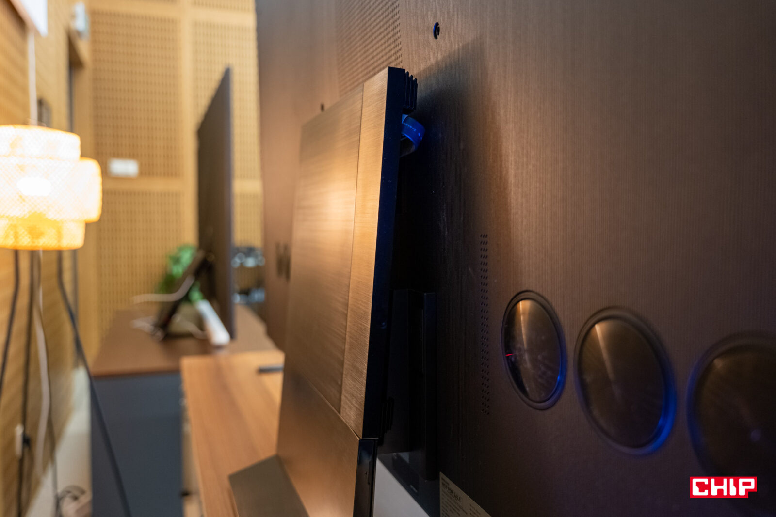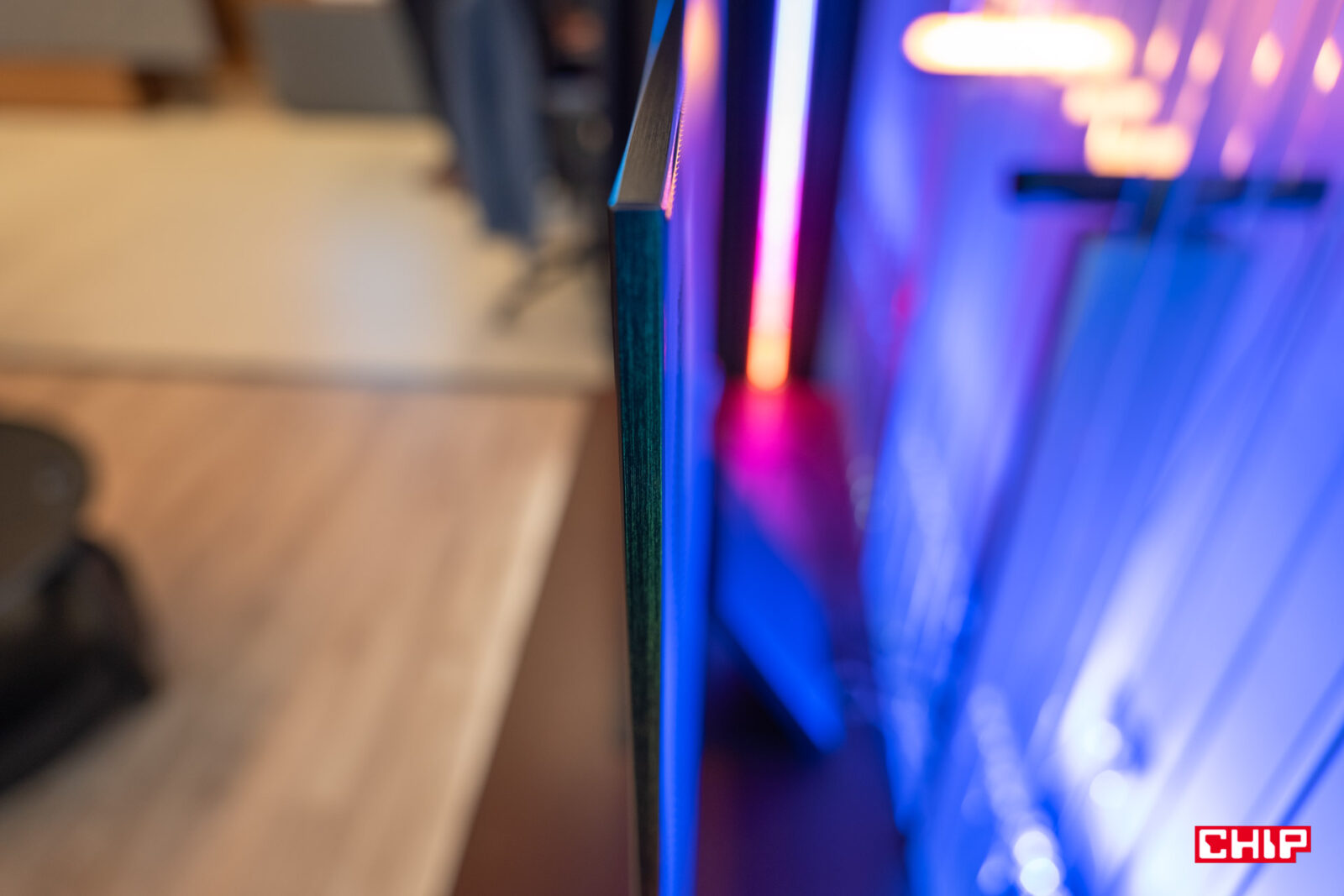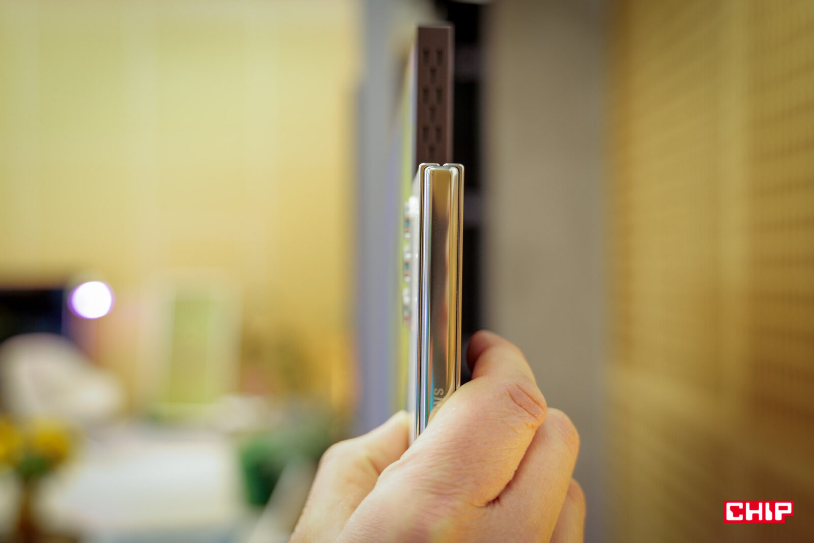 Infinity Air Design ma teoretycznie wyglądać tak, jakby telewizor unosił się nad meblem bez potrzeby wieszania go na ścianie. Sęk w tym, że zabieg z zastosowanym lustrem jakoś niespecjalnie mnie do tej wizji przekonał. Z pewnością będzie to prezentowało się inaczej, a w połączeniu z One Connect Pro łatwiej jest osiągnąć minimalistyczny wygląd zestawu. Jednocześnie największe wrażenie w dalszym ciągu robią niemal nieistniejące ramki. Do tego QN900D to telewizor niezwykle smukły – niewiele grubszy od złożonego Samsunga Galaxy Z Fold5.