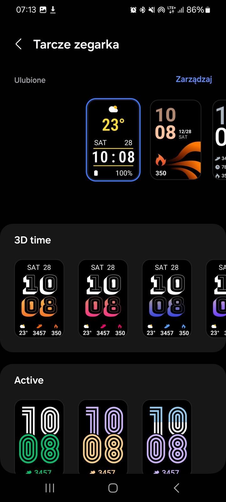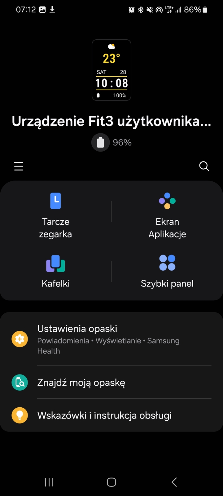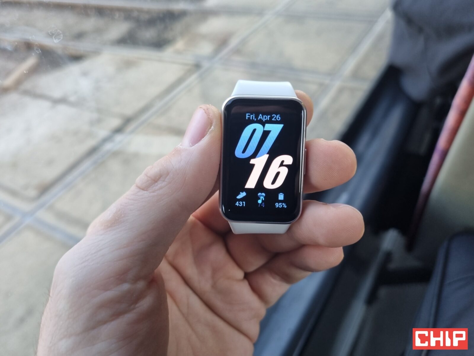 Samsung Galaxy Fit3 został wyposażony w 1,6 calowym dotykowy ekran AMOLED o rozdzielczości 256 x 402. Jest więc jest zauważalnie większy, niż w poprzedniku (Galaxy Fit 2), który miał 1,1 calowy ekran. Barwy są żywe i nasycony, a kontrast i czerń – idealne, jak na panel AMOLED przystało. Ostrość wyświetlanych treści również nie budzi moich zastrzeżeń w tej klasie cenowej. Maksymalna jasność jest w zupełności wystarczająca do komfortowego użytkowania nawet w słoneczny, wiosenny dzień. Co więcej, jasność może być regulowana automatycznie, dzięki wbudowanemu czujnikowi światła. Oczywiście mamy do wyboru wiele tarcz do wyboru z poziomu aplikacji Galaxy Wearable, ale wszystkie bazują na czarnym tle, dla zachowania energooszczędności.