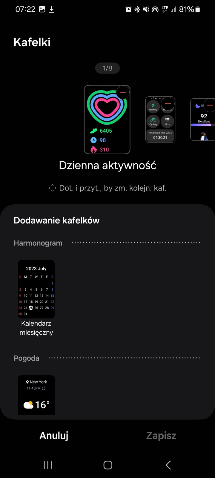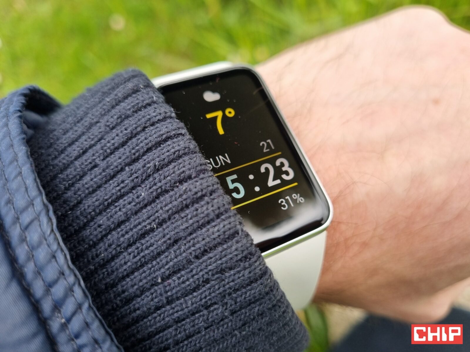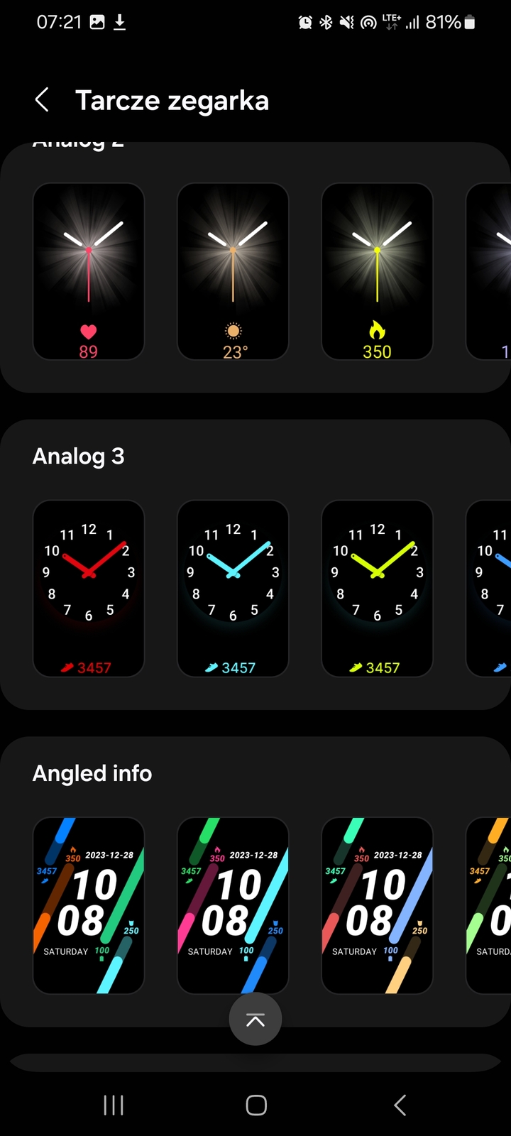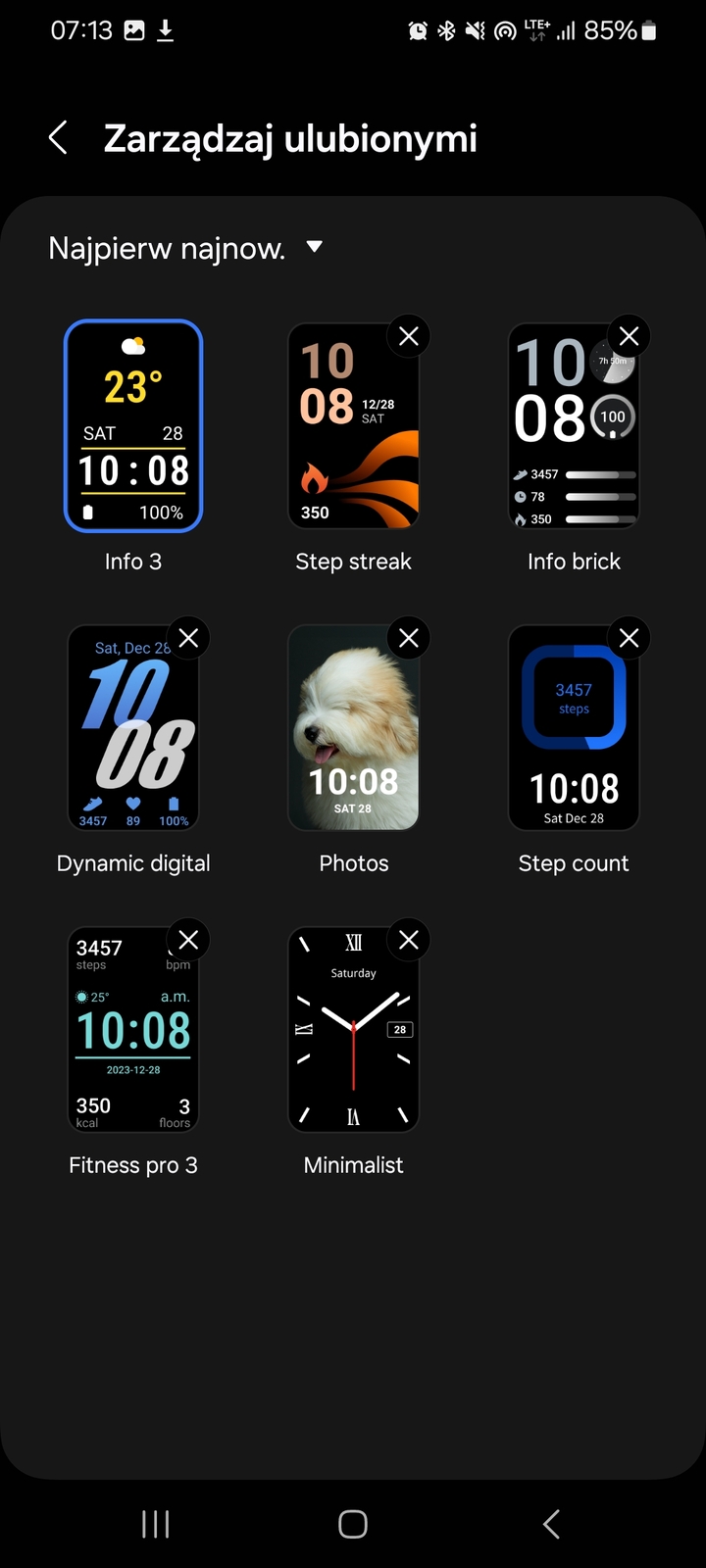 Samsung Galaxy Fit3 został wyposażony w 1,6 calowym dotykowy ekran AMOLED o rozdzielczości 256 x 402. Jest więc jest zauważalnie większy, niż w poprzedniku (Galaxy Fit 2), który miał 1,1 calowy ekran. Barwy są żywe i nasycony, a kontrast i czerń – idealne, jak na panel AMOLED przystało. Ostrość wyświetlanych treści również nie budzi moich zastrzeżeń w tej klasie cenowej. Maksymalna jasność jest w zupełności wystarczająca do komfortowego użytkowania nawet w słoneczny, wiosenny dzień. Co więcej, jasność może być regulowana automatycznie, dzięki wbudowanemu czujnikowi światła. Oczywiście mamy do wyboru wiele tarcz do wyboru z poziomu aplikacji Galaxy Wearable, ale wszystkie bazują na czarnym tle, dla zachowania energooszczędności.