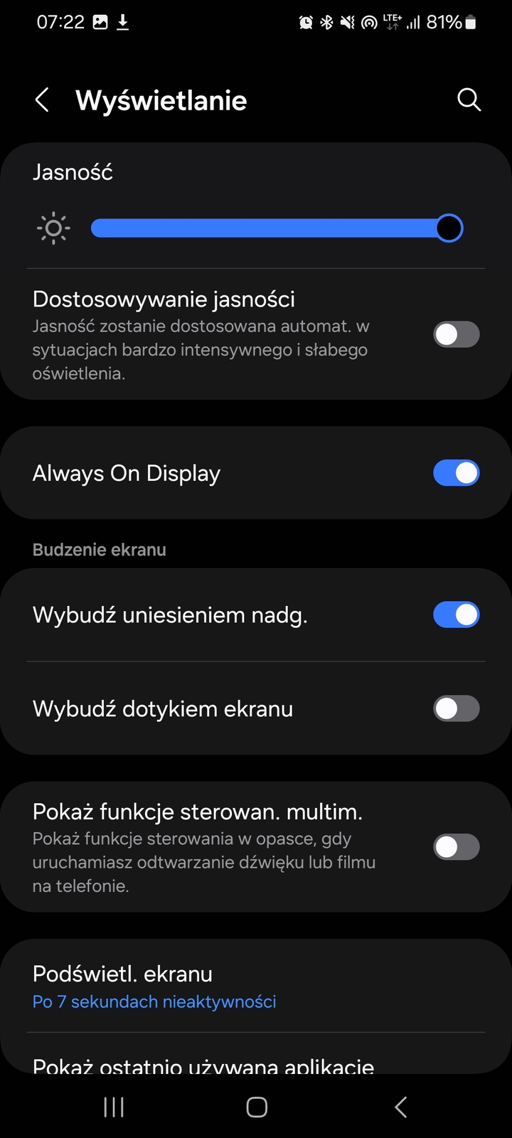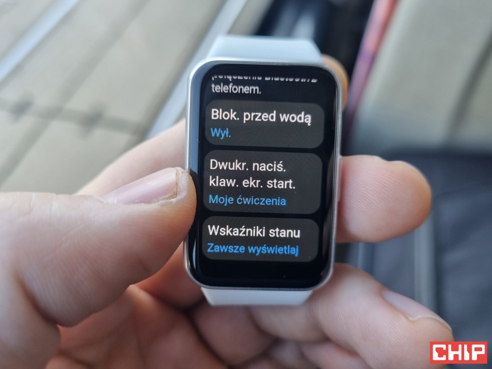 Ekran chroni szkło hartowane, ale Samsung nie chwali się nazwą tego szkła, także raczej nie jest to Gorilla Glass. Z kolei w ustawieniach dostępnych z poziomu samej opaski możemy włączyć tryb Always on Display, wybrać czas podświetlenia ekranu oraz metody jego wybudzania.