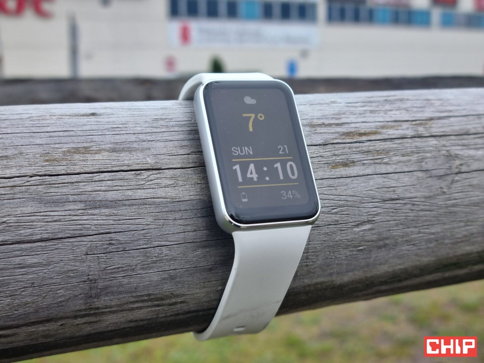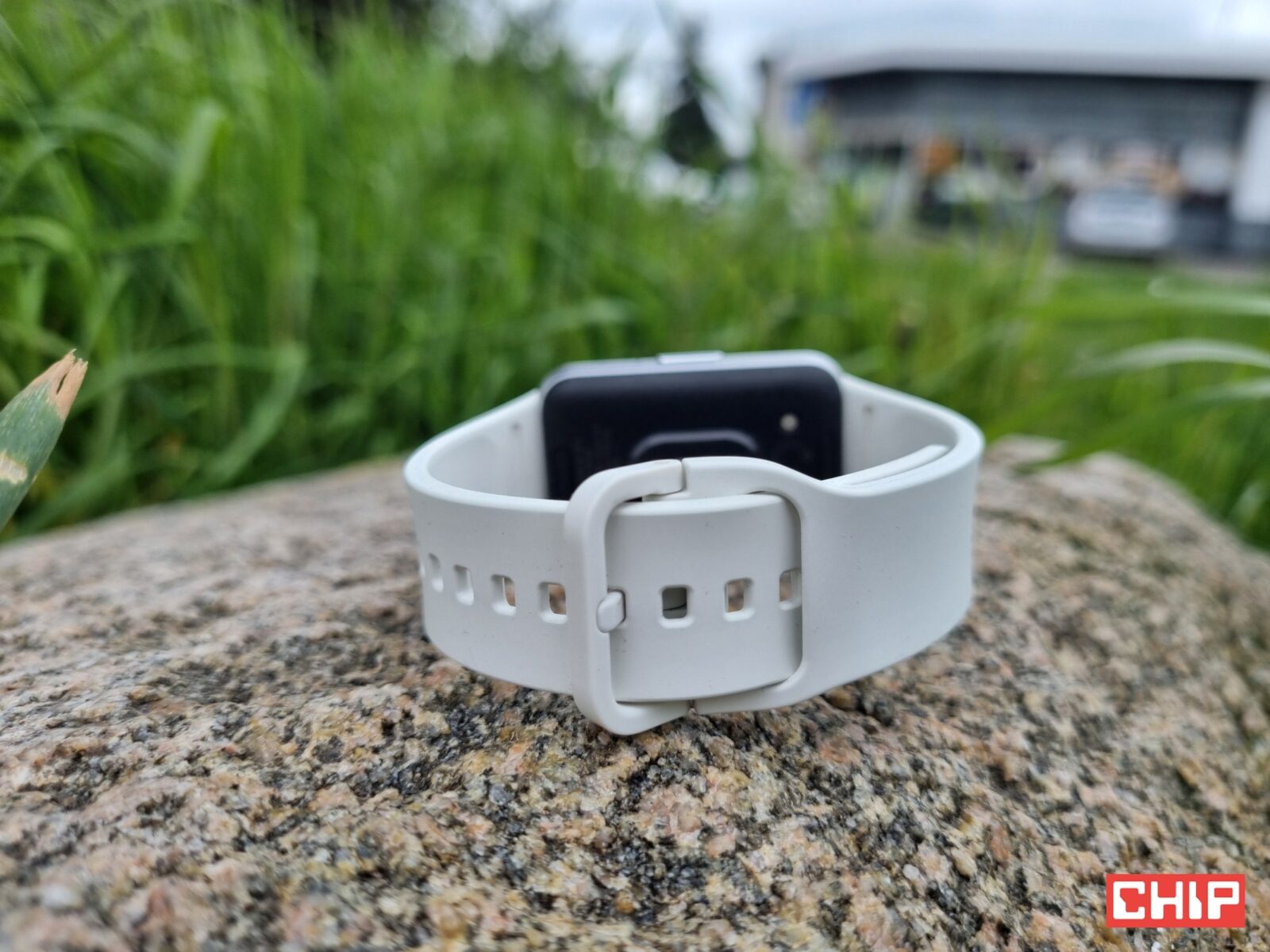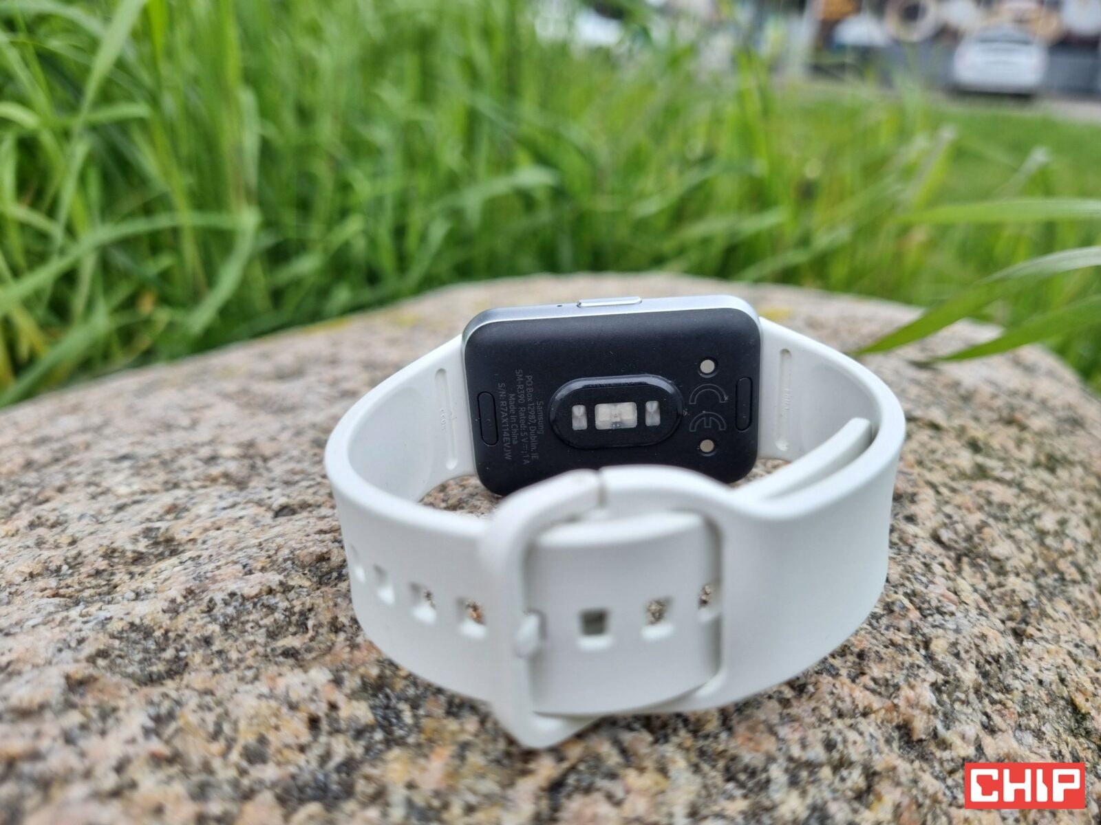 Do jakości wykonania nie mam większych zastrzeżeń. Tym bardziej, że korpus urządzenia został wykonany z aluminium z satynowym wykończeniem wykonanym metodą piaskowania! Koperta to matowy plastik z czujnikami, a jedynym przyciskiem jest ten umieszczony na bocznej części aluminiowej ramki. Jedynie silikonowe paski nie sprawiają wrażenia szczególnie trwałych, ale zawsze można je wymienić w razie potrzeby. Smartwatch jest wodoszczelny do 5 ATM i spełnia normę IP68, co jest jak najbardziej na plus. Zwłaszcza dla osób lubiących kąpiele bez konieczności zdejmowania opaski. Pod kątem designu mamy tu do czynienia z klasycznym smartbandem z prostokątną kopertą (przez którą może być przez niektóre osoby mylony ze smartwatchem).