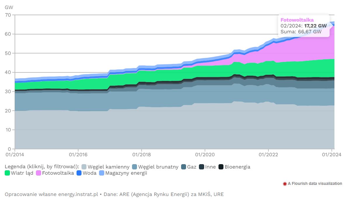 Dla porównania elektrownie wiatrowe łącznie mają moc 9,42 GW, a elektrownie na węgiel brunatny (wydobywany metoda odkrywkową, np. w Bełchatowie czy Turowie) – 8,88 GW. Są to najnowsze dane opublikowane przez Fundację Instrat i dotyczą stanu z lutego 2024 roku.
