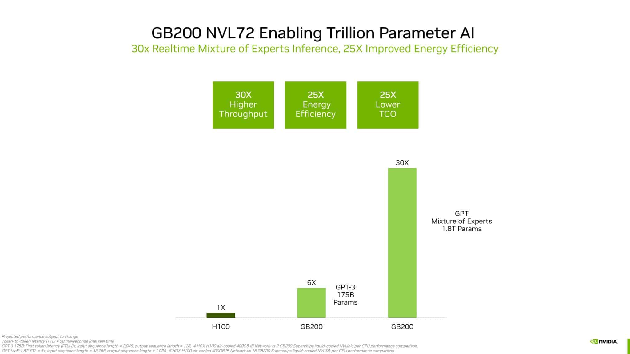 Ponadto GB200 NVL72 umożliwia do 30 razy większą przepustowość, osiągając jednocześnie 25 razy wyższą efektywność energetyczną i 25 razy niższy TCO (całkowity koszt eksploatacji). Nawet porównanie systemu GB200 NVL72 z procesorami 72 x86 daje 18-krotną przewagę systemu Blackwell i 3,27-krotny wzrost w porównaniu z systemem GH200 NVL72 w zapytaniu o połączenie z bazą danych.