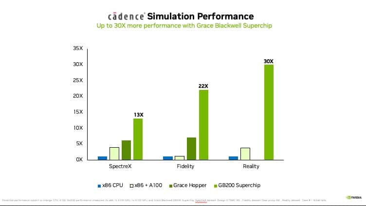 Nvidia pokazała wydajność symulacji w symulacji Cadence SpectreX, która działa 13 razy szybciej na Blackwell GB200 i 22 razy wydajniej w CFD (Computational Fluid Dynamics) w porównaniu z układami ASIC i tradycyjnymi procesorami. Układ jest także wielokrotnie szybszy niż systemy A100 i Grace Hopper (GH200). Zapewnia również wydajność sztucznej inteligencji. Tam platforma GPU Blackwell GB200 króluje niepodzielnie z 30-krotnym wzrostem w stosunku do H100 w GPT (parametr 1,8 biliona).