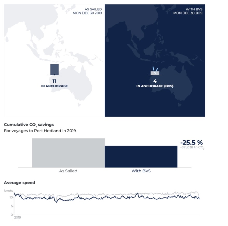 Dzięki globalnej koordynacji i dobrze zrealizowanej łączności można zapewnić statkom zwolnić, aby dotrzeć do portu dokładnie na czas rozładunku. Ta redukcja prędkości zmniejsza opór hydrodynamiczny, co pozwala silnikom spalać mniej paliwa, a w konsekwencji zmniejsza emisje i to całkowicie bez zmiany harmonogramu dostaw towarów. Nie mowa tutaj o niewielkich oszczędnościach, bo wedle analizy 20580 tras 3651 statków typu Panamax w 2022 roku w grę wchodzi zmniejszenie emisji o medianę 23,2%. Inne badanie przeprowadzone przez członka konsorcjum Blue Visby, firmę NAPA, które objęło 150000 rejsów 13000 statków towarowych w 2019 roku, wykazało, że 87% statków mogłoby zmniejszyć prędkość średnio o jeden węzeł, co skutkowałoby redukcją emisji o 16%.