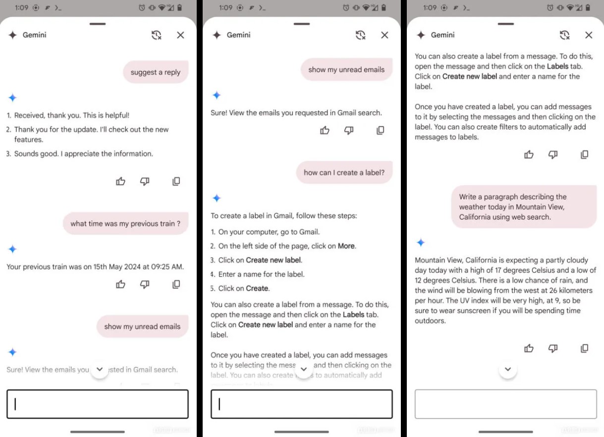 Używając tej funkcji, można poprosić o sugestie odpowiedzi, zmienić ton pisanego właśnie maila czy zlecić inne zdania. Android Authority zauważa jednak, że na razie Gemini zdaje się mieć ograniczony dostęp do treści z poprzednich wiadomości, bo po poproszeniu o wyświetlenie nieprzeczytanych maili w oknie czasu, nie spełnił tego żądania. Najwyraźniej głębsza integracja z pocztą nie jest jeszcze oferowana.