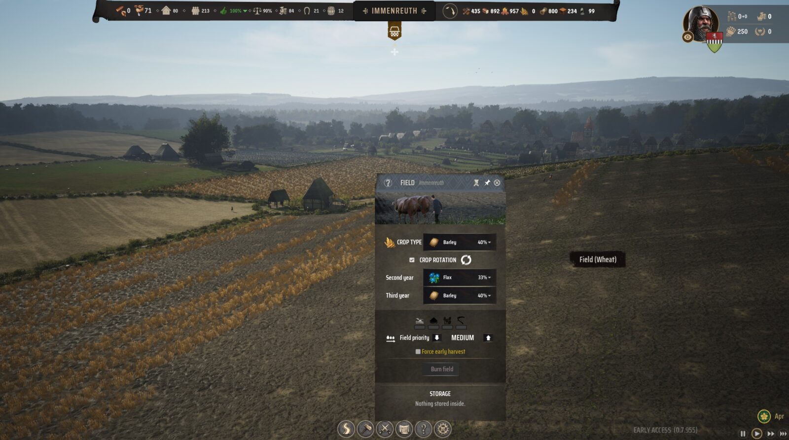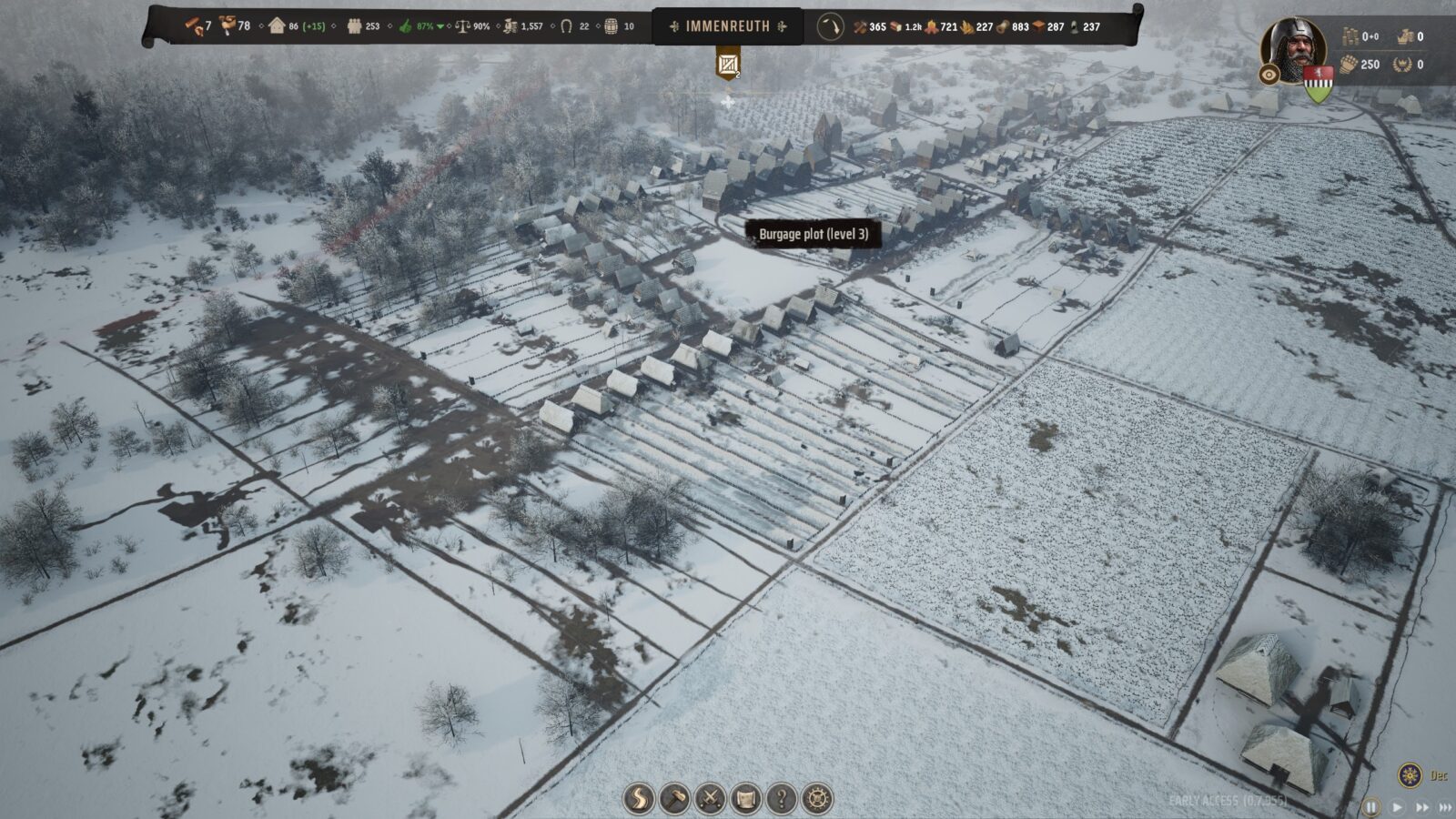 Manor Lords stawia też nacisk na rolnictwo, gdzie znajdziemy nawet historycznie uzasadnioną trójpolówkę, hodowle zwierząt pociągowych i owiec, przemysł drzewny, kopalniany i tekstylny, rozbudowaną logistykę, łączącą się z zarządzaniem magazynami, a nawet handel. Jest więc tego sporo. Klikać jest ewidentnie w co, a zaproponowany balans sprawia, że pierwsze kroki w tej produkcji wcale nie są wcale takie przyjemne. Wysoki próg wejścia jednych przerazi, drugich (w tym mnie) zaintryguje, ale z czasem to początkowe skomplikowanie rozgrywki staje się już powtarzalne. Urozmaica to przyzwoicie zrealizowany system walki i armii, a niektórych do ciągłej gry mogą też zachęcić imperialistyczne ciągoty co do podboju całej krainy, ale na tym etapie rozgrywka staje się już bardzo powtarzalna. Nowy teren, nowe pola, dobrze przemyślane drogi i “centrum” z kilkunastoma domami oraz budowle do eksploatacji okolicznych zasobów to jedyne, co wtedy musimy robić. No, chyba że ktoś będzie czerpał radość z chodzenia tam i z powrotem po rozbudowanych miastach w “trybie szlachcica”.