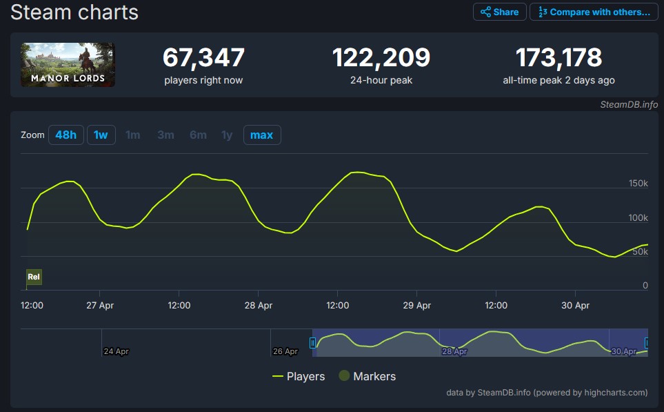 Wedle danych stojący za Manor Lords twórca, Grzegorz Styczeń, zagwarantował sobie już zapewne miejsce wśród najbogatszych Polaków. W ciągu zaledwie 24 godzin od premiery we wczesnym dostępie, co miało miejsce 26 kwietnia 2024 roku, gra Manor Lords sprzedała się w ponad 1 milionie kopii na Steam. Dwa dni później, czyli mniej więcej po tym, jak o grze dało się usłyszeć praktycznie wszędzie, tylko na Steamie grało w nią jednocześnie 173178 unikalnych graczy, a poziom ten ciągle utrzymuje się wysoko.