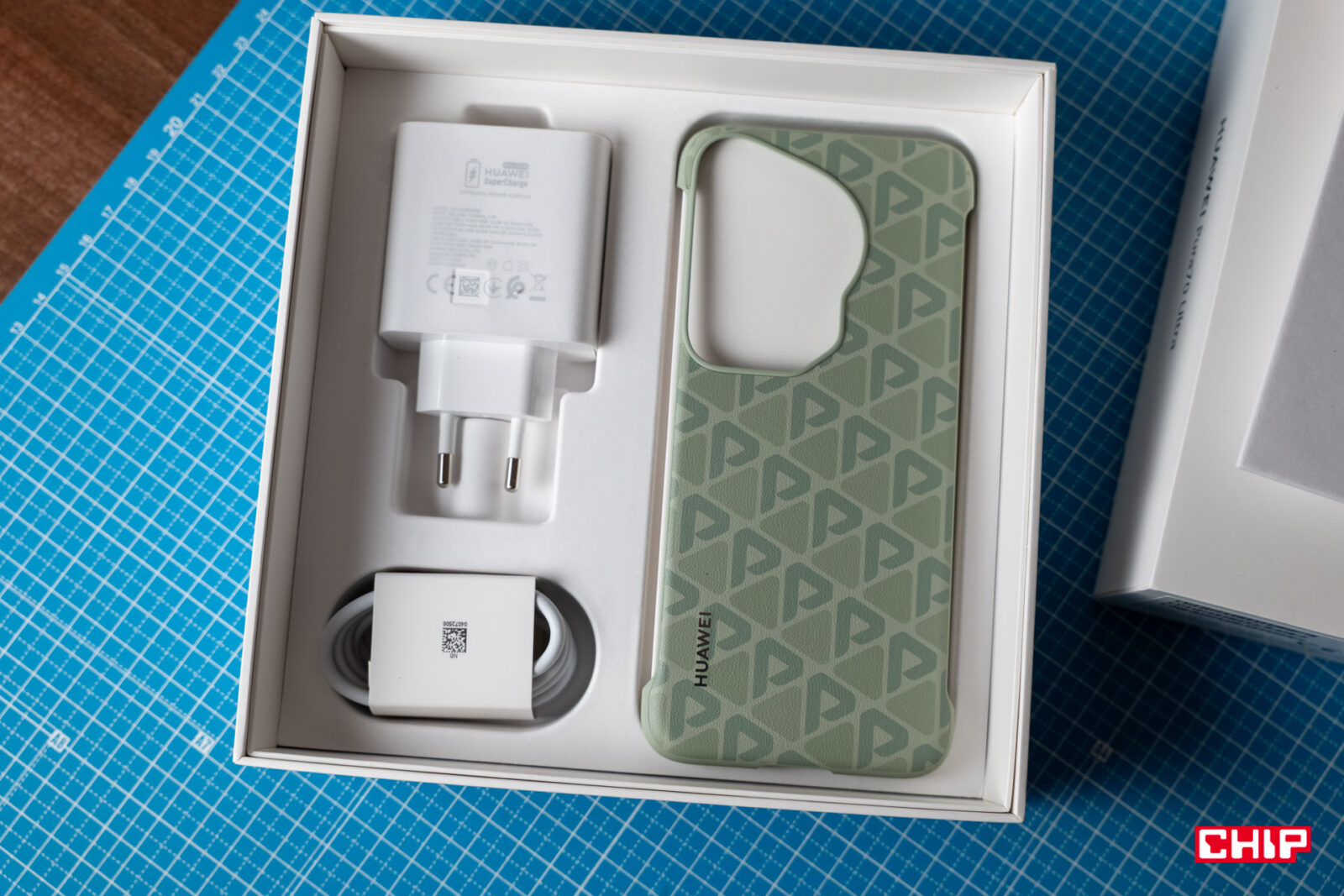 Wróćmy jednak do modelu Ultra, a konkretnie – jego opakowania. To jest całkiem spore, nawet jak na fakt, że w środku upchnięto ładowarkę i etui. Huawei postanowił dać swoim odbiorcom uczucie otwierania czegoś więcej niż kolejnego pudełka ze smartfonem. Zaimplementowana ładowarka o mocy 100W ma w sobie dwa porty – USB-A oraz USB-C, które niestety są nieznośnie blisko siebie, a to czyni włożenie dwóch kabli jednocześnie praktycznie niemożliwym. Dorzucono także całkiem stylowe, zielone etui z wzorem w logo serii Pura. To bardziej osłonka, bowiem boczne ściany są w znacznej mierze odkryte, ale zawsze to coś na początek.