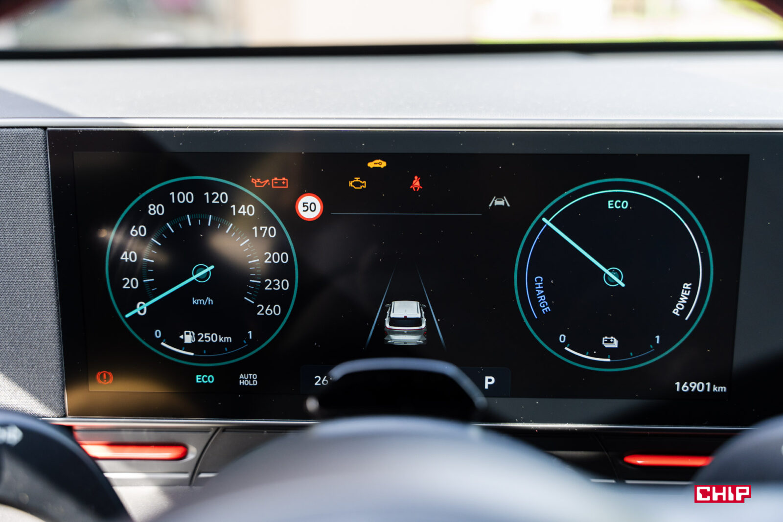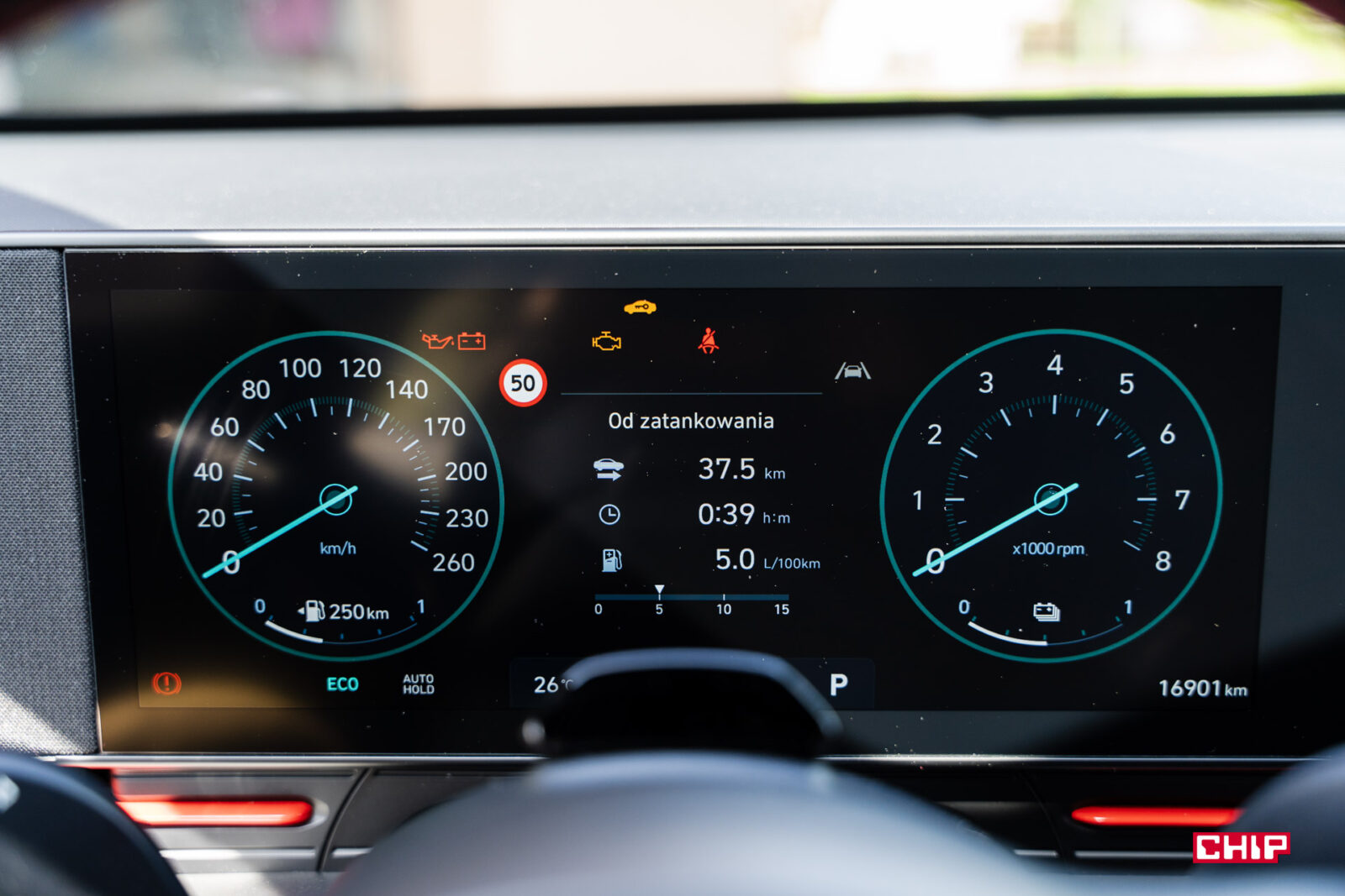 Kona została wyposażona w całkiem słusznych jak na hybrydę rozmiarów akumulator trakcyjny – 1,56 kWh, co oznacza, że jest czym wyręczać silnik spalinowy i zbijać spalanie. Po tygodniu otrzymaliśmy takie wyniki: