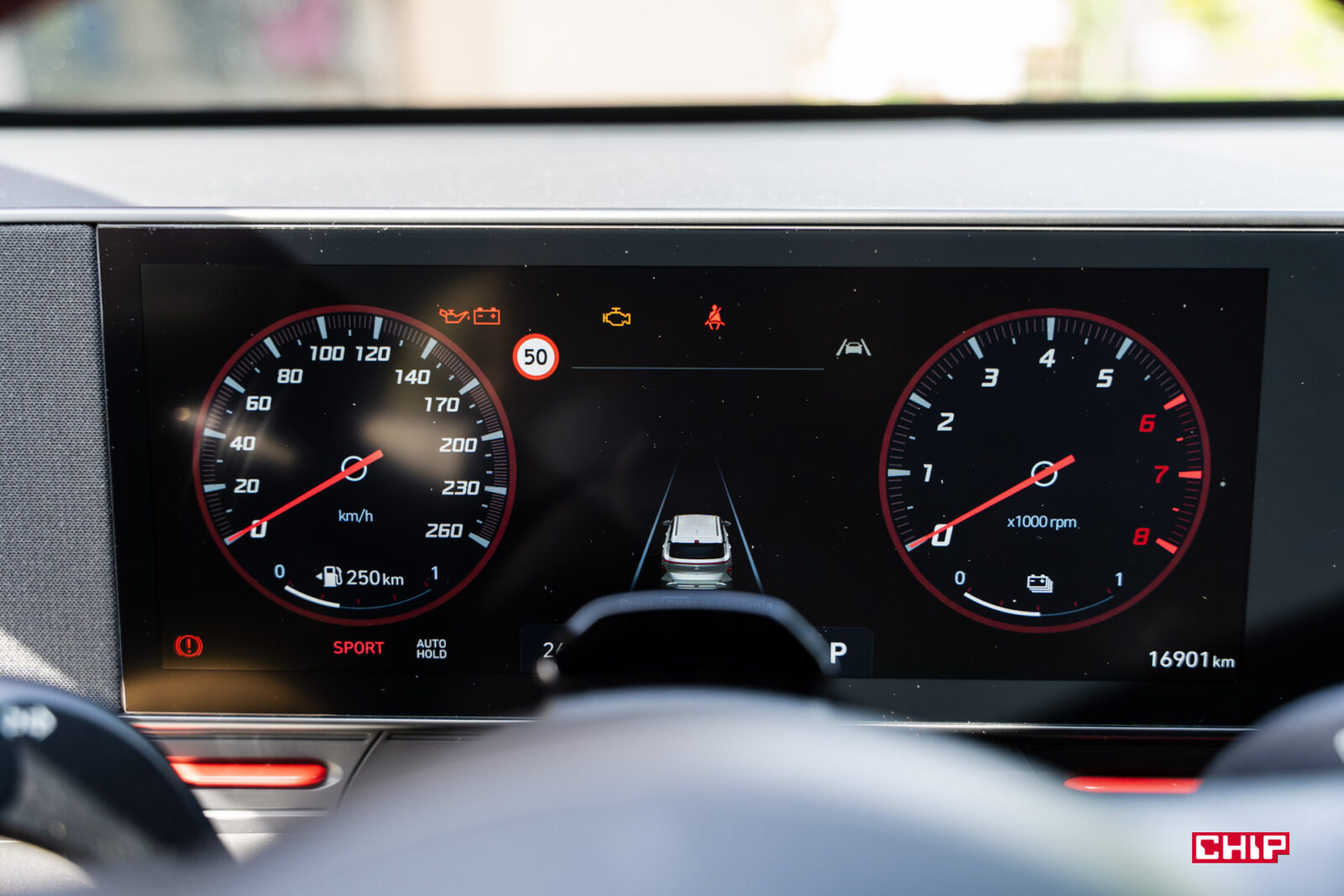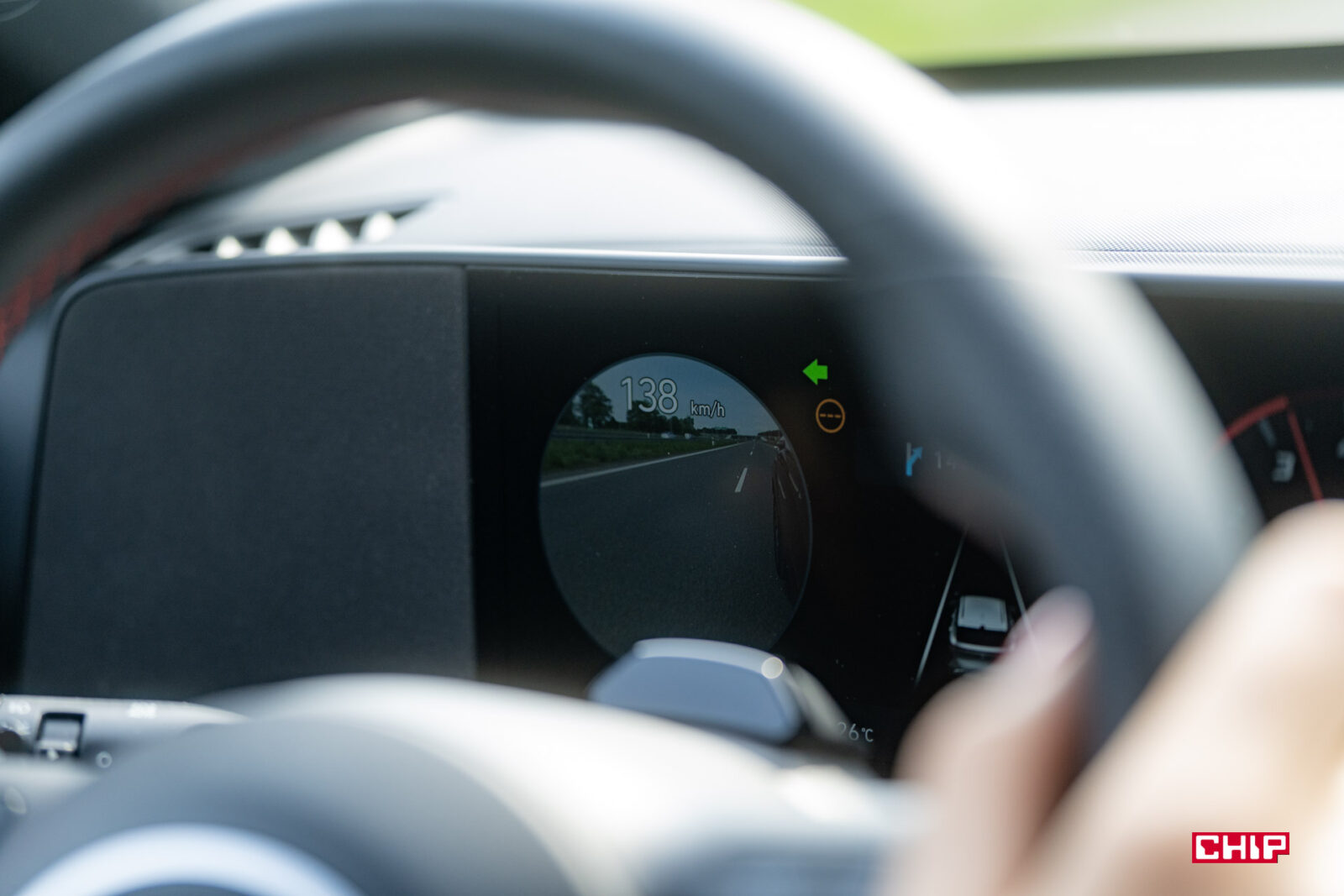 Na ekranie kierowcy mamy do wyboru kilka różnych widoków i ciekawe, bardzo praktyczne dodatki, charakterystyczne dla Hyundaia. Włączając kierunkowskaz zobaczymy obraz z kamery pokazujący martwe pole, co jest szalenie przydatną funkcją. Dodatkowo pojazd w martwym polu jest sygnalizowany, poza diodą na lusterku, wyraźnym symbolem na wyświetlaczu. Bezpieczeństwa nigdy dość.