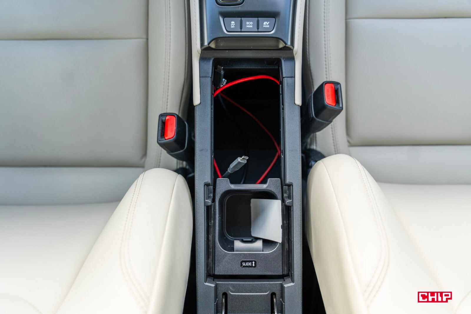 Technologicznie wyposażenie jest naprawdę niezłe, jak na przypomnijmy drugi wariant wyposażenia. Dostajemy dobrej jakości kamerę cofania, system monitorowania martwego pola, nawiewy klimatyzacji z tyłu oraz aż cztery porty USB-C (dwa z przodu i dwa z tyłu).