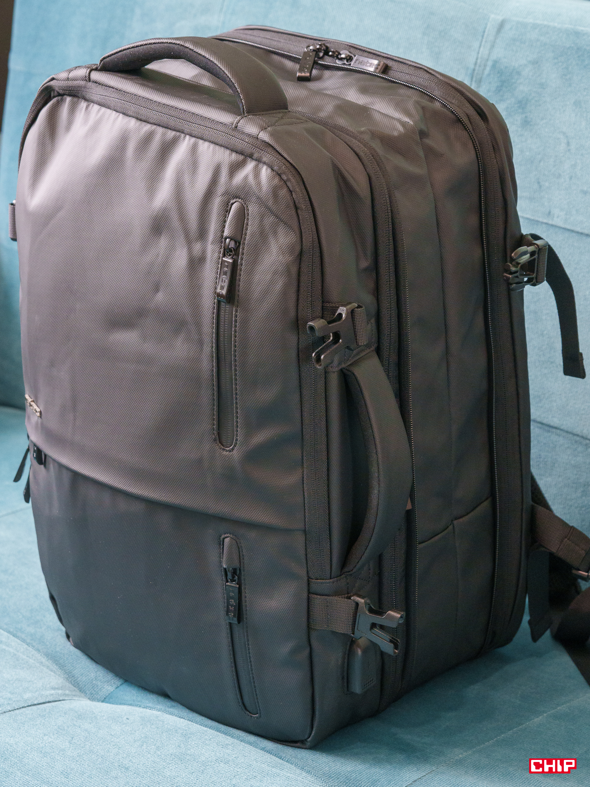 Plecak wykonany jest z gumowanej tkaniny poliestrowej 900D i ma rozmiary maksymalne 330×240×440 mm. 4 boczne paski z zatrzaskami utrudniają dostęp do komór osobom postronnym i zarazem ułatwiają utrzymanie gabarytów wypakowanego plecaka. Suwaki błyskawiczne wyglądają solidnie, są zabezpieczone przed wilgocią, a te przeznaczone dla komory laptopa mają dodatkowe kółka pozwalające na zabezpieczenie ich kłódką przed otwarciem.
