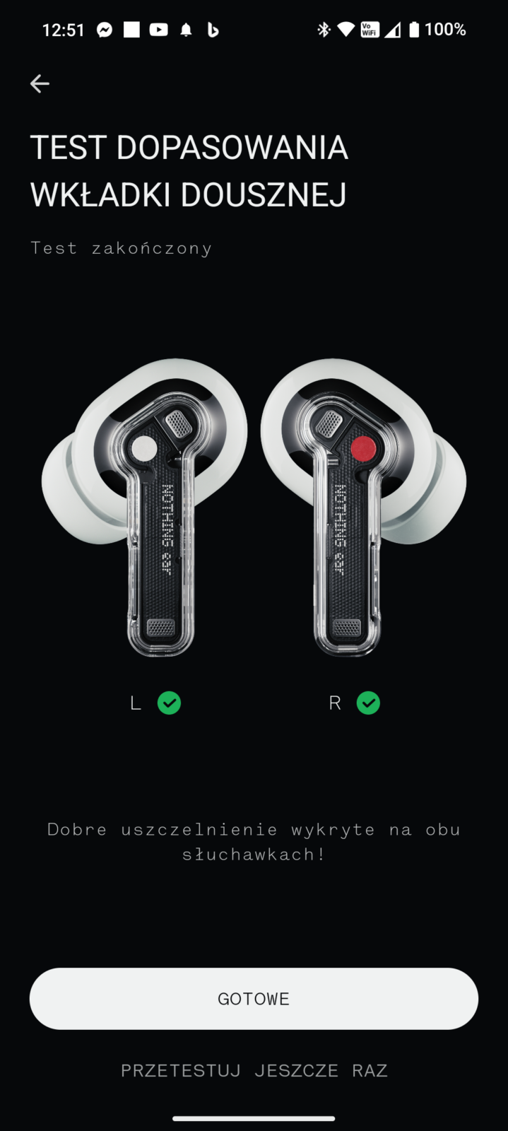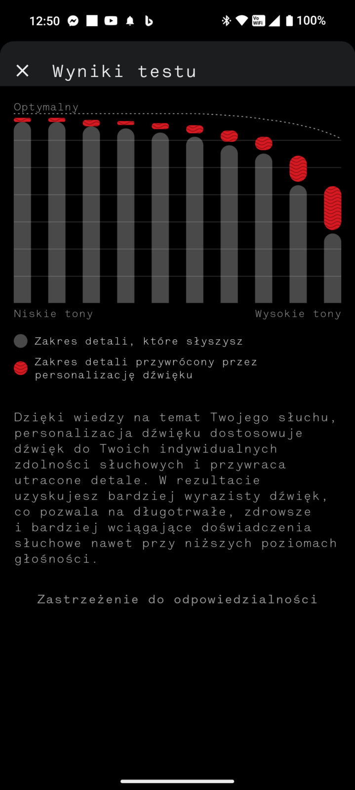 Bardzo ciekawą funkcją w oprogramowaniu Nothing Ear jest personalizacja dźwięku. Jest to rodzaj automatycznej korekcji, dobieranej na podstawie kilkuminutowego testu naszego słuchu, kompensującej wpływ wieku użytkownika – jak wiadomo, z upływem lat chrząstki układu słuchowego wapnieją i tracą elastyczność, zmniejszając pasmo przenoszenia i wrażliwość na wyższe tony. Spersonalizowany korektor wzmacnia osłabione częstotliwości i w ten sposób częściowo przywraca zamierzone brzmienie nagranych materiałów.