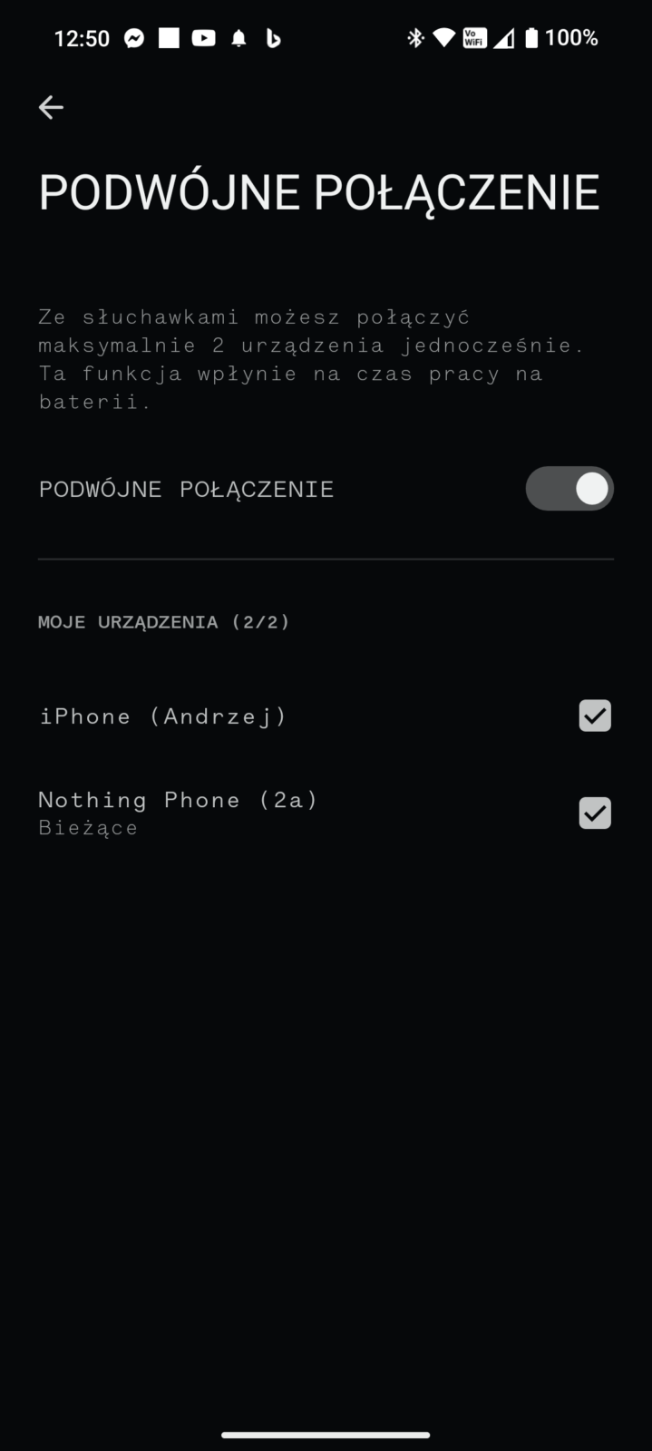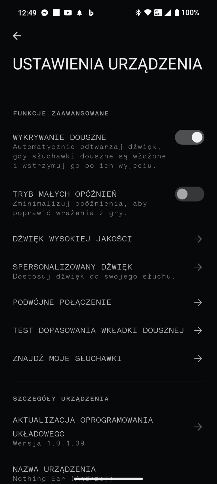 Trzeba jednak zaznaczyć, że instalacja Nothing X i dodatkowa konfiguracja jest w przypadku Nothing Ear właściwie obowiązkowa – bez niej nie wykorzystamy nawet połowy możliwości sprzętu. W szczególności dotyczy to możliwości pracy w trybie multipoint, którą należy włączyć w oprogramowaniu i wskacać z którymi urządzeniami ma działać, oraz wysokoprzepływnych kodeków Hi-Res Audio LDAC i LHDC 5.0, które dostępne są dopiero po aktywowaniu ich w oprogramowaniu – domyślnie słuchawki łączą się ze smartfonem przy użyciu SBC lub AAC.