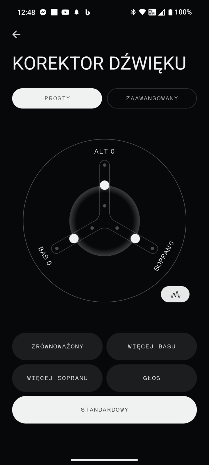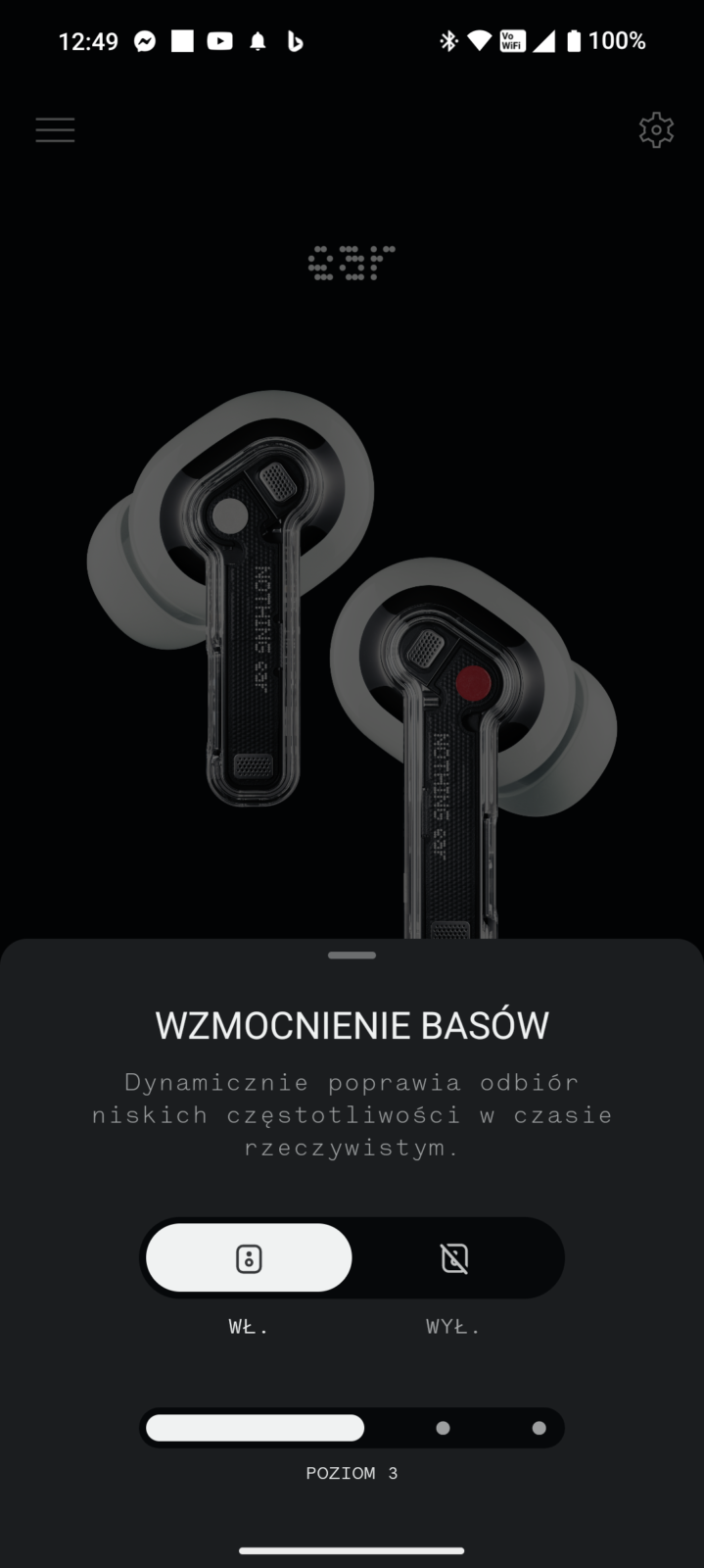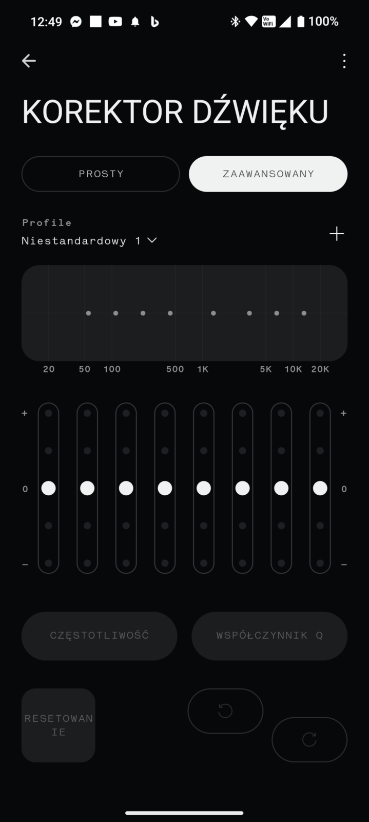 Z poziomu oprogramowania mamy też dostęp do filtru konturowego (wzmocnienie basów) o 5 stopniach podbicia (domyślnie aktywny jest poziom 3) oraz do korektorów dźwięku – w wersji podstawowej w formie prostego w użyciu koła z trzema regulatorami wpływającymi na barwę dźwięku. W wersji zaawansowanej jest to ośmiopasmowy korektor graficzno-parametryczny, więc z możliwością samodzielnego definiowania dla każdego regulatora pasma i współczynnika Q (szerokość pasma cięcia/wzmocnienia). O ile korektor w słuchawkach BT jest właściwie standardem, to tak zaawansowany, jak w Nothing Ear w TWS widzę bodaj pierwszy raz, przynajmniej w zbliżonej i nieco wyższej półce cenowej.