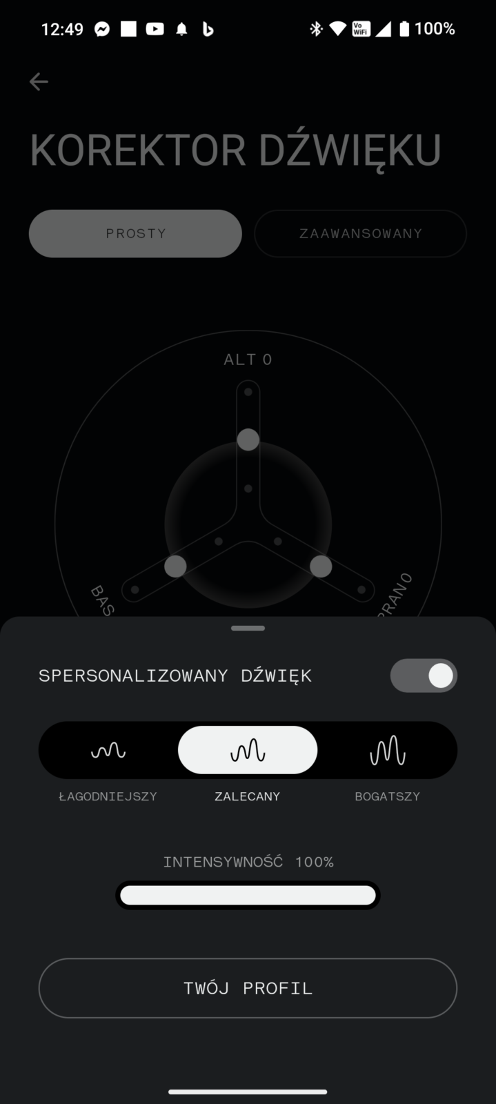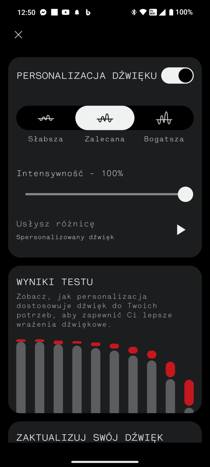Ponieważ wiek studencki mam już niestety dawno za sobą, sprawdziłem też personalizację dźwięku. Sam proces badania jest dość niewygodny, wymaga pełnej ciszy w okolicy, ale dobrana w ten sposób korekcja wydaje się całkiem przydatna i daje dobry efekt, szczególnie że można dostosować zarówno agresywność, jak i intensywność jej działania.