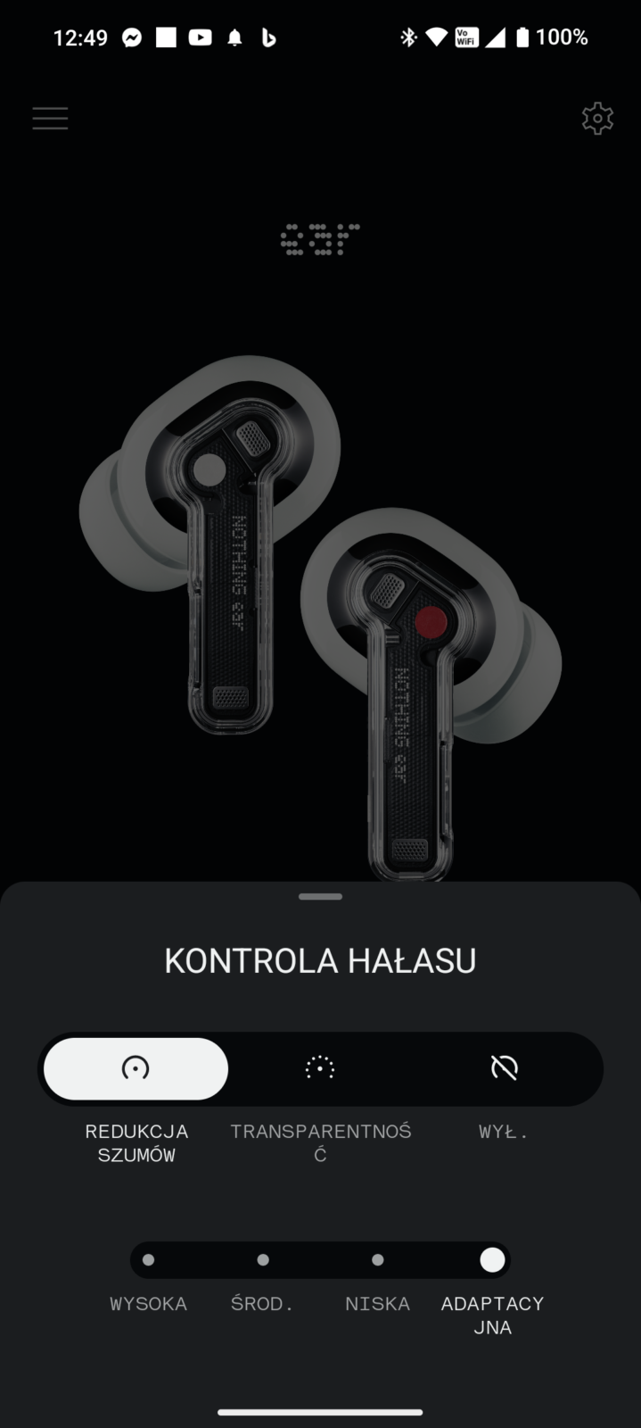 Trochę gorzej radzi sobie z mniej typowymi dźwiękami (gra na pianinie, głośna mechaniczna klawiatura), co plasuje sprawność ANC poniżej poziomu oferowanego choćby przez testowane niedawno (ale znacznie droższe) słuchawki Jabra Elite 10. Nothing Ear w swojej kategorii cenowej wypadają jednak doskonale. Korzystałem głównie z trybu adaptacyjnego ANC, który dobiera siłę redukcji hałasu do warunków i stopnia przenikania hałasu – do działania algorytmu dobierającego nie mam żadnych zastrzeżeń. Przydaje się także Smart ANC, który wykrywa niedopasowanie słuchawek do kanału usznego i odpowiednio wzmacnia w razie potrzeby działanie układu.