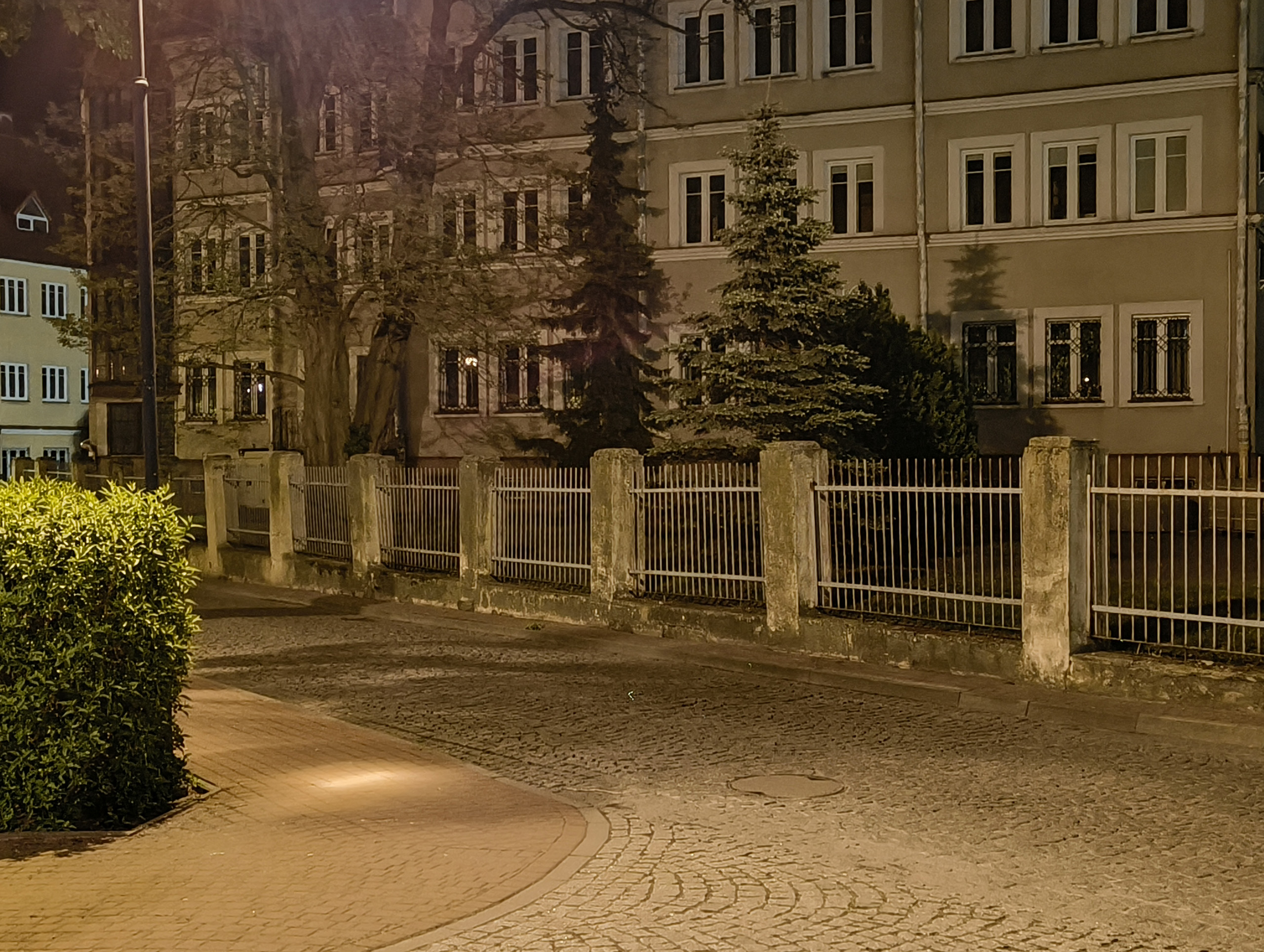 Okoliczności przyrody w ostatnich tygodniach nie sprzyjały nocnym wypadom, stąd niewielka ilość sampli. Te, co są, wypadły jednak zaskakująco dobrze, także, jeśli chodzi o mniej szczegółowy ultraszeroki kąt i crop-zoom ×2. Szczegółowość zdjęć jest na dobrym poziomie, szum i artefakty są nieźle kontrolowane, z wyjątkiem flar, na które oba aparaty okazały się niestety bardzo podatne