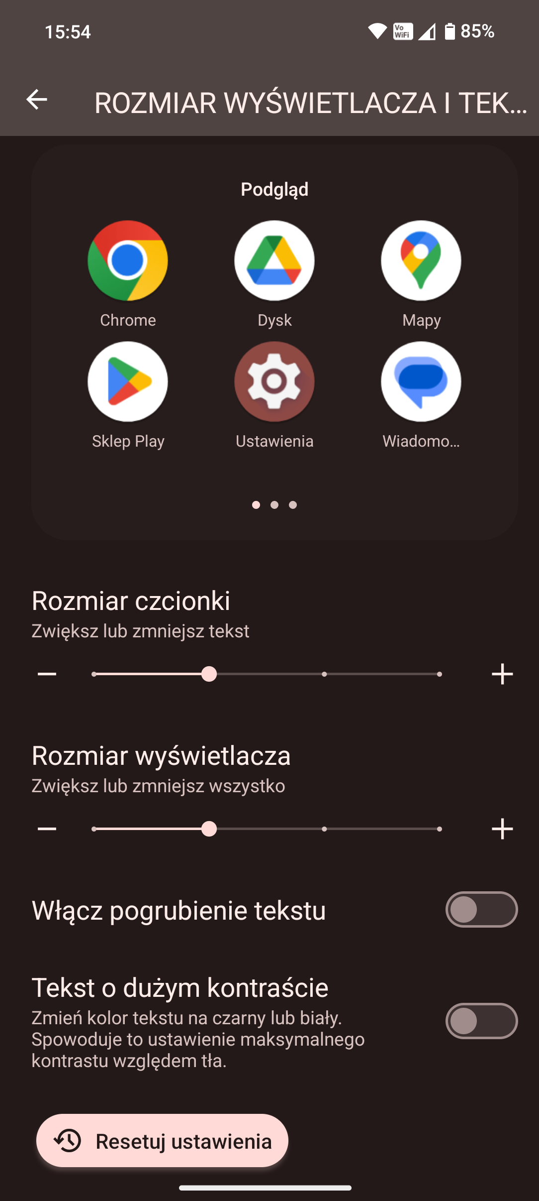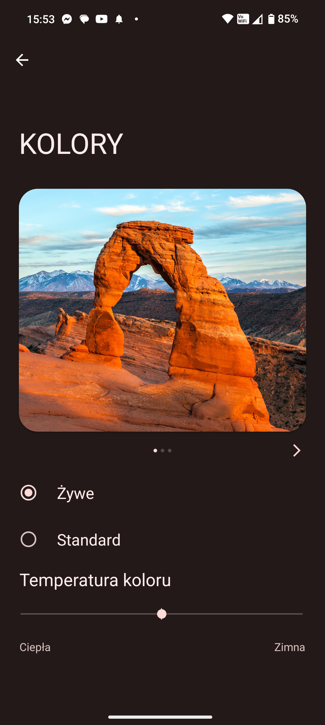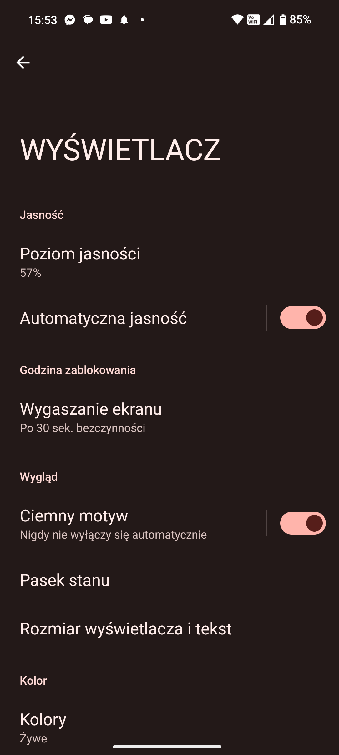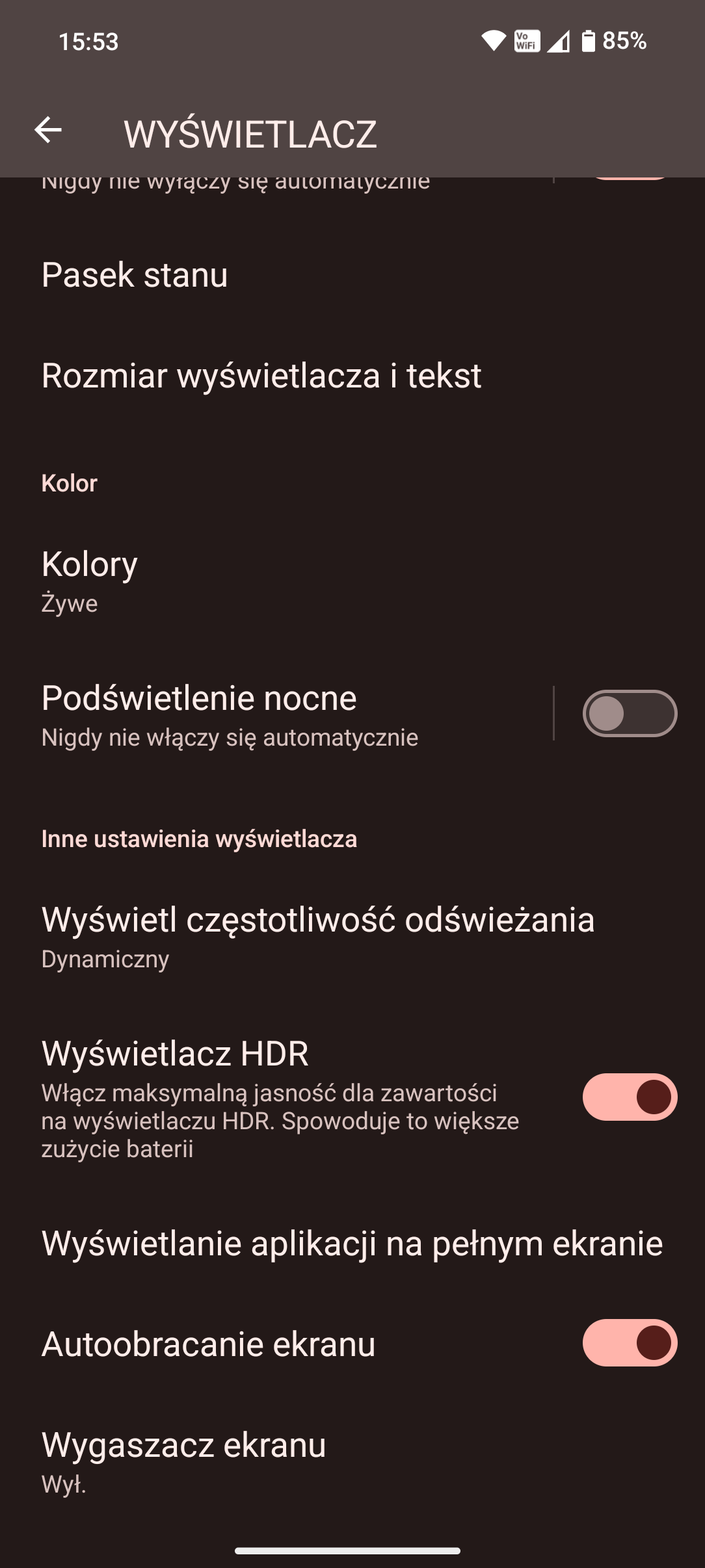 Jeśli chodzi o reprodukcję kolorów, to w ustawieniach panuje klasyka bez fajerwerków: ustawienie standardowe to odpowiednik przestrzeni barwnej sRGB, a domyślne żywe odpowiada P3, dla każdego z nich aktywny jest suwak pozwalający na bezstopniowe dopasowanie temperatury barwowej bieli. Z racji braku odpowiedniego kolorymetru nie weryfikowałem, jak dobrze ekran jest skalibrowany fabrycznie, lecz nie mam większych zastrzeżeń do tego, co widać na ekranie – jak na średnią półkę obraz wygląda naprawdę bardzo dobrze. Podobnie nie weryfikowałem deklaracji producenta dotyczącej deklarowanej jasności ekranu (700 nit standard, 1100 nit HBM, 1300 w szczycie), lecz z badań GSMArena wynika, że rzeczywiste wartości są zbliżone, lecz nieco niższe od deklaracji. Regulacja jasności przebiega z użyciem techniki PWM, ale o tak wysokiej częstotliwości (2160 Hz), że nie ma szansy zauważyć związanego z tym migotania.