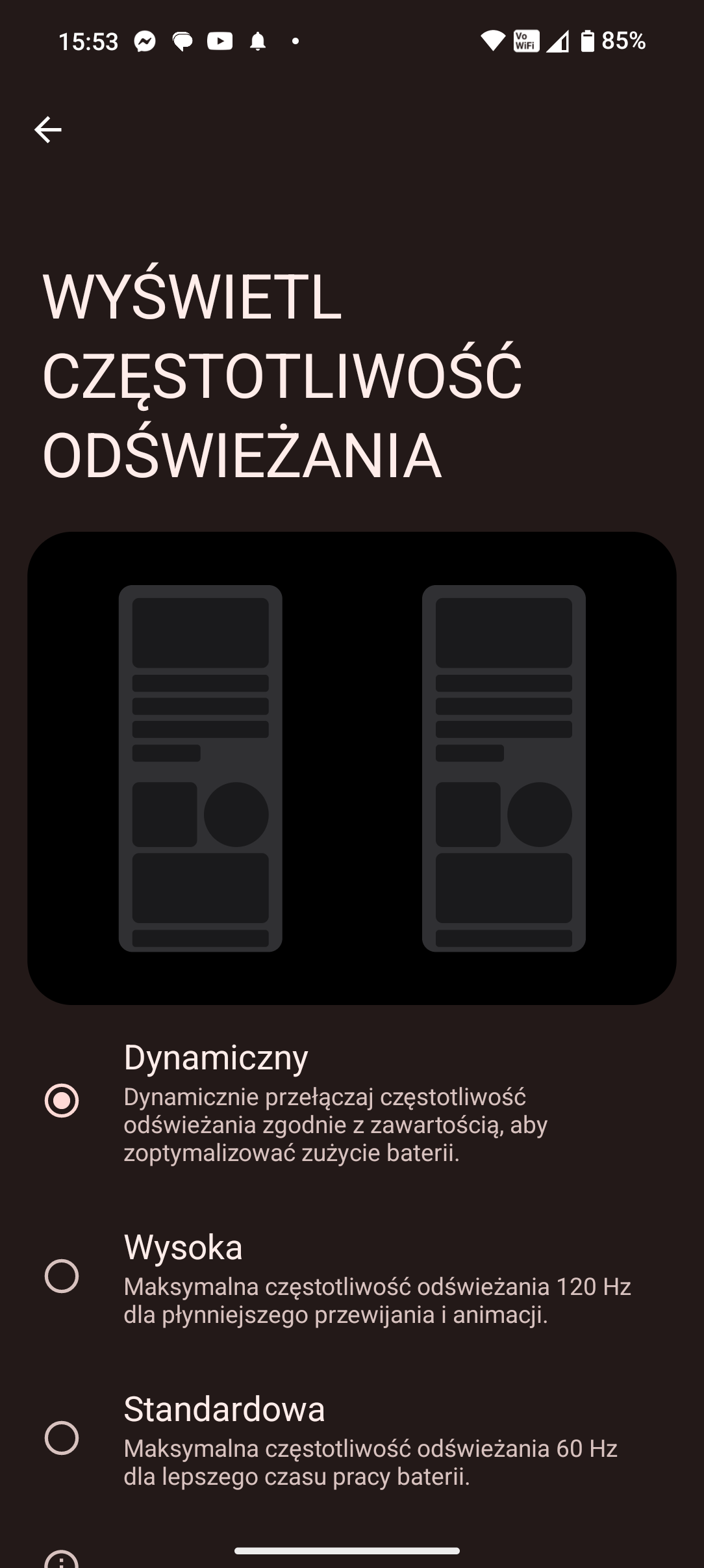 Maksymalna częstotliwość odświeżania ekranu wynosi 120 Hz – dostępne są trzy ustawienia: standardowe, w którym na stałe wynosi 60 Hz, oraz wysokie i dynamiczne, w obu trybach odświeżanie może być dobierane między 30, 60, 90 a 120 Hz, lecz różnią się tym w jaki sposób – przy ustawieniu wysokim z reguły będzie to 120 Hz, chyba że aplikacja ma inne wymagania, a z kolei przy dynamicznym oprogramowanie będzie próbowało wyważyć płynność obrazu i oszczędność energii, częściej więc będzie można zobaczyć pośrednie 90 Hz. W praktyce, podczas testów używałem właśnie ustawienia dynamicznego, które sprawdza się zupełnie dobrze.