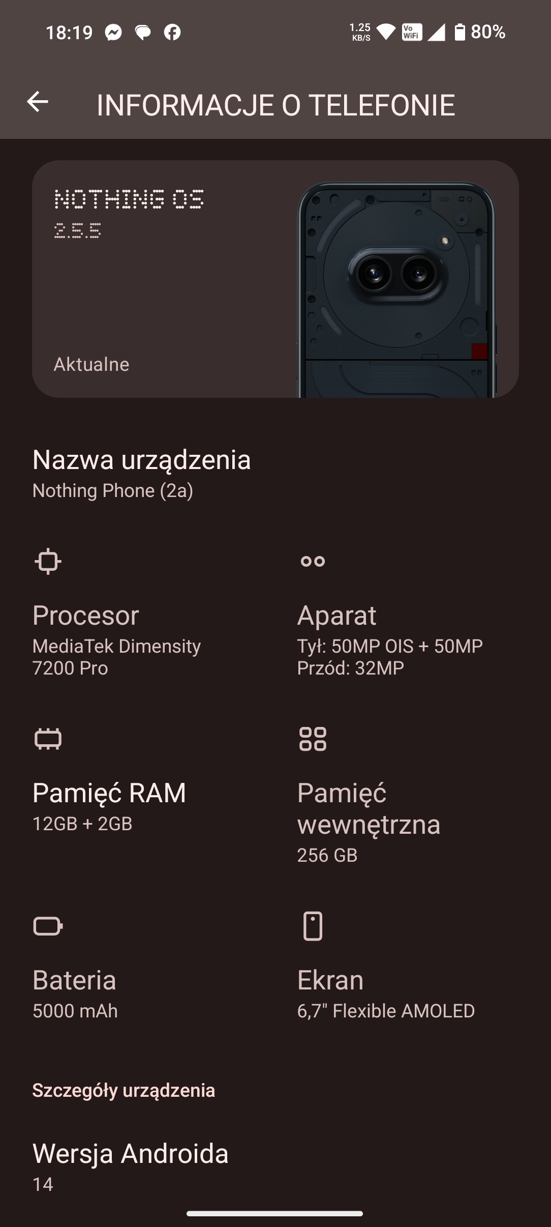 Nothing Phone (2a) wyposażony został w specjalną wersję SoC, układ MediaTek Dimensity 7200 Pro. Towarzyszy mu, w zależności od wersji, 8 lub 12 GB pamięci operacyjnej i 128 lub 256 GB pamięci flash – sztuka testowa była najbardziej rozbudowanym wariantem.