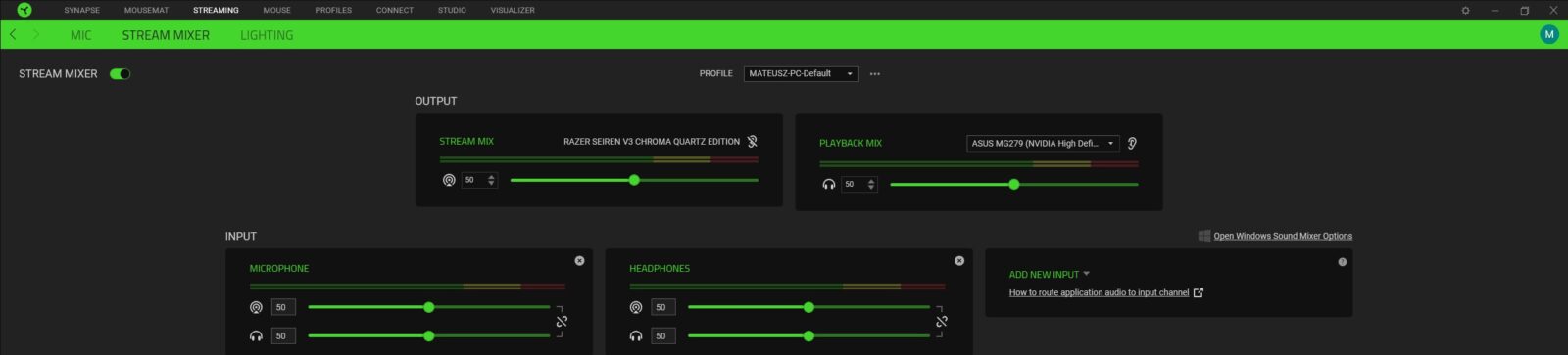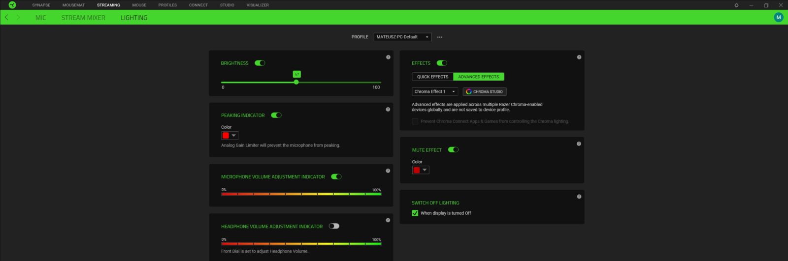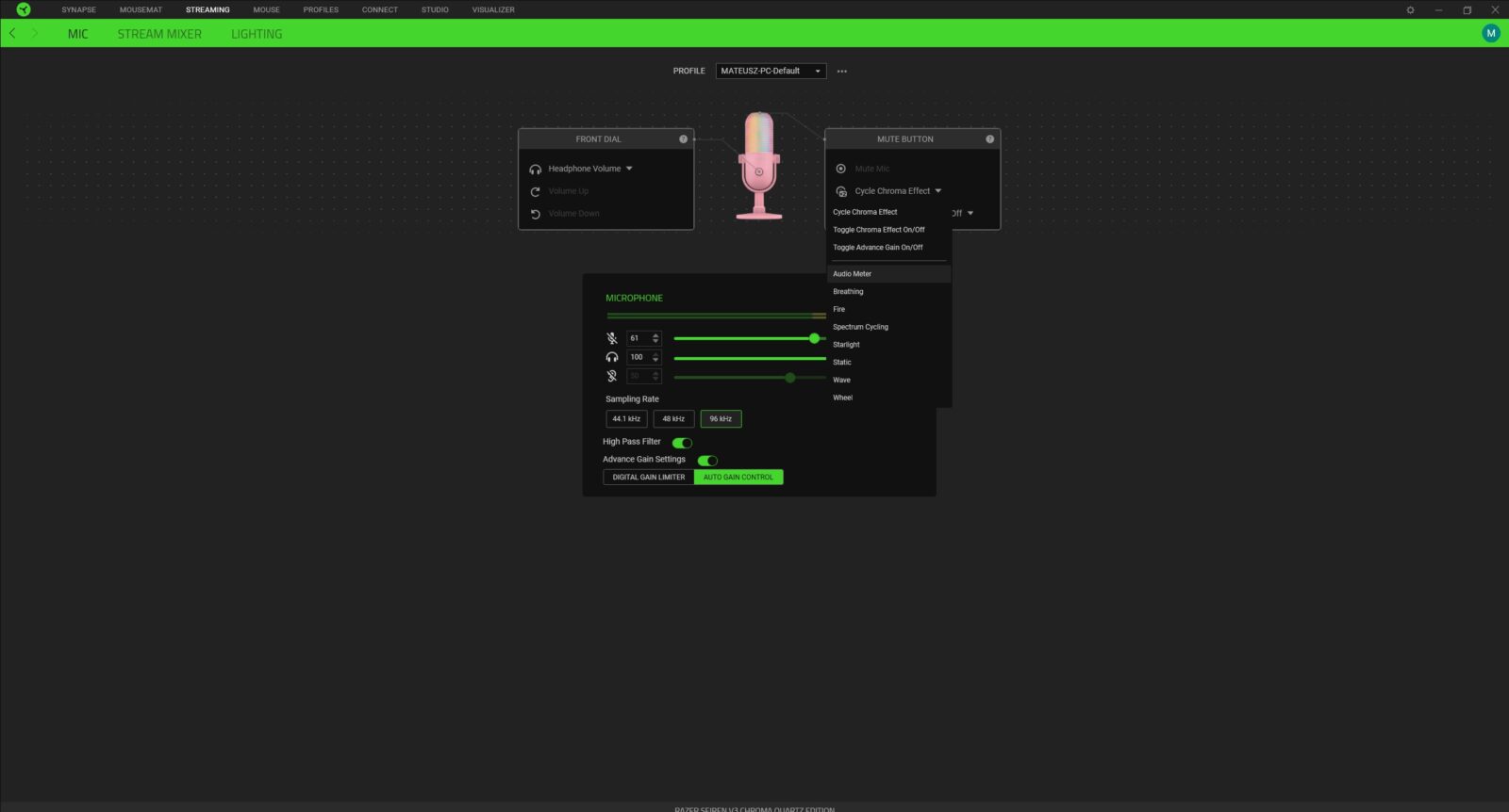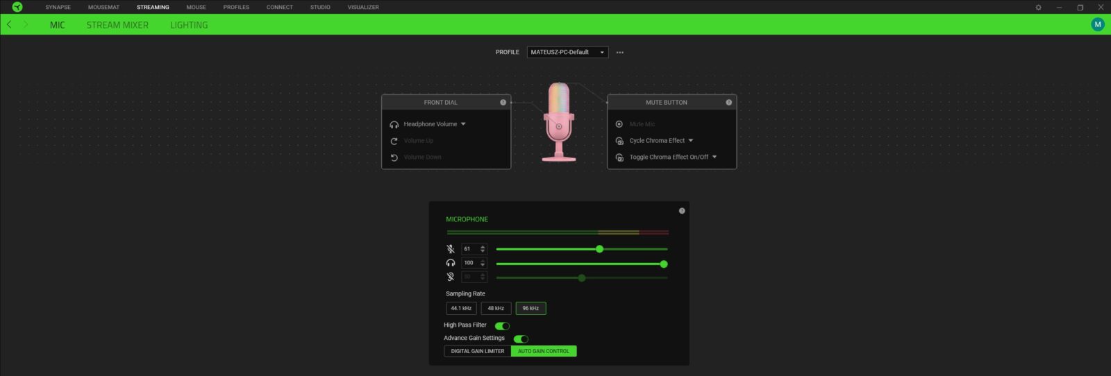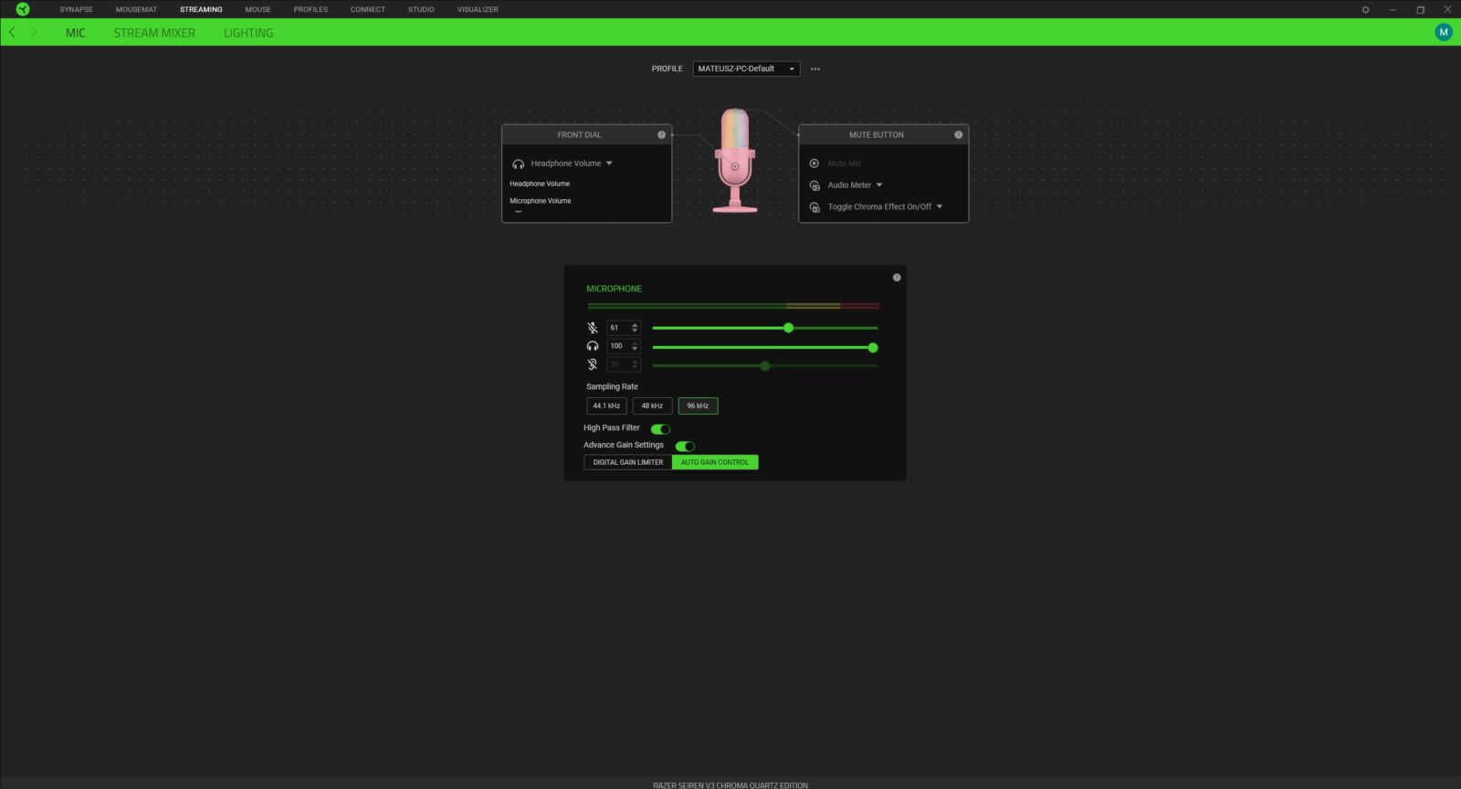 Jako że mikrofon Razer Seiren V3 Chroma doczekał się głównie opcji związanych z samym brzmieniem w aplikacji Razer Central, warto sprawdzić je bezpośrednio na nagraniu. Zwłaszcza że obejmują one możliwość aktywacji filtru górnoprzepustowego (to ten, który przepuszcza częstotliwości sygnału powyżej określonego punktu odcięcia, jednocześnie tłumiąc te poniżej) oraz zaawansowanych ustawień co do czułości. Poza tym możecie wskazać częstotliwość próbkowania (44,1 kHz, 48 kHz i 96 kHz), ustawić funkcjonalność przycisku dotykowego i pokrętła na przodzie, dostosować poziom głośności podpiętych słuchawek i natężenie odsłuchu czy ustawić podświetlenie pod siebie. Zastosowane diody RGB nie tylko robią świetną robotę w aspekcie wizualnym, ale też pełnią rolę funkcjonalną, bo mogą informować nas o aktualnym poziomie czułości, mówieniu zbyt głośno i wyciszeniu mikrofonu.