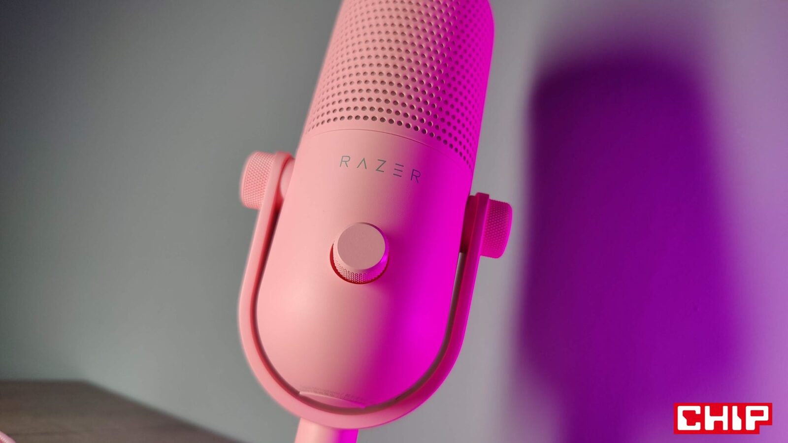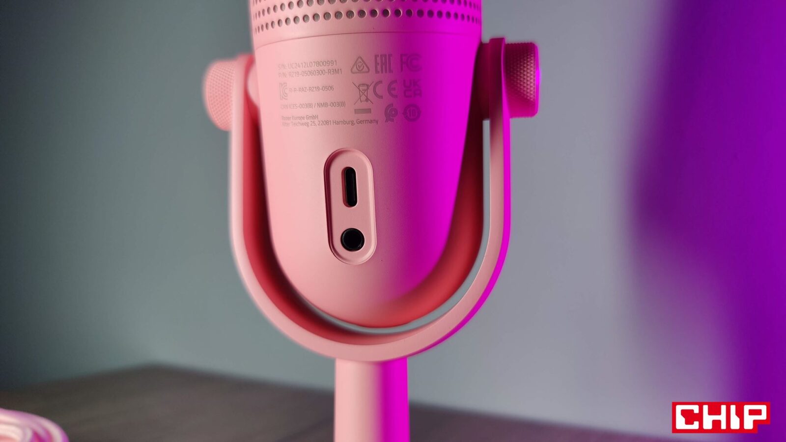 Poza tym Razer umieścił z tyłu mikrofonu port USB-C (zasilanie i transfer) i jack 3,5 mm (pass-through dla słuchawek np. na odsłuch), z przodu zamieścił swoją nazwę w kolorze szarym, który świetnie łączy się z różowym oraz postanowił ograniczyć ruch mikrofonu w widełkach za sprawą gumowych wkładek, których stabilność podbijamy wspomnianymi śrubami regulującymi po każdej ze stron.