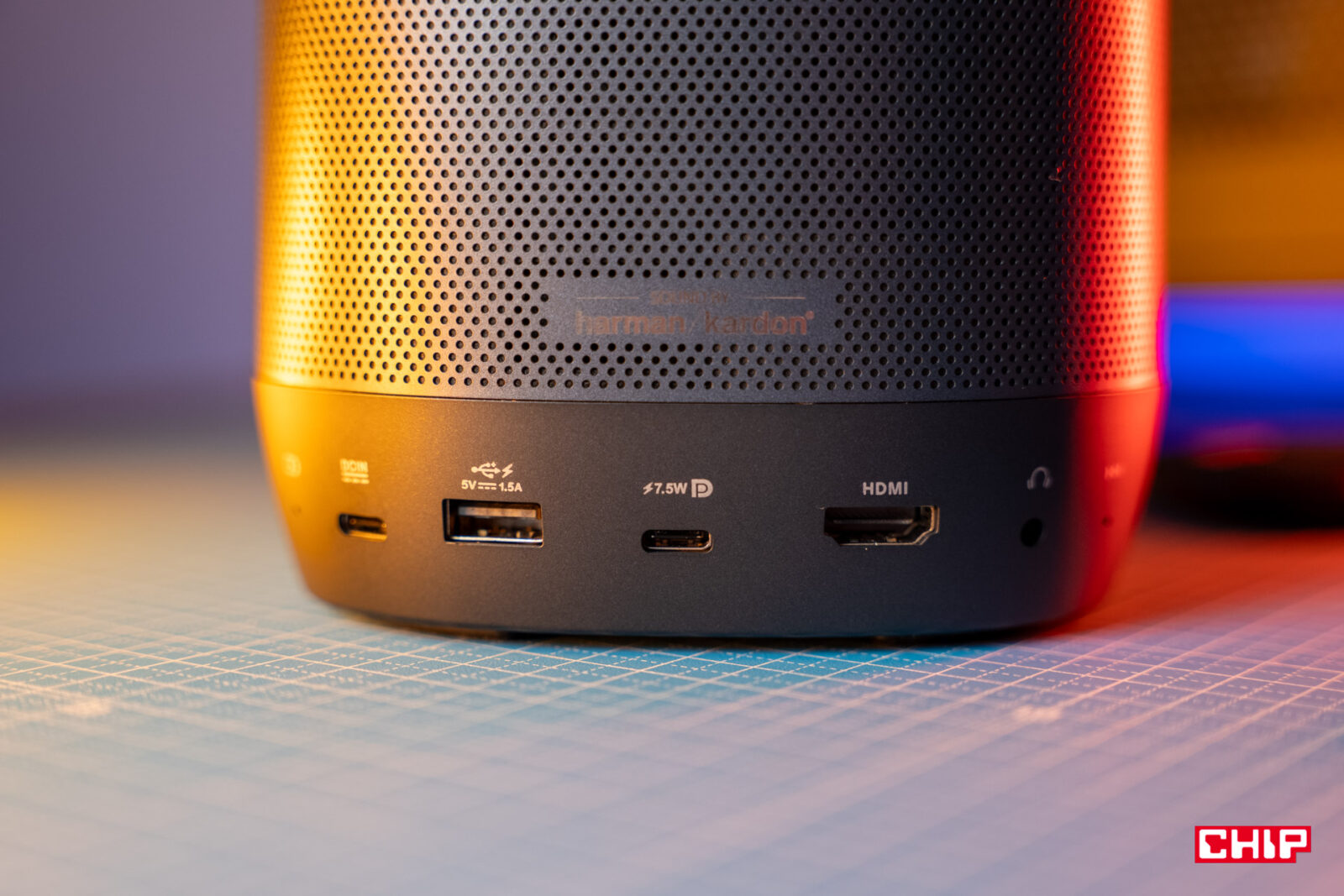 Konstrukcja projektora Asus Zenbeam L2 jest zwarta i solidna. Soczewka jest odpowiednio zagłębiona w obudowie, którą wykonano z jednego kawałka tworzywa przebitego niewielkimi otworami. Przyciski kontrolne u góry klikają całkiem przyjemnie jak na dodatkowy, doczepiany magnesem moduł. Włącznik znajduje się z tyłu, z kolei najważniejsze porty w podstawie. Zestaw jest całkiem przyzwoity – oprócz USB-C do ładowania całości znajdziemy USB-A i USB-C z mocą ładowania do 7,5W. Ten drugi port obsługuje DisplayPort. Skorzystamy także z HDMI, a do odsłuchu dźwięku wykorzystamy złącze mini-jack.