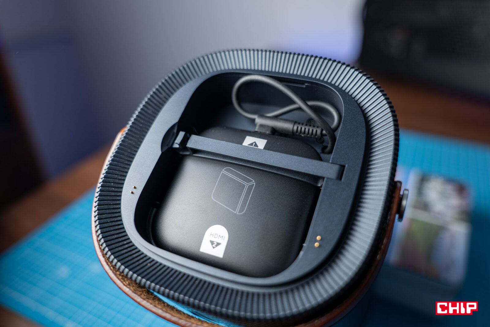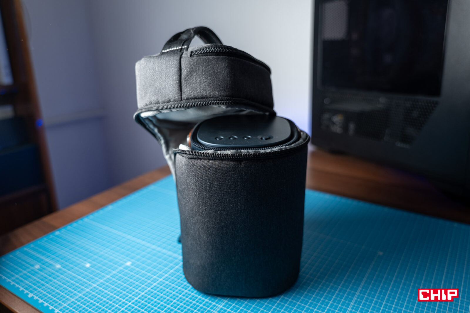 Całość uzupełnia solidna, zszyta w miejscu chwytu, rączka. Do kompletu wrażeń brakuje tylko zapięć, dzięki któremu moglibyśmy przerzucić projektor przez ramię. I bez tego etui uważam za ogromny plus zestawu. Dzięki niemu przenoszenie całości jest o wiele wygodniejsze i bezpieczniejsze dla trwałości.