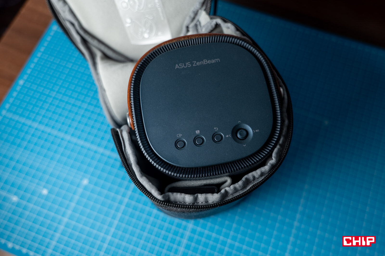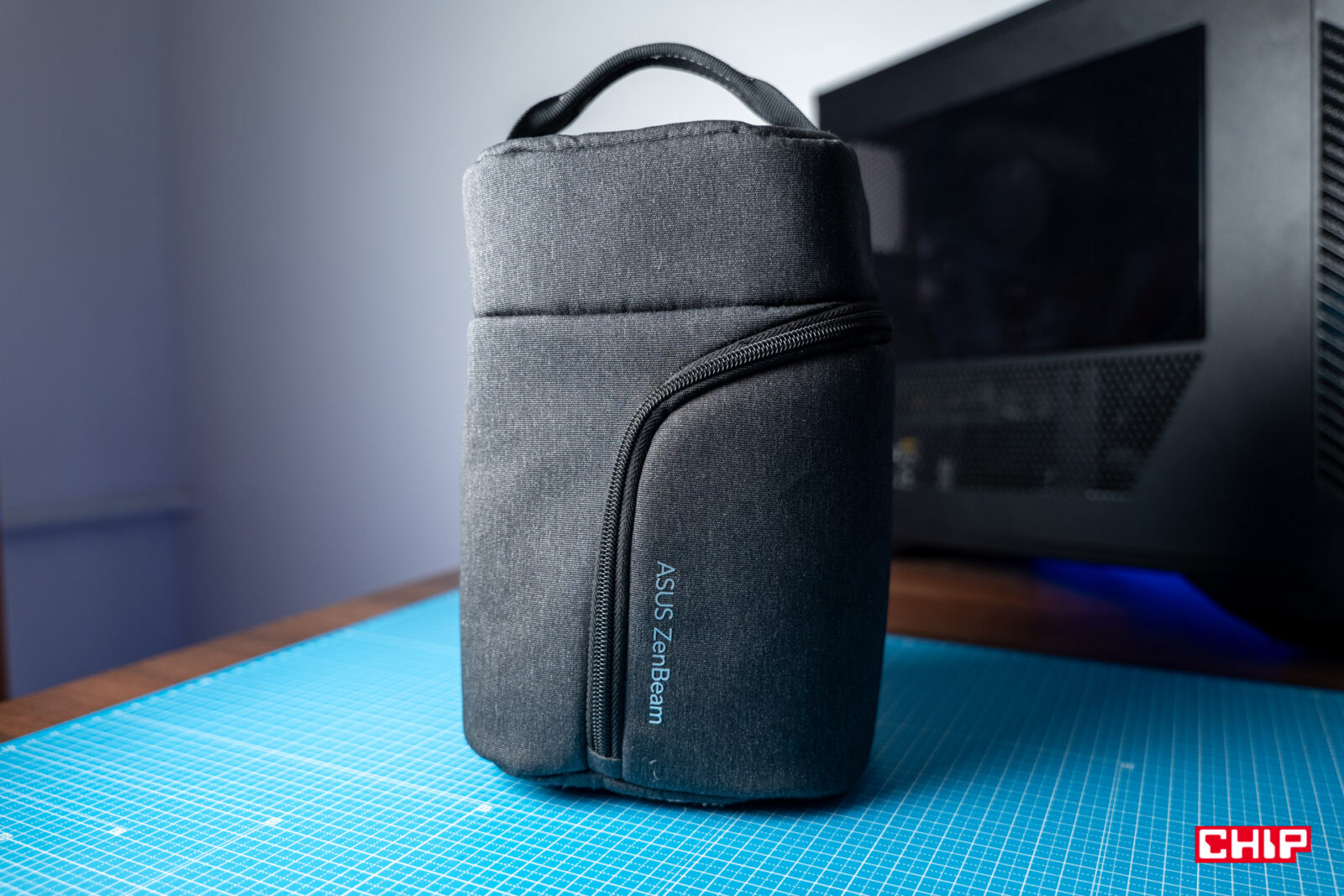 W przypadku mobilnych projektorów niemal tak ważne jak samo urządzenie jest to, jak będzie ono zabezpieczone. W tym miejscu muszę pochwalić Asusa za wykonanie świetnej pracy z etui, jakie zostało dołączone do zestawu. Znajdziemy w nim kieszonkę na pilota oraz wystarczającą przestrzeń w górnej części, by zmieścić tam zasilacz o mocy 90W z USB-C i dodatkowe baterie do pilota. Z kolei w centralnej części z rozpinanym zamkiem zamkniemy nasz projektor. Obicie wewnątrz etui jest miękkie i nie ma ryzyka uszkodzenia lampy. Z kolei z zewnątrz znajdziemy tkaninę odporną na przetarcia i o twardszej strukturze.