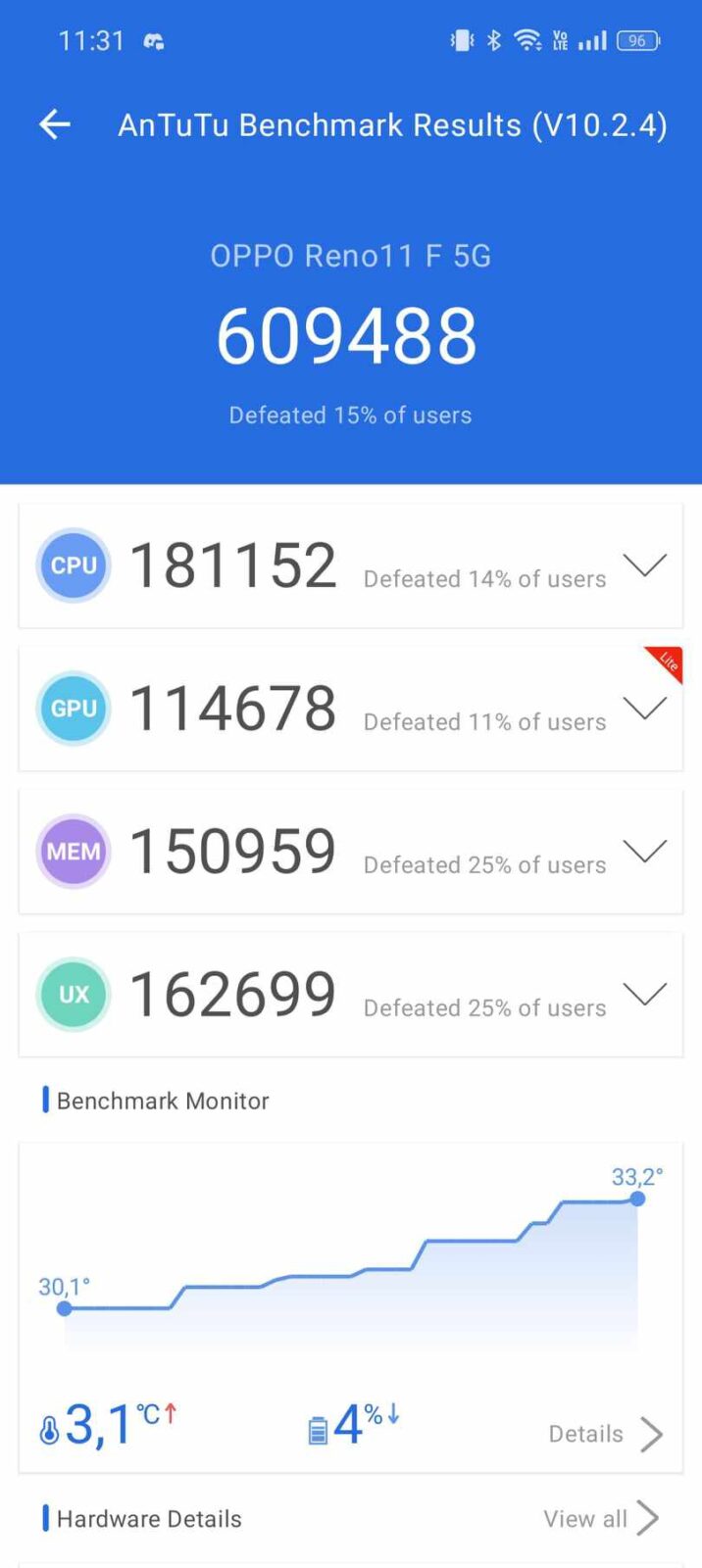 Czy to oznacza, że na Oppo Reno 11 F 5G nie da się grać? A skądże znowu. Większość tytułów zoptymalizowano właśnie pod takie średniopółkowe specyfikacje. Spodziewajcie się obsługi średnich ustawień graficznych bez większych przycięć i rozsądnej płynności przy niskich ustawieniach. Raczej nie skorzystacie z potencjału 120 Hz, bo gry maksymalnie mogą osiągać 60 klatek. Na pocieszenie warto wspomnieć o tym, że urządzenie niespecjalnie się grzeje. Układ graficzny Mali-G68 MC4, nawet gdy jest ciepły, nie czyni obudowy gorącą.
