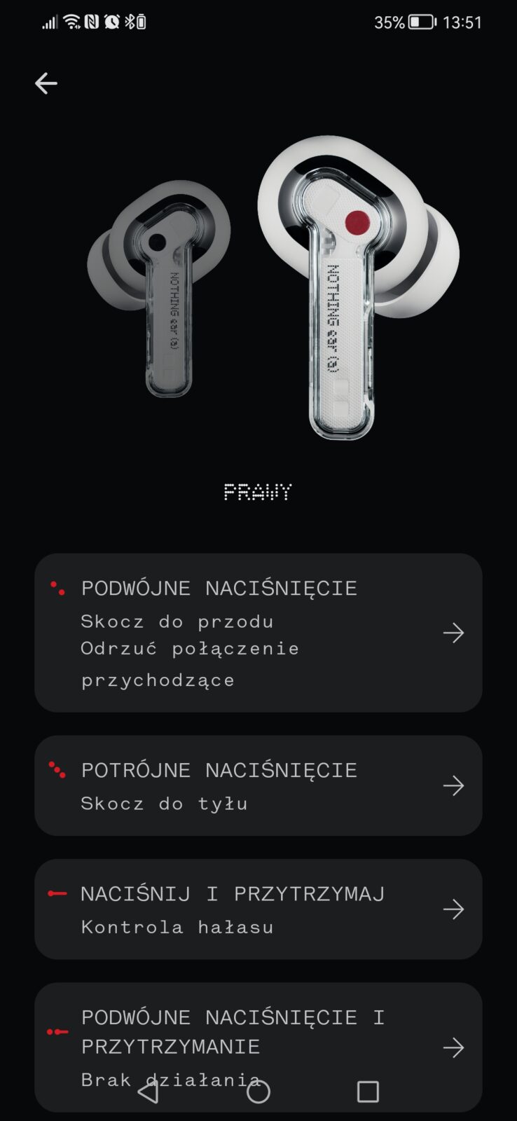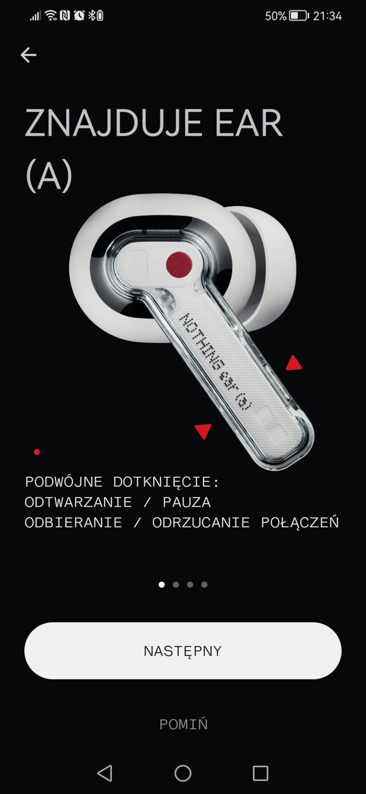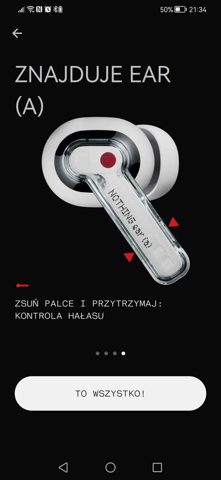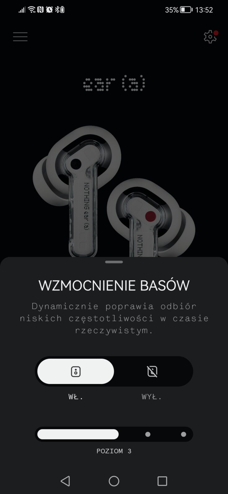 W celu pełnego wykorzystania potencjału, jaki dają słuchawki Nothing ear (a), należy pobrać aplikację Nothing X. Co ciekawe – bez niej nie byłem w stanie sparować słuchawek z telefonem. A gdy już zostaną sparowane, mamy praktycznie kontrolę nad wszystkim, zaczynając od brzmienia, kończąc na poziomie redukcji hałasu. Interfejs użytkownika jest banalnie prosty w obsłudze i nawet osoba, dla której są to pierwsze słuchawki bezprzewodowe w życiu, będzie sobie w stanie ze wszystkim poradzić. Na dowód zrzuty ekranów.