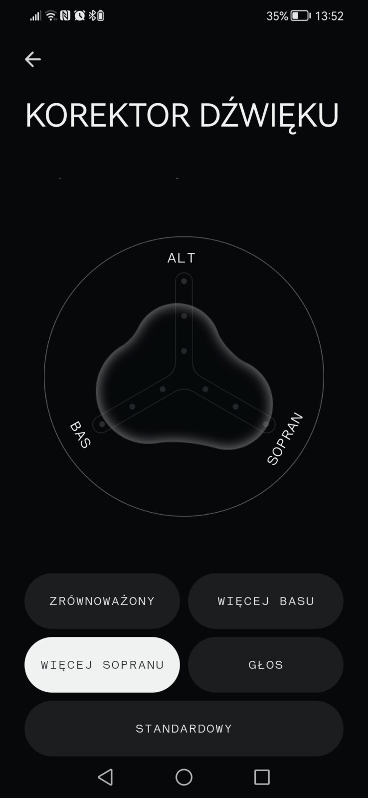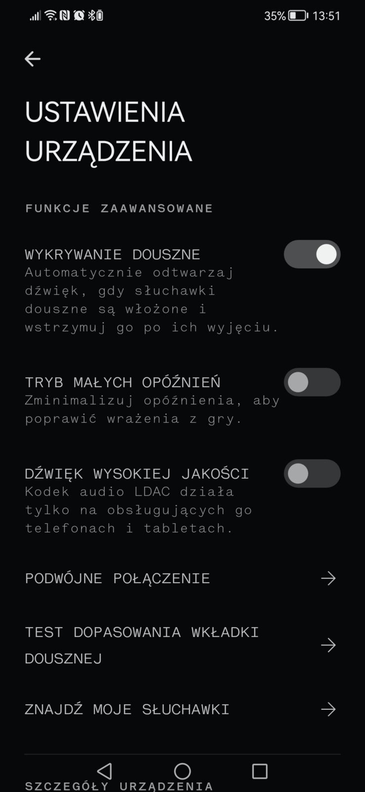 Muszę przyznać, że same ustawienia standardowe są na tyle dobre, że nikt nie powinien mieć większych zastrzeżeń. Oczywiście takie uniwersalne można jeszcze podrasować pod kątem specyficznych treści. Na przykład słuchając audiobooka warto przełączyć się na “Głos” w korektorze, a jeśli lubisz muzykę, gdzie wyraźnie słychać bas, wówczas jego podbicie może podnieść komfort relaksu przy ulubionych dźwiękach. Duże zalety to możliwość sparowania słuchawek z dwoma urządzeniami, opcja “Znajdź moje słuchawki” oraz “Wykrywanie douszne”.