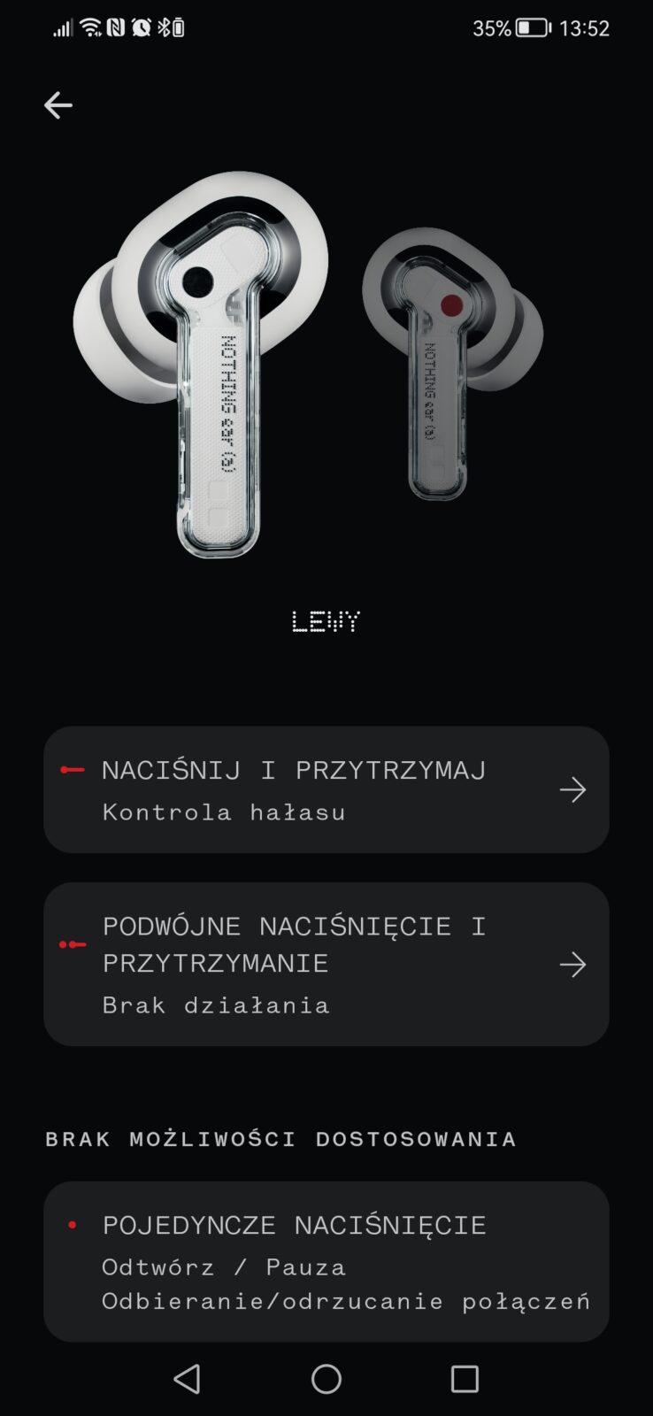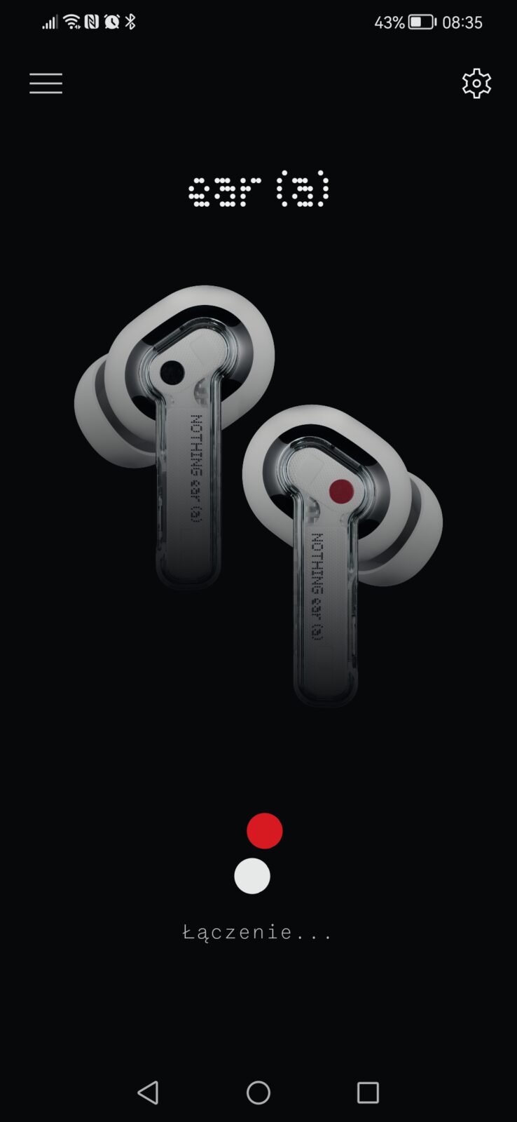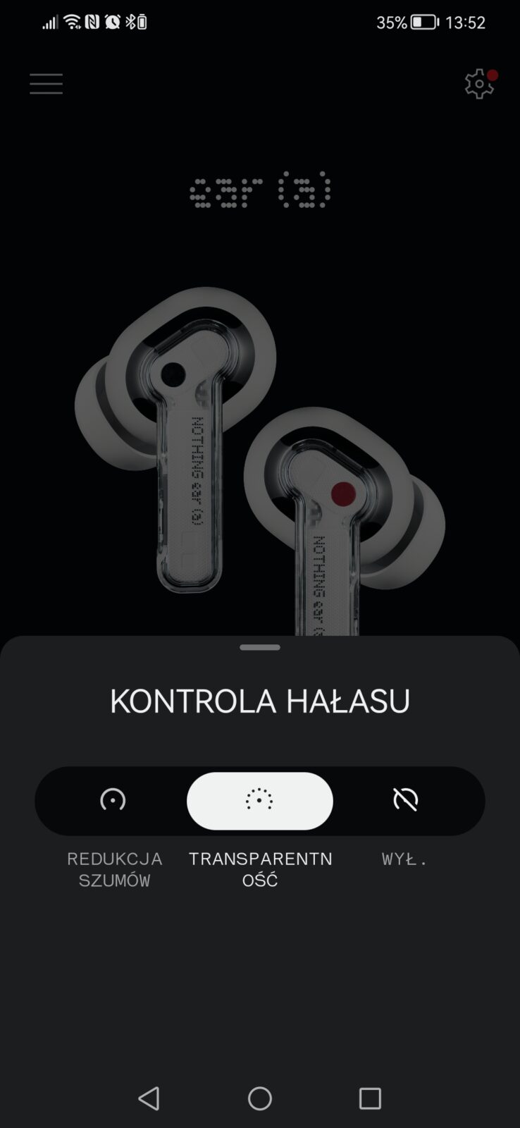 W poprzednio testowanych przez mnie słuchawkach Jabra Elite 5 przy ich uruchamianiu pokazywał mi się procentowy stan naładowania baterii i każdej słuchawki z osobna. Przy Nothing ear (a) pojawia się tylko informacja o tym, które słuchawki działają i tyle. Aby sprawdzić poziom naładowania każdej należy wejść dopiero do Nothing X, co jest absolutne niepotrzebne, jeśli wszystkie ustawienia zostały wcześniej ustalone.