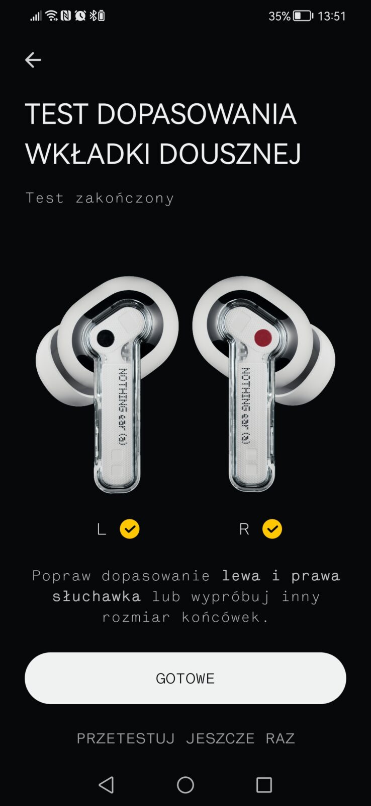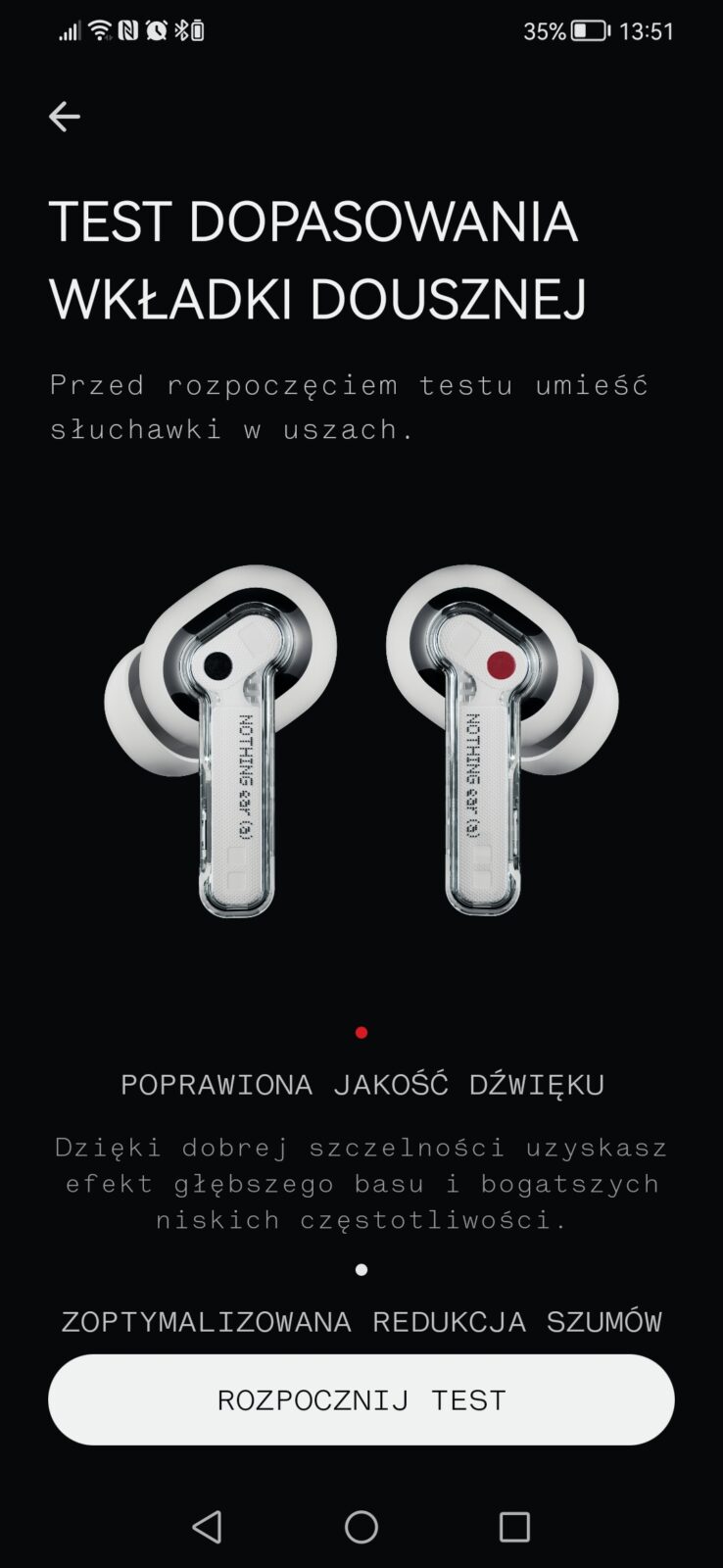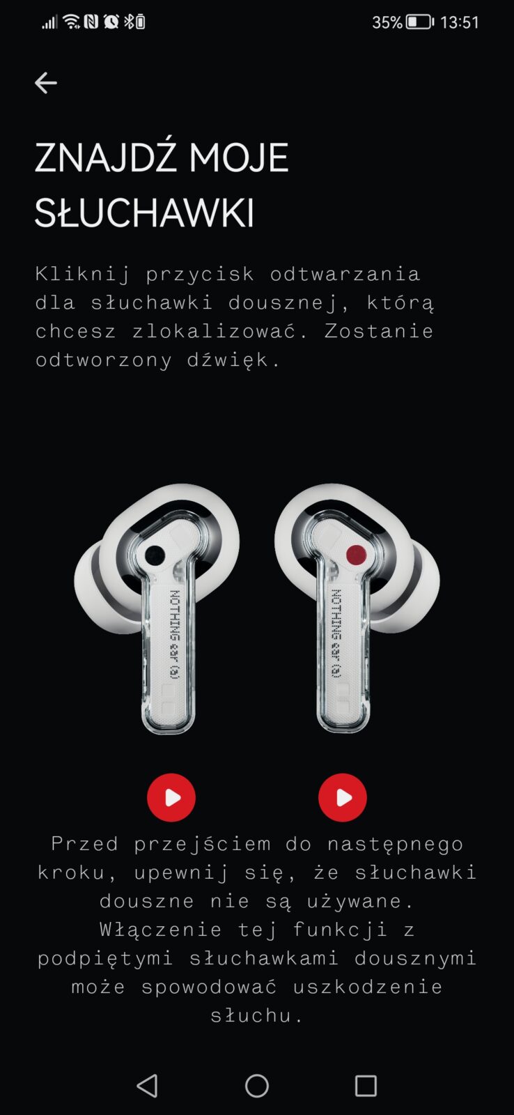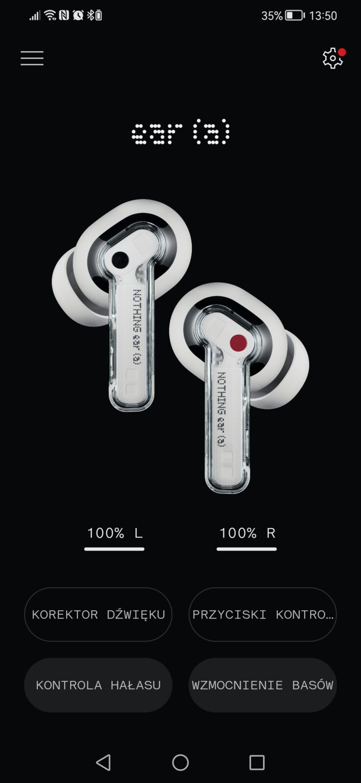 W poprzednio testowanych przez mnie słuchawkach Jabra Elite 5 przy ich uruchamianiu pokazywał mi się procentowy stan naładowania baterii i każdej słuchawki z osobna. Przy Nothing ear (a) pojawia się tylko informacja o tym, które słuchawki działają i tyle. Aby sprawdzić poziom naładowania każdej należy wejść dopiero do Nothing X, co jest absolutne niepotrzebne, jeśli wszystkie ustawienia zostały wcześniej ustalone.