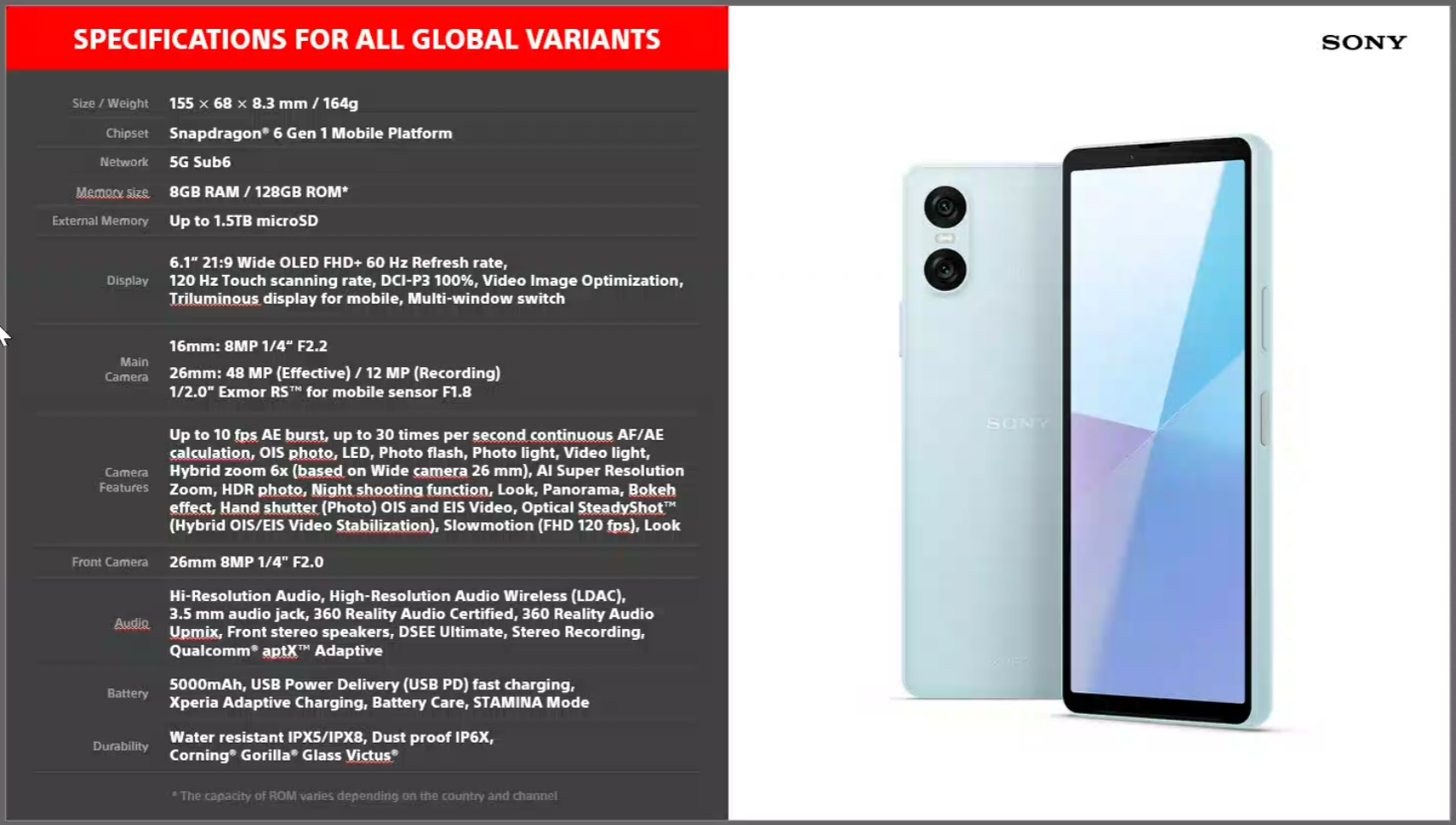 Xperia 10 VI jest najprostszym i najtańszym modelem w rodzinie. Waży zaledwie 164 gramy, ma przekątną ekranu 6,1″, klasyczne dla Xperii kinowe proporcje 21:9, a mocy obliczeniowej dostarcza jej SoC Snapdragon 6 Gen 1 wsparty 8 GB pamięci RAM. Smartfon ma jeden wariant pamięciowy, 128 GB, ale także i tu dostępną przestrzeń można rozbudować za pomocą karty pamięci microSDCX. Zestaw aparatów fotograficznych składa się z dwóch urządzeń – główny posiada matrycę Exmor RS o rozmiarze 1/2″ i rozdzielczości 48 Mpix, współpracującą ze stabilizowanym obiektywem 26 mm f/1.8, a dodatkiem do niego jest apart szerokokątny 8 Mpix, z matrycą 1/4″ i obiektywem 16 mm f/2.2.